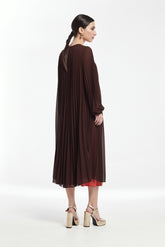 Capa fluida en gasa plisada con cuello redondo y cinta para atar. Largo midi. Atura modelo 1,70 cm- €82,00