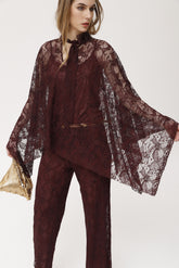 Capa de encaje confeccionada en viscosa burdeos, de textura suave y fluida. su diseño envolvente y asimétrico se acompaña de escote lazo y caída vaporosa con acabado en picos. el encaje semi-transparente aporta sofisticación a conjuntos formales, de fiesta o como prenda especial sobre...- €189,00