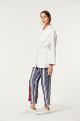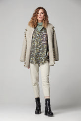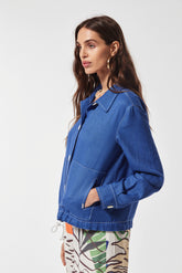 Chaqueta amplia, cuello smoking en bambula estampada sin forrar y con bolsillos con tapeta.La modelo mide 1.78m.- €78,00