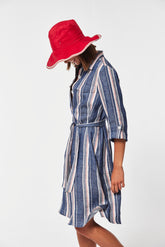 Vestido recto de lino-viscosa estampado. Desflecado en el bajo y las mangas. Tiene un adorno de cinta étnica en el escote, bolsillos y cordón en cintura.La modelo mide mide 1.78m.- €89,00