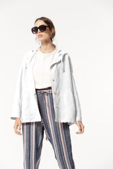 Chaqueta de lino-viscosa con capucha, bolsillos redondos pespunteados. Abrocha en el centro delantero con botones de madera.La modelo mide 1.78m.- €89,00