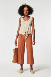 Camiseta de lino 100%, sin mangas, cuello redondo y adorno de rafia en el bajo.La modelo mide 1.75m.- €54,00