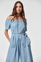 Mono amplio en tencel jeans, con hombros descubierto con goma. Cinturón lazo del mismo tejido y botones en el delantero.La modelo mide 1.78m.- €89,00