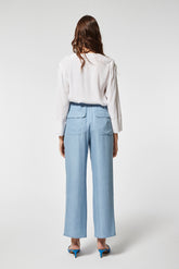 Pantalón en tencel jeans, goma en la cintura y bolsillos de plastrón.La modelo mide 1.78m.- €67,00
