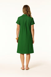 Vestido punta roma ligero, con drapeado lateral, escote pico y manga corta.La modelo mide 1.78m.- €79,00