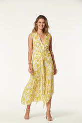 Vestido fluido en gasa laminada estampada. Parte de arriba cruzada con frunce en cintura y sin mangas, con detalle en cadera para anudar y falda con volantes asimétricos. Altura modelo 1,78cm- €179,00