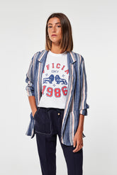 Camisa con escote pico, en rayas bicolor. Botones en el delantero, goma en el bajo y las mangas.La modelo mide 1.78m.- €44,00