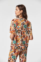 Camiseta amplia con estampado ikat, cuello redondo y cinta de encaje en el cuello.La modelo mide 1.78m.- €54,00
