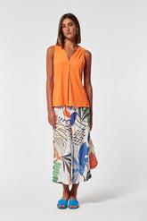 Top en viscosa de rayas multicolor. Sin mangas, de escote pico; cruza ligeramente. Detalle de volante en escote y delantero- €83,00