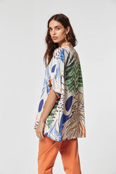 Blusa con cuello pico, con lazo, en gasa de viscosa abambulada estampada. Abertura en el bajo del delantero y gomas en las mangas.La modelo mide 1.75m.- €54,00