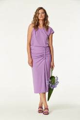 Top en tejido laminado que deja un hombro descubierto. Manga corta y aberturas latrerales. Cinturón del mismo tejido- €68,00