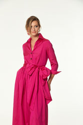 Vestido camisero largo, en taffeta. Parte de arriba entallada, con detalle de vuelta el el puñoy botones tipo joya. Falda voluminosa, con mucho frunce y abertura frontal. Lleva cinturon para lazada. Altura modelo 1,78cm- €176,00