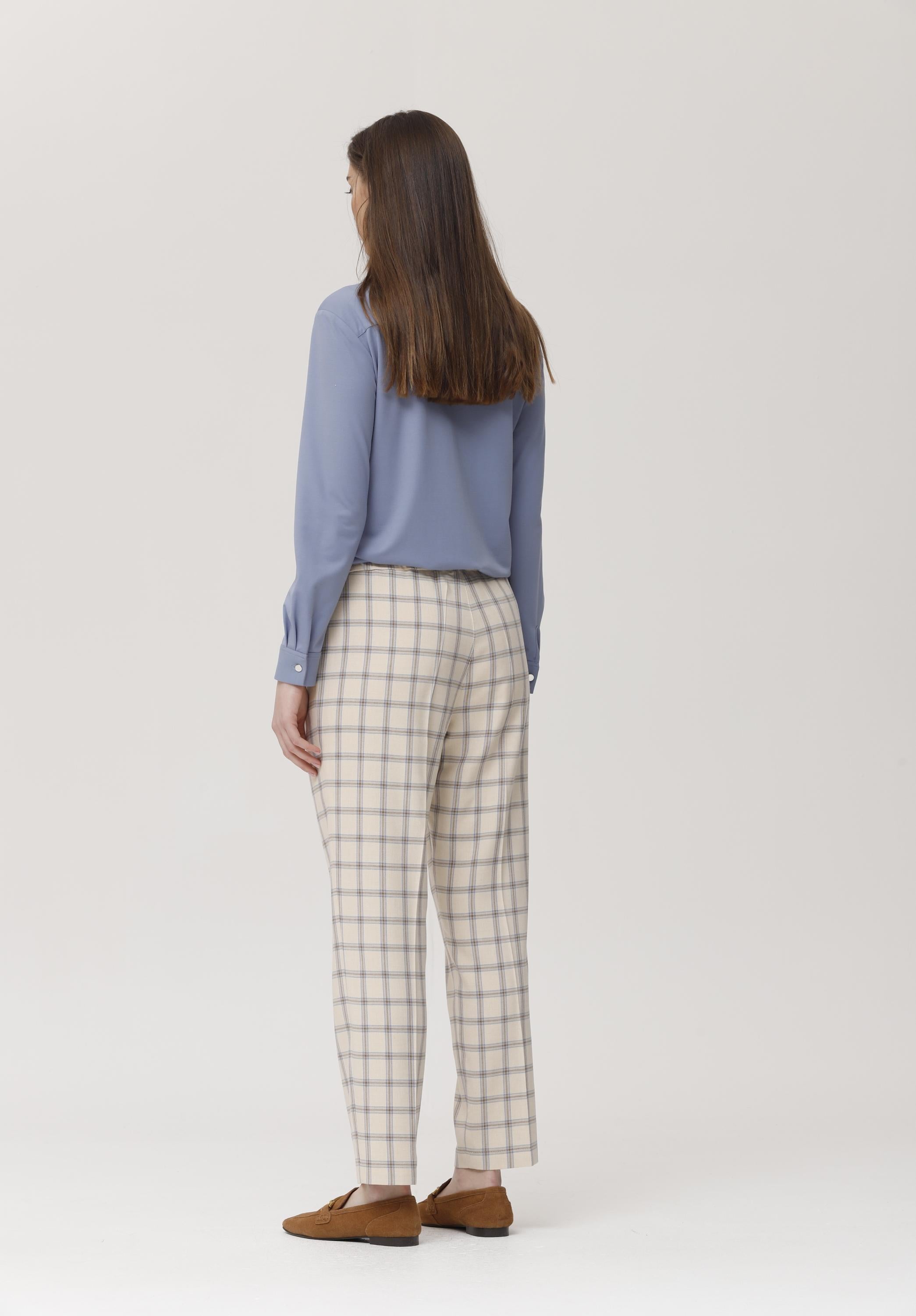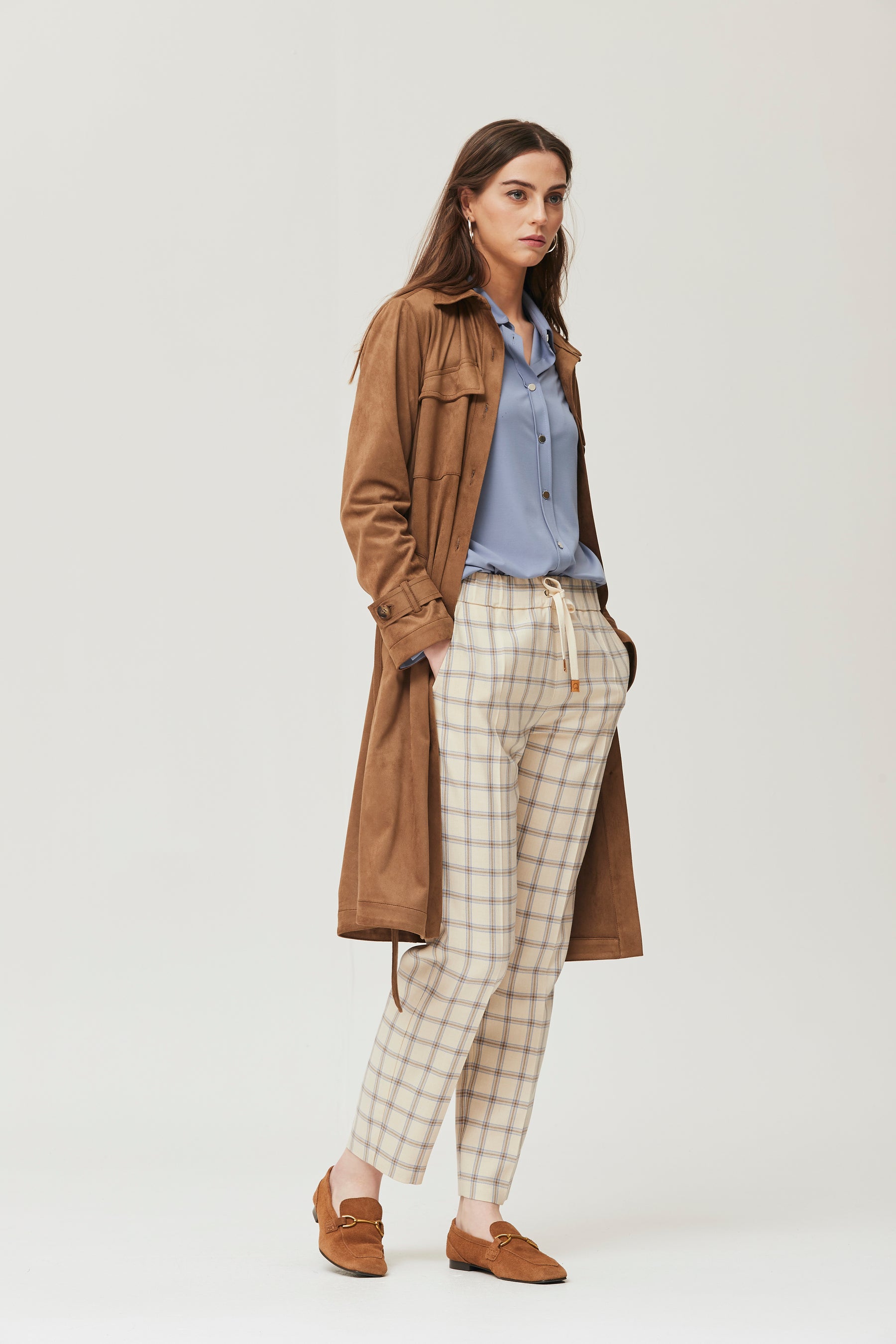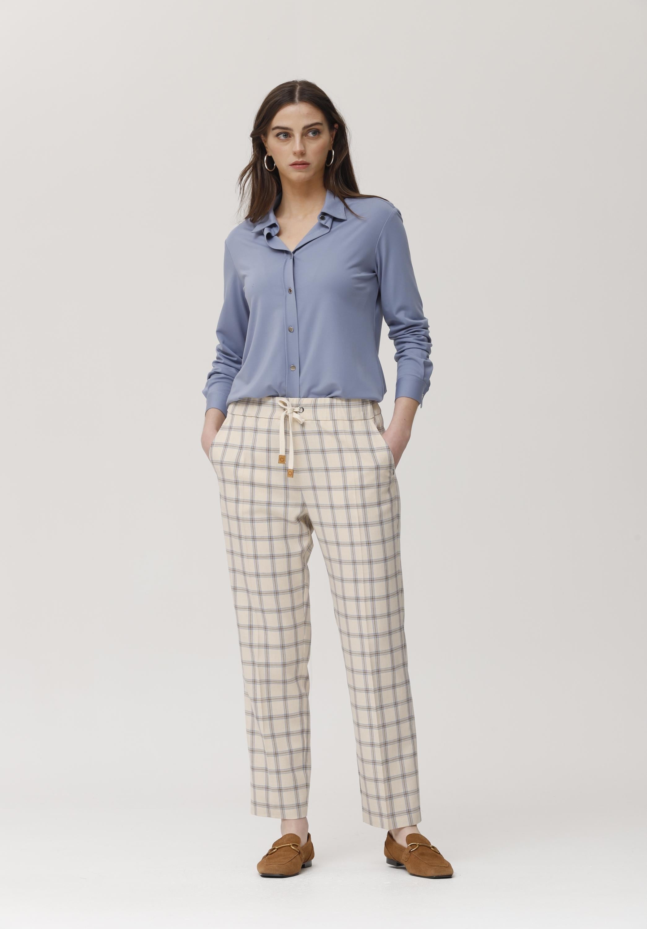 Lightweight knit shirt in a soft light blue shade, made from stretchy, ultra-soft fabric. It features a straight cut, classic collar, front button closure, and long sleeves with adjustable cuffs. Its minimalist and comfortable design makes it perfect for casual looks or office wear, delivering freshness and comfort all day long. Ideal to pair with trousers, skirts, or even as a light overshirt during transitional seasons.
