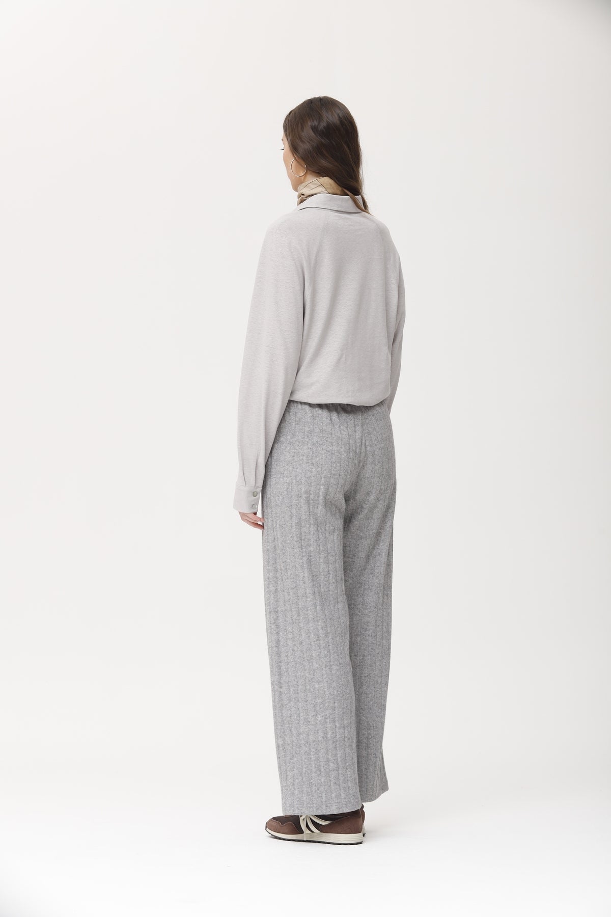 Chemisier en maille de lin gris clair, à col classique et fermeture boutonnée sur le devant. De délicates perles ornent la poitrine, apportant une touche sophistiquée et féminine. Sa coupe décontractée et son tissu doux en font le vêtement idéal pour composer des looks chics et confortables, parfaits pour toutes les occasions.