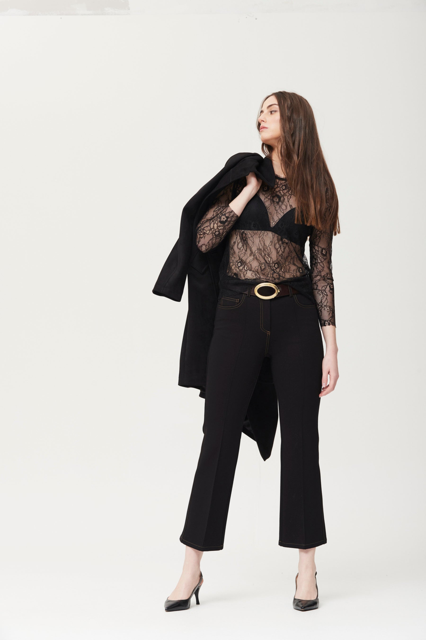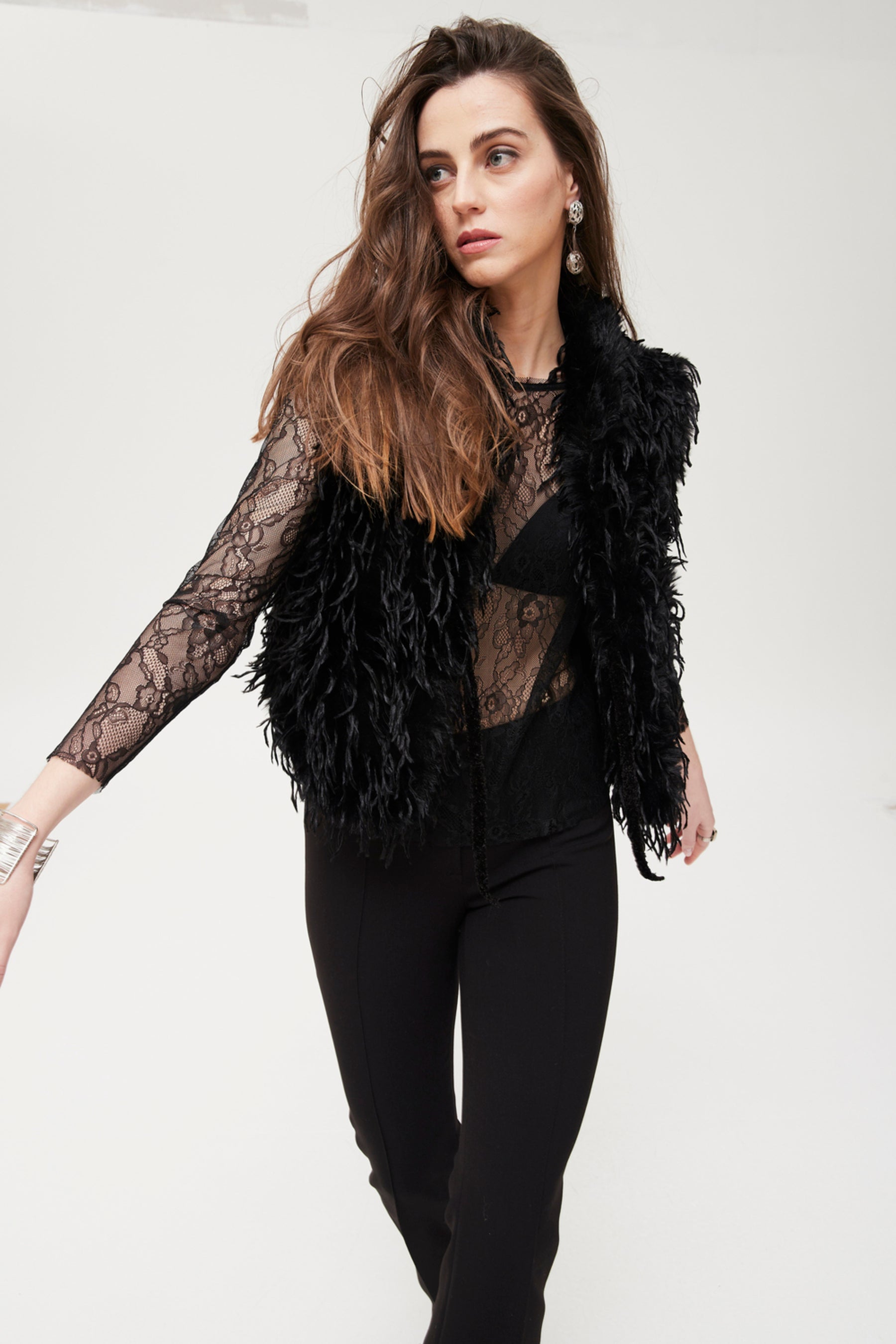 Ce top à manches longues, confectionné en dentelle de Chantilly noire, présente une coupe droite et de délicats détails transparents pour une allure sophistiquée et sensuelle. Son tissu léger et extensible permet de le superposer à des débardeurs, des brassières ou de le porter sous un blazer pour créer des tenues élégantes pour les fêtes, les soirées ou même un look décontracté avec un jean. Les poignets et l'encolure soulignent les lignes élégantes du vêtement, ce qui en fait le choix idéal pour celles qui recherchent une touche d'originalité dans leurs ensembles.
