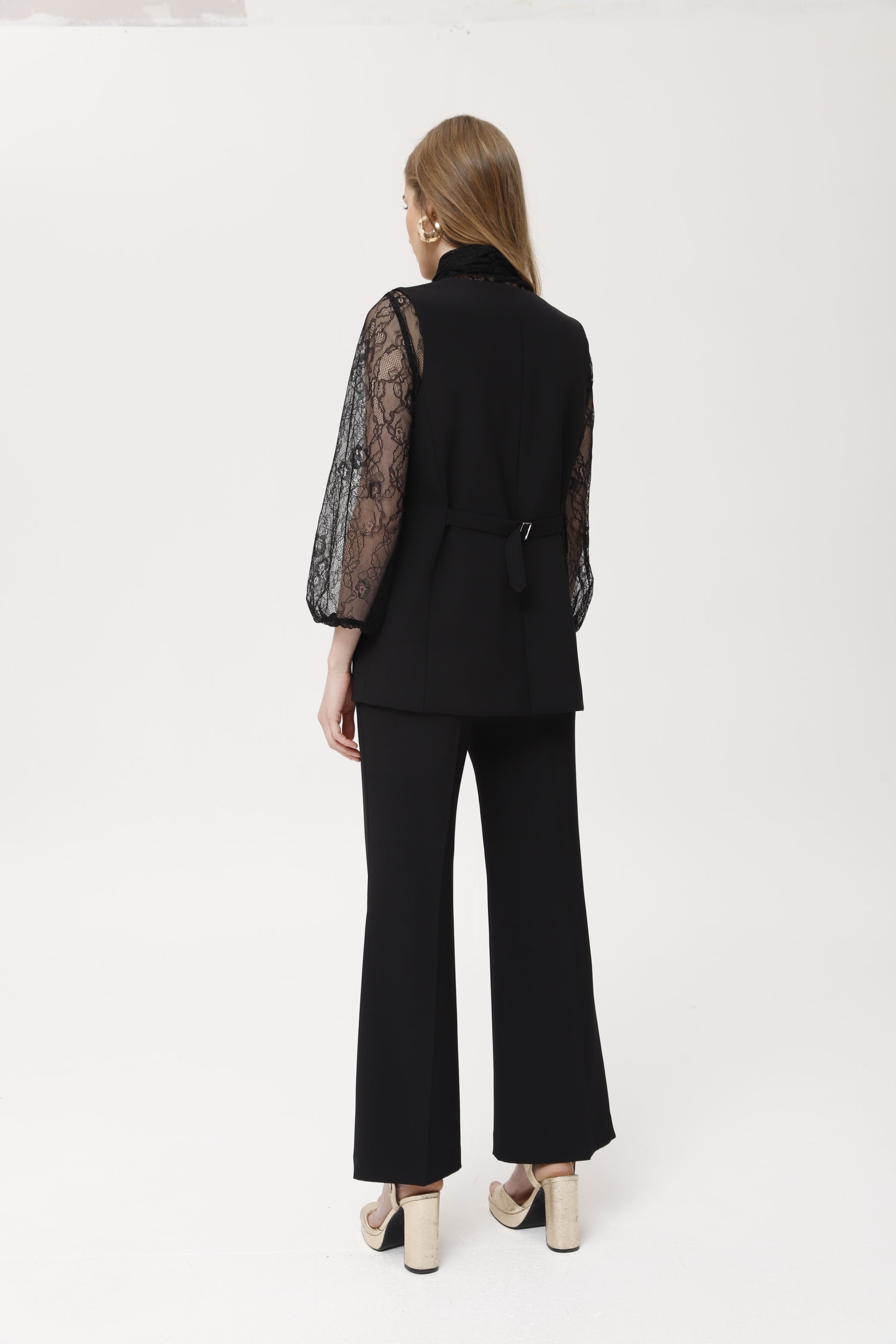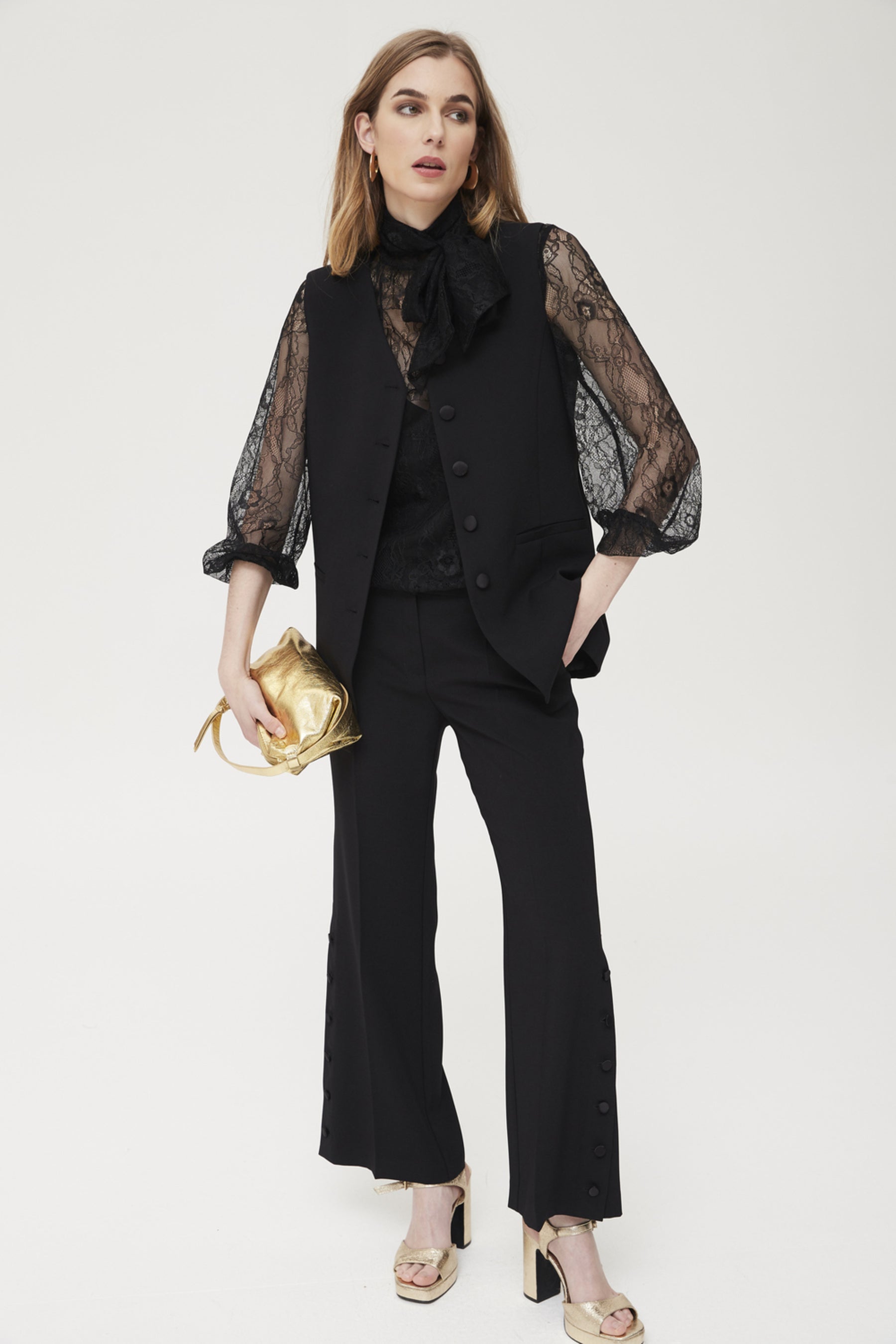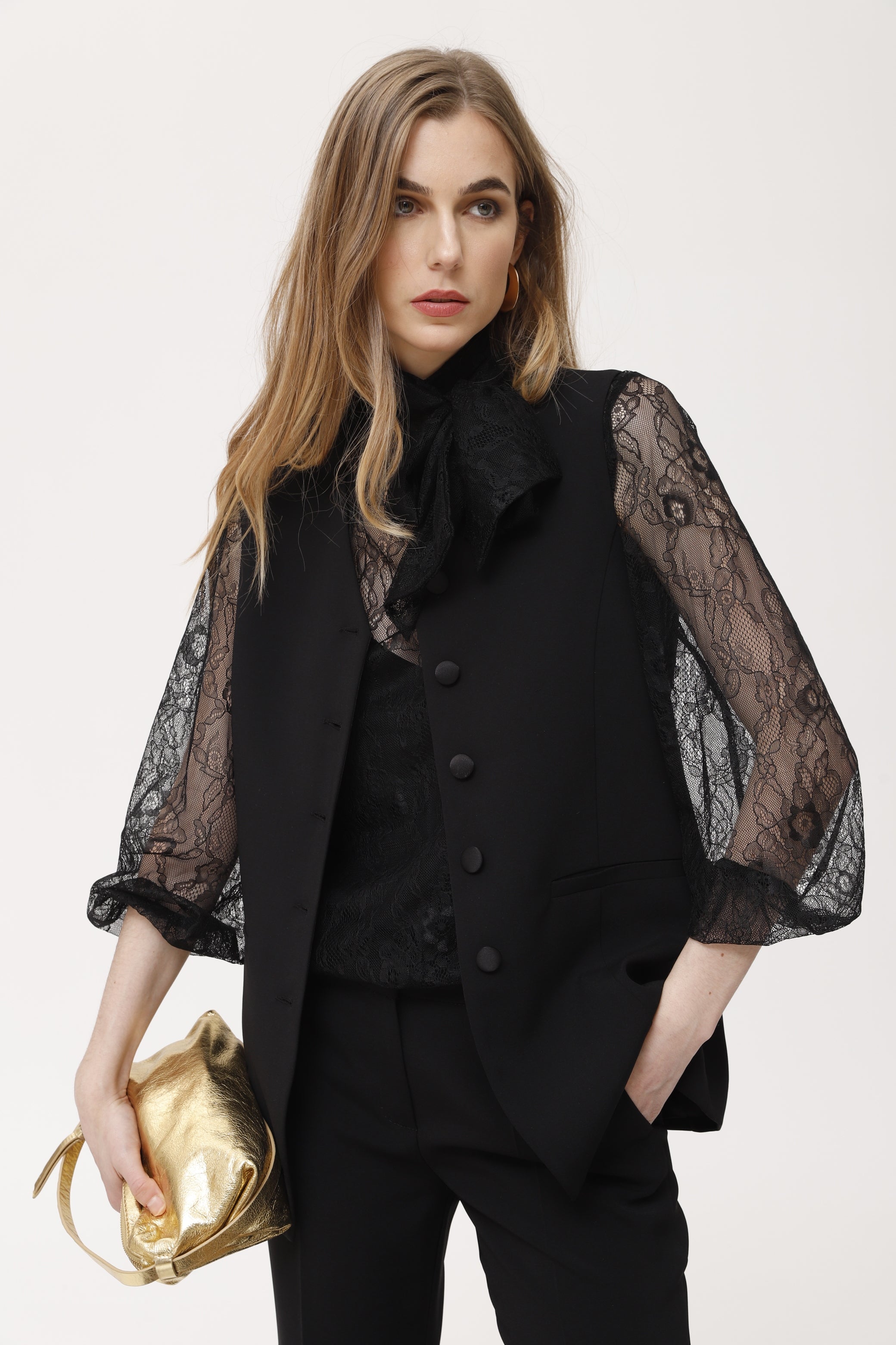 Gilet tailleur en satin stretch noir, à la coupe droite et à la fermeture boutonnée sur le devant avec boutons recouverts. Le tissu stretch assure confort et une silhouette impeccable, tandis que la finition satinée apporte une touche de sophistication à toutes vos tenues. Idéal à superposer sur des chemises, des blouses en dentelle ou des pulls fins, pour créer des looks urbains, de bureau ou même de soirée. Une pièce polyvalente et moderne qui complète à merveille des ensembles élégants ou d'inspiration masculine.