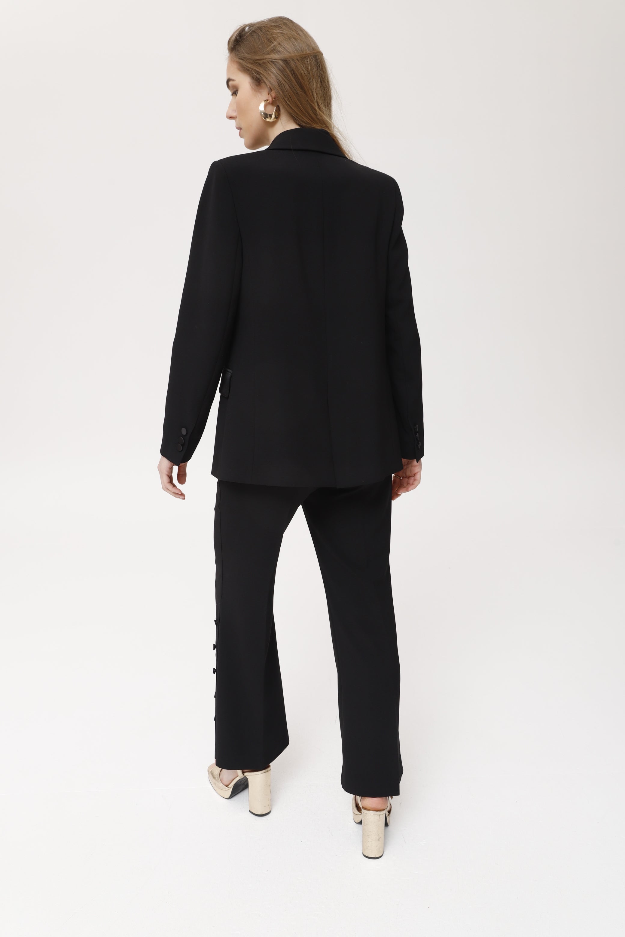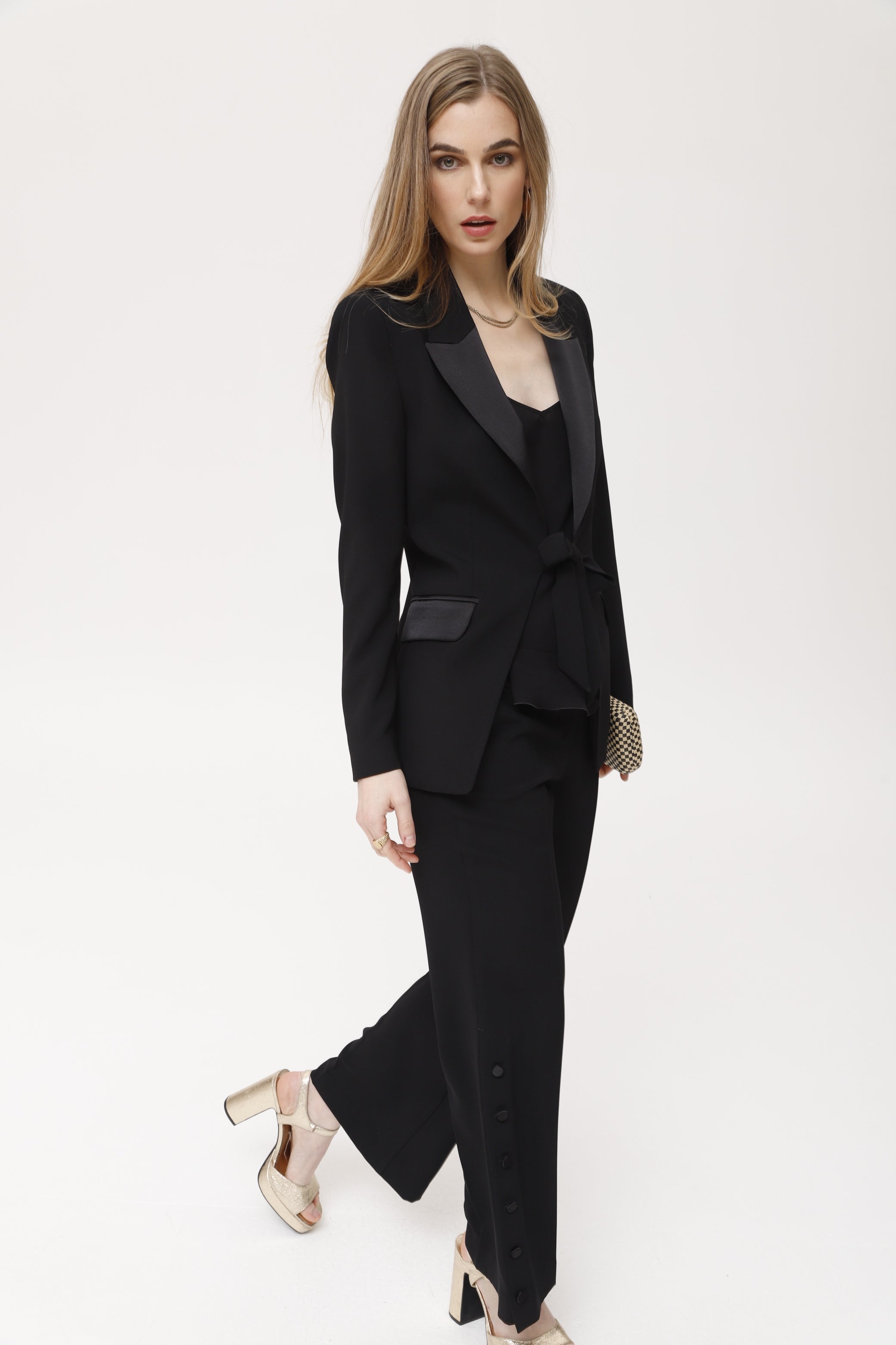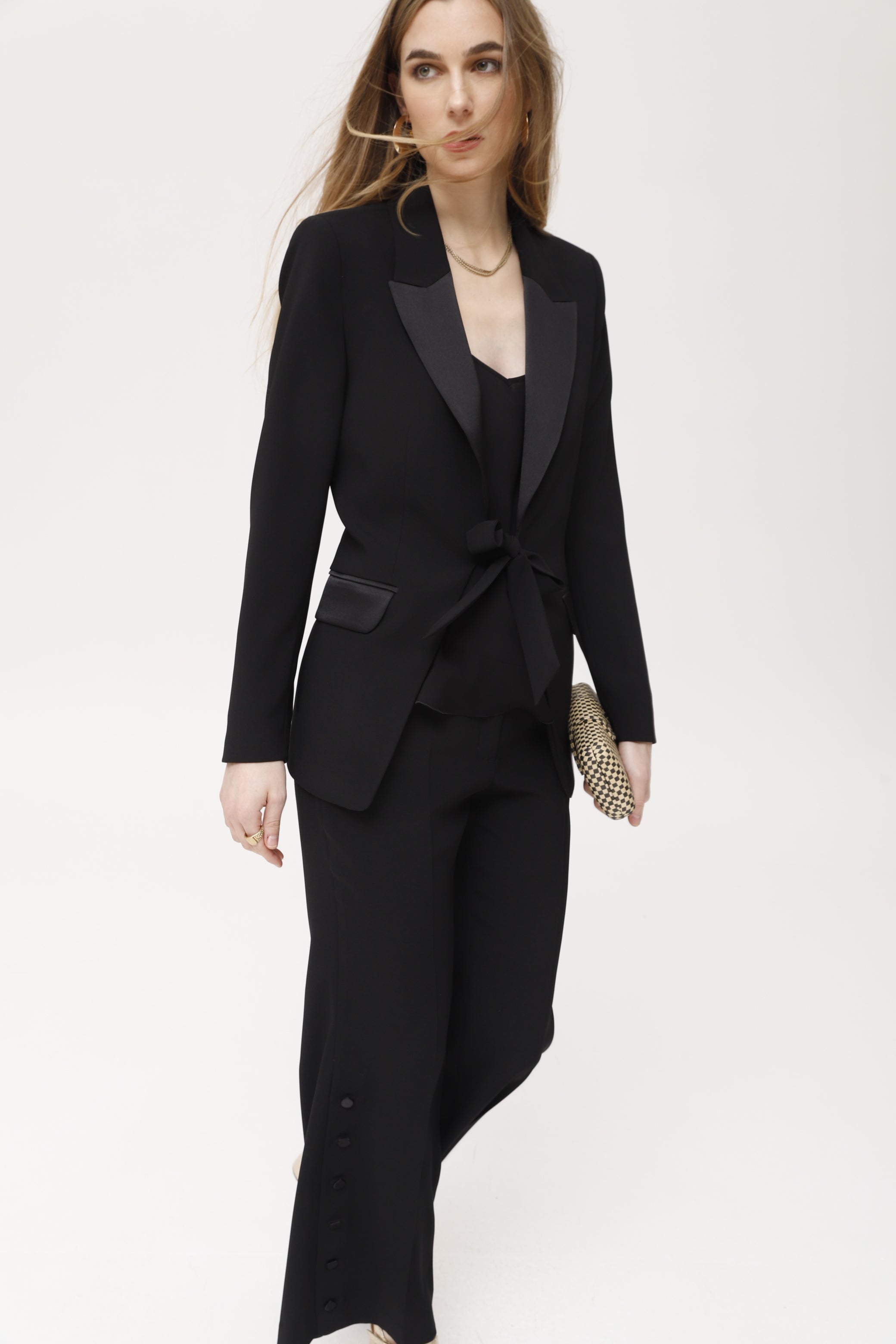 Une veste de smoking en crêpe noir et satin stretch, ornée de revers en satin assortis et d'une fermeture à nouer sur le devant. Sa coupe cintrée, ses poches à rabat en satin et sa silhouette légèrement ajustée flattent la silhouette. Le tissu stretch assure confort et liberté de mouvement, tandis que la finition brillante rehausse son élégance, la rendant idéale pour les événements, les soirées et les occasions spéciales. Une pièce polyvalente qui confère à toute tenue une allure élégante et contemporaine.