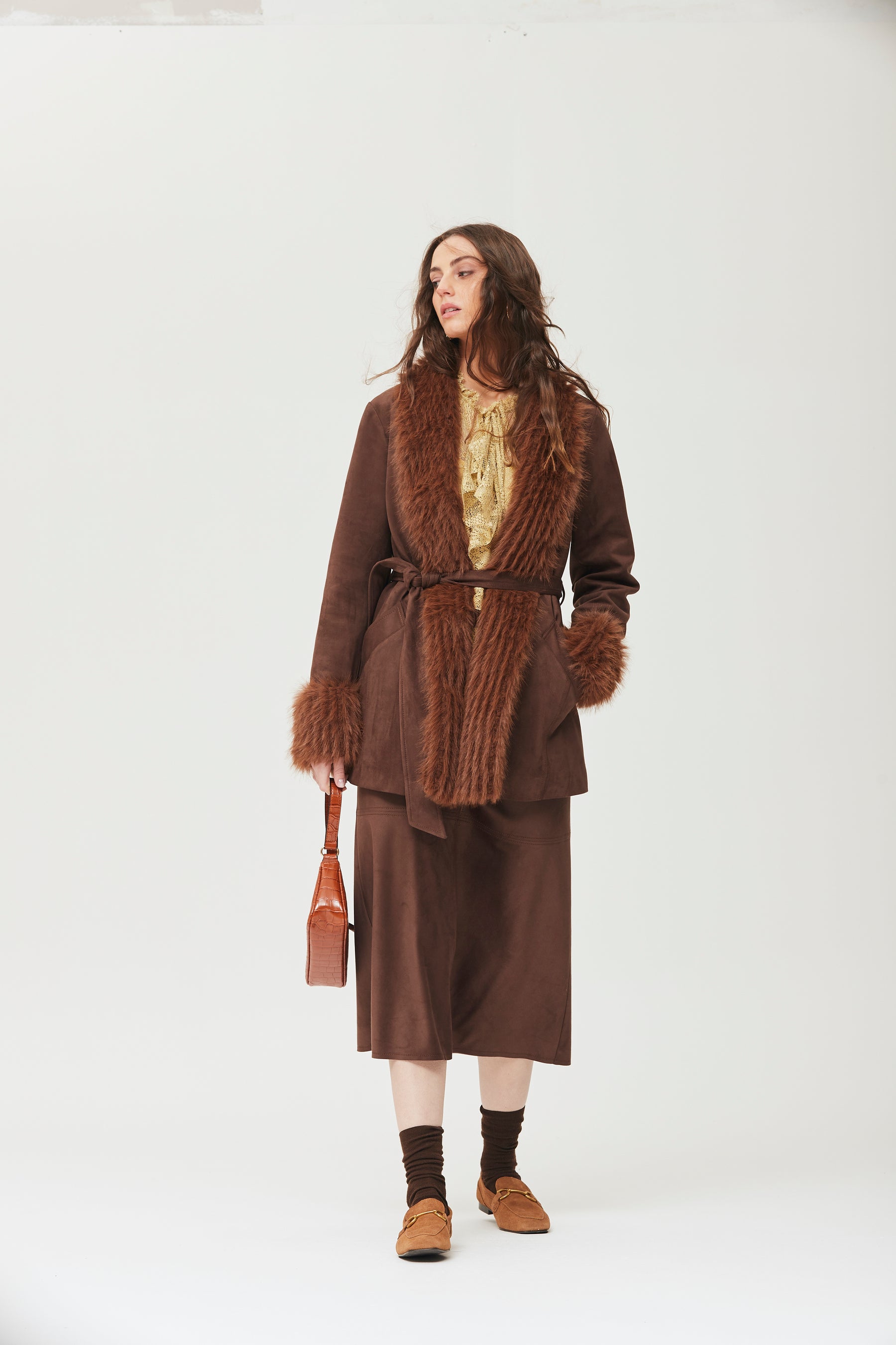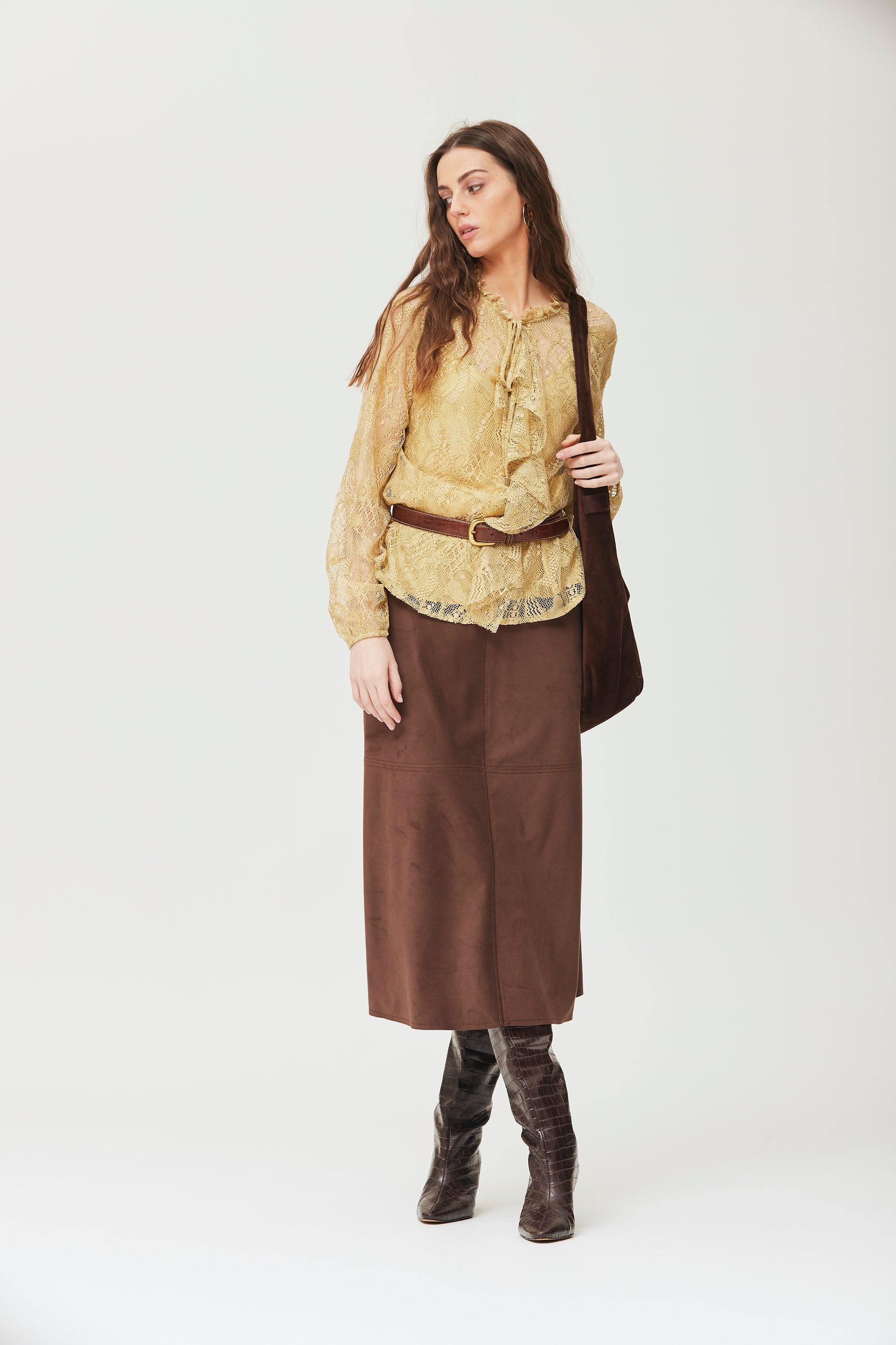 Jupe midi effet daim avec taille élastiquée. Taille du mannequin : 1,75 m