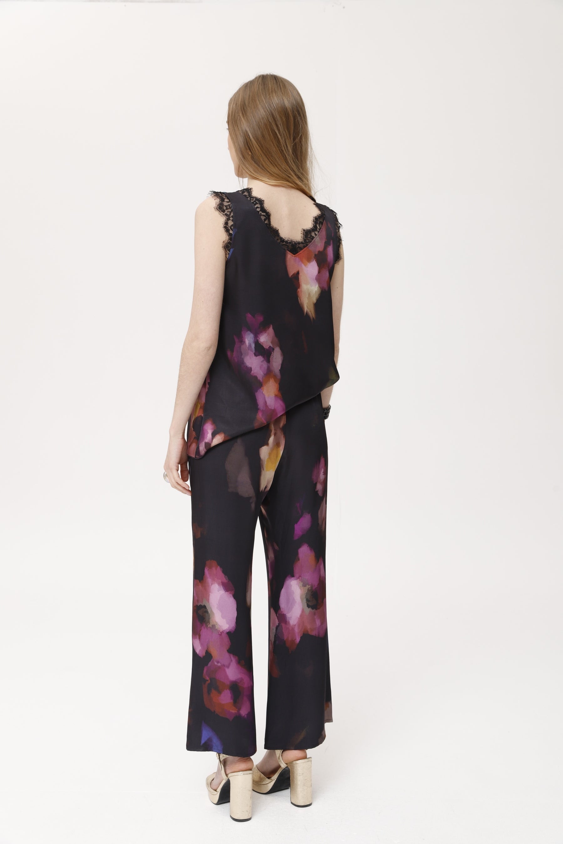Débardeur en viscose imprimée à motifs floraux abstraits dans des tons foncés et détails multicolores, orné d'un décolleté en V rehaussé de dentelle noire. Sa matière légère et fluide assure un drapé élégant et un confort exceptionnel. Sa coupe polyvalente permet de l'associer à des pantalons, jupes ou jeans assortis, pour composer facilement des looks sophistiqués de jour comme de nuit. Une pièce originale et féminine pour se démarquer en toute occasion.