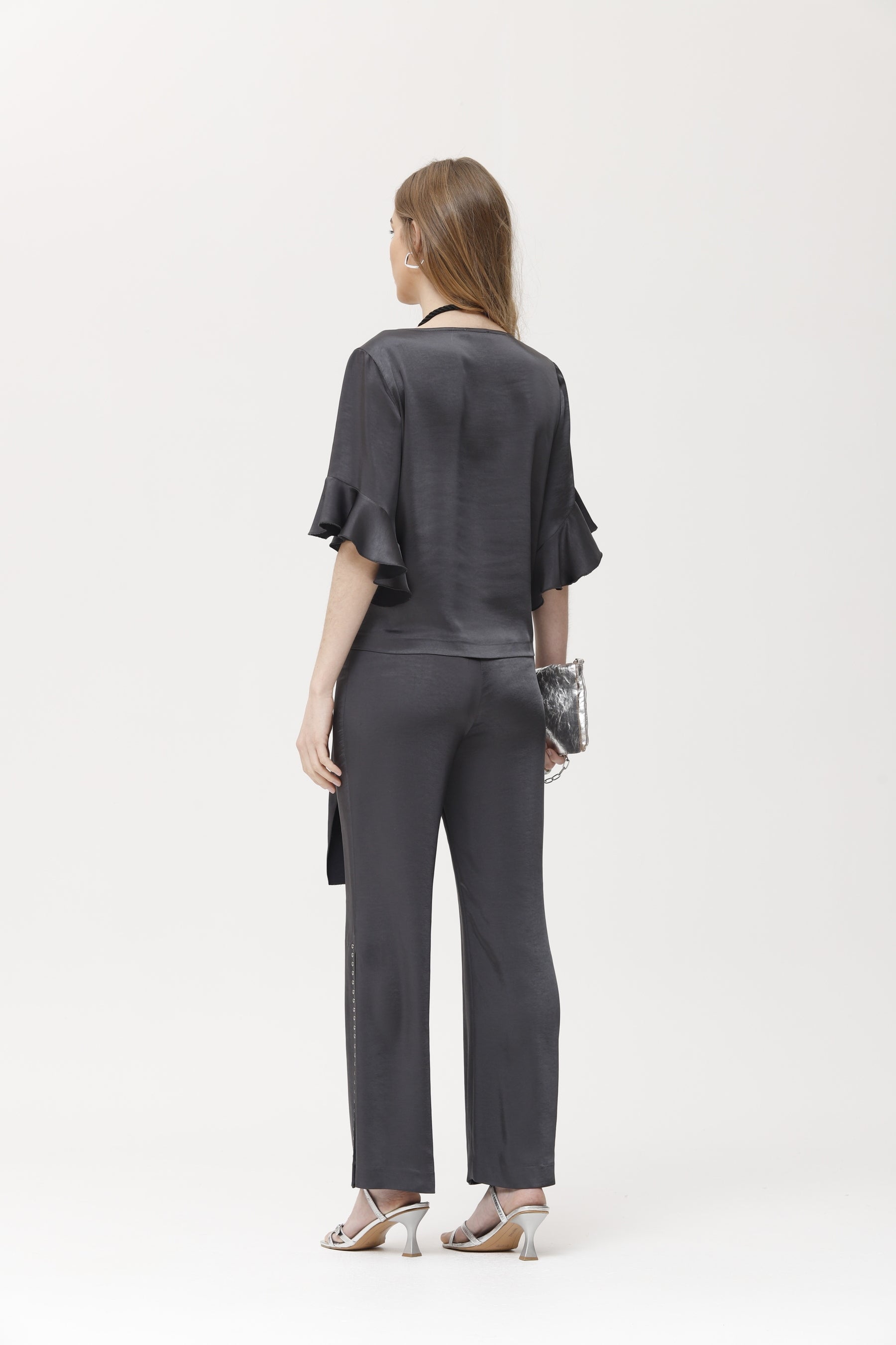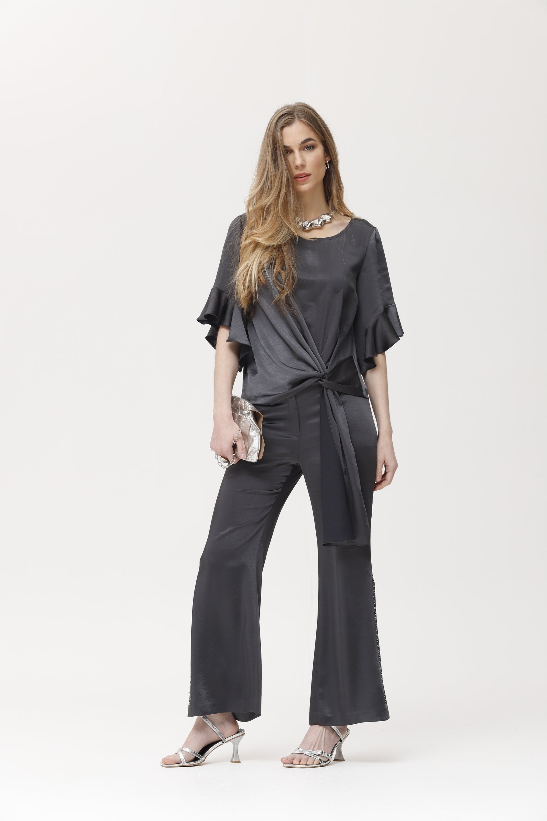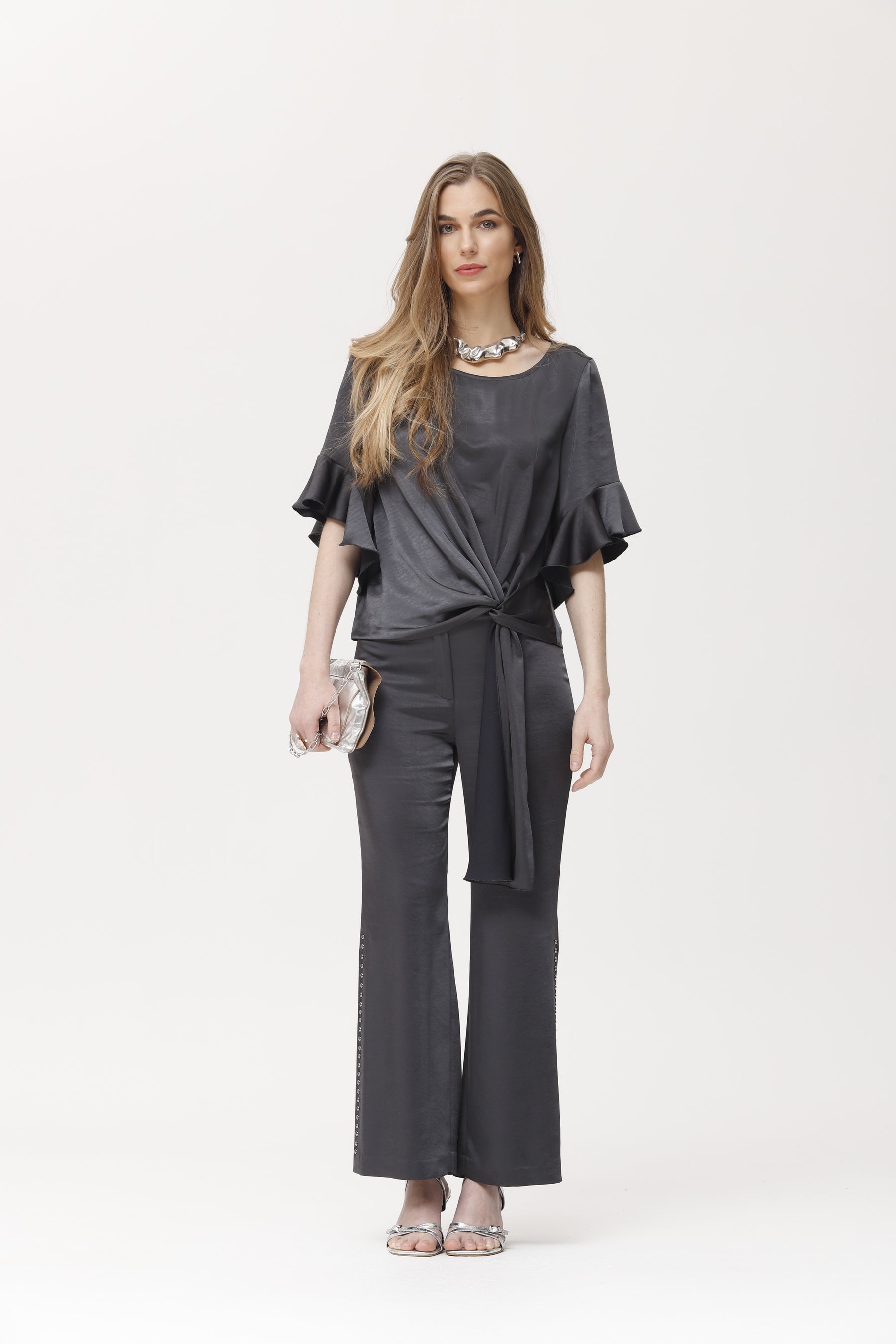 Ce top en satin gris anthracite offre un toucher doux et satiné. Ses manches courtes à volants et son lien à nouer sur le devant lui confèrent fluidité et sophistication. Sa coupe fluide et son drapé léger en font le choix idéal pour les tenues d'invités, les dîners ou les événements spéciaux. Il se marie aussi bien avec des pantalons qu'avec des jupes pour créer des ensembles élégants et polyvalents. Son éclat subtil et son design féminin subliment toutes vos tenues de soirée.