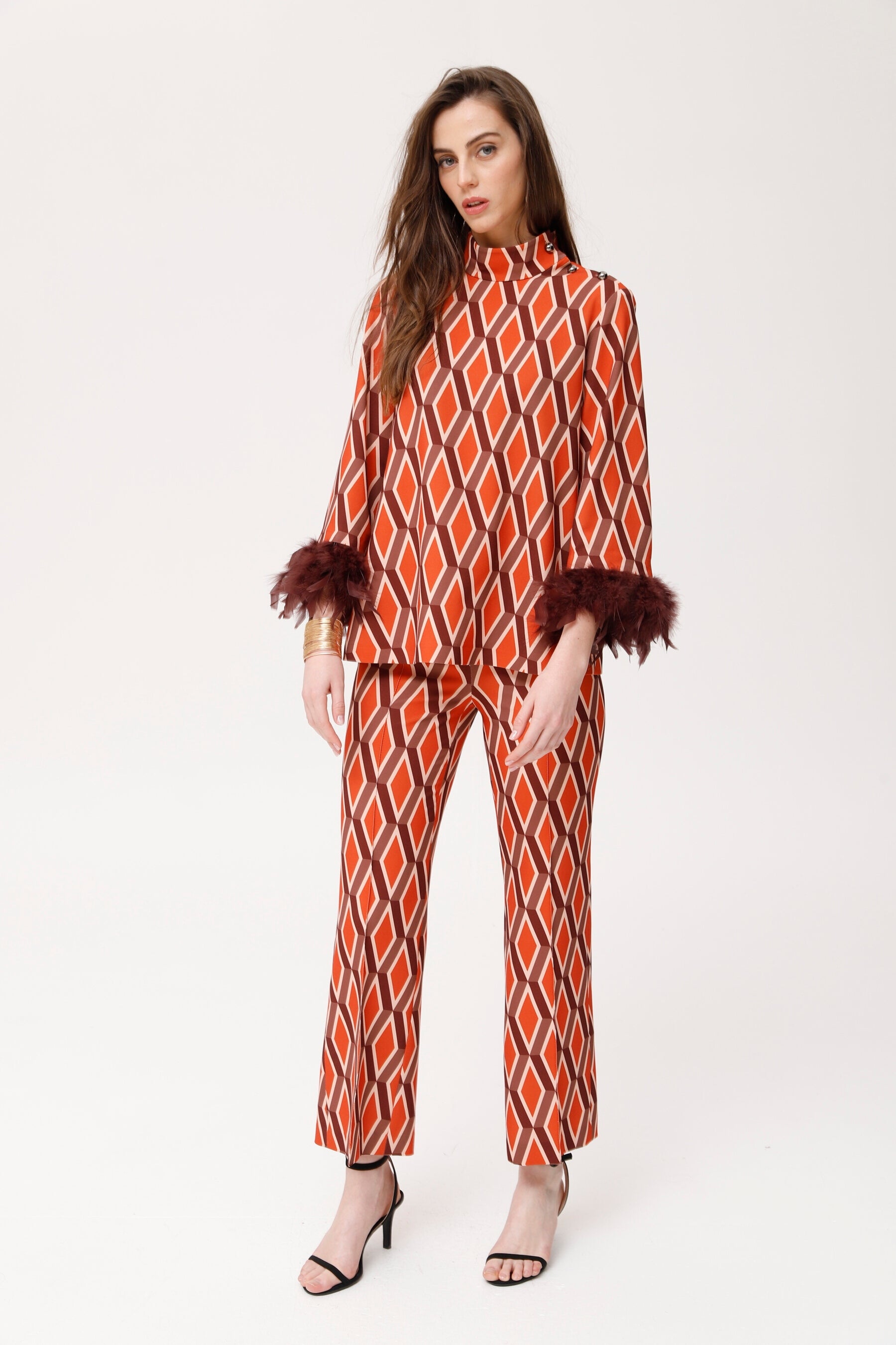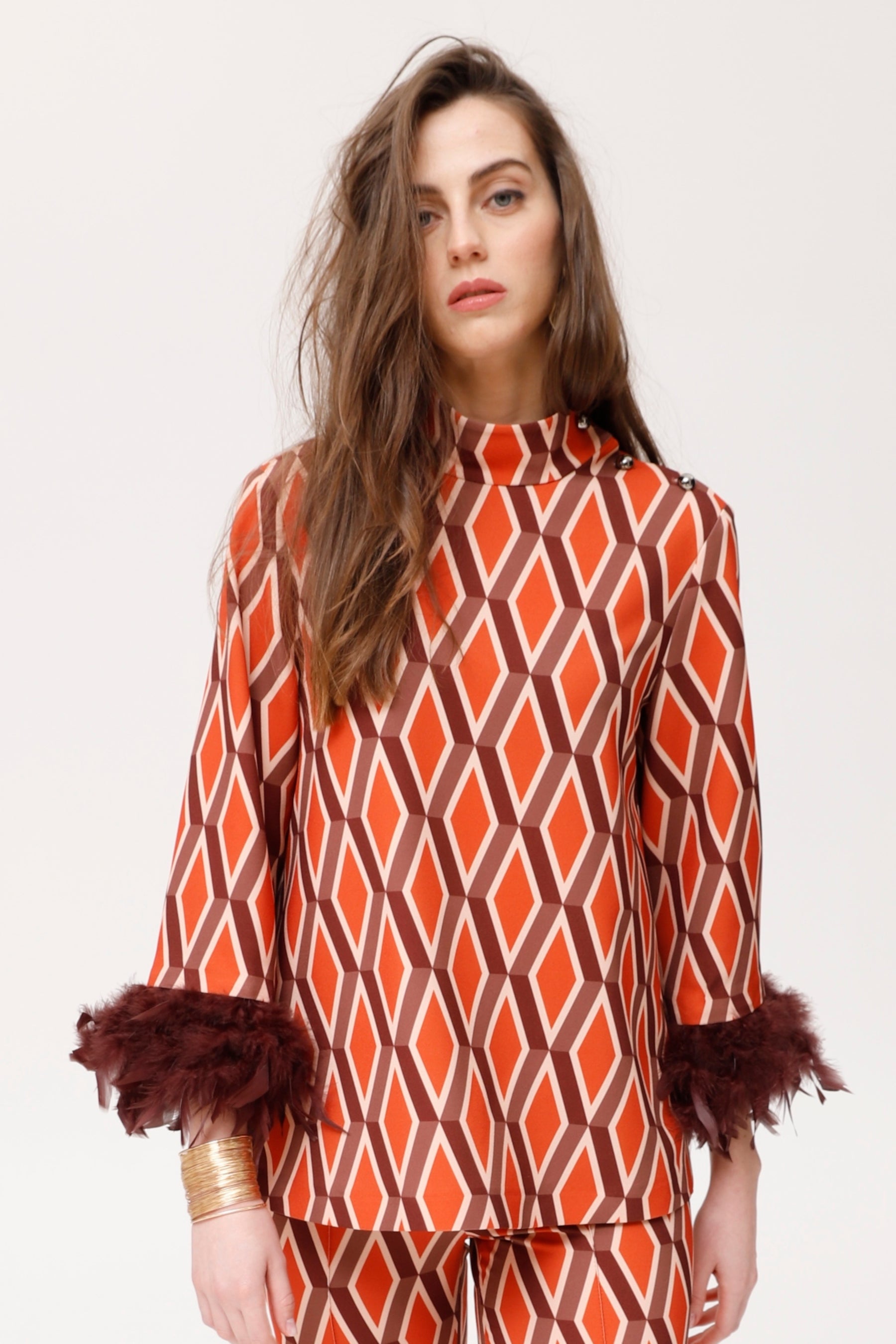 Un top ample en crêpe à imprimés géométriques, dans des tons terracotta et bordeaux, avec des manches droites et des détails en plumes aux poignets. Il possède un col montant, une fermeture boutonnée sur le côté et une coupe décontractée pour un confort optimal. La fluidité du tissu et le design original en font une pièce idéale pour les tenues d'invités, les événements spéciaux ou un look urbain élégant. Parfait pour se démarquer en toute occasion avec une touche de sophistication rétro.