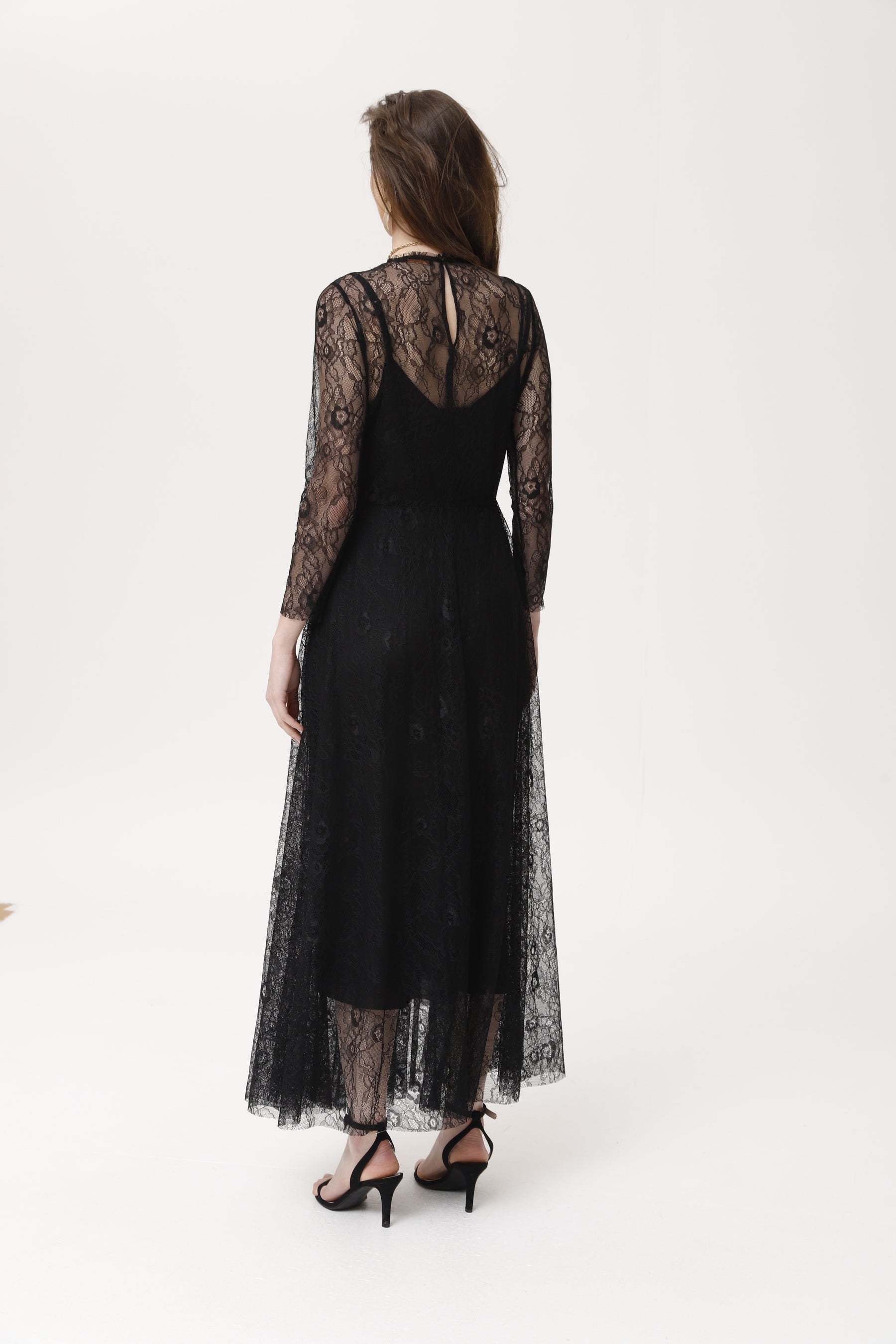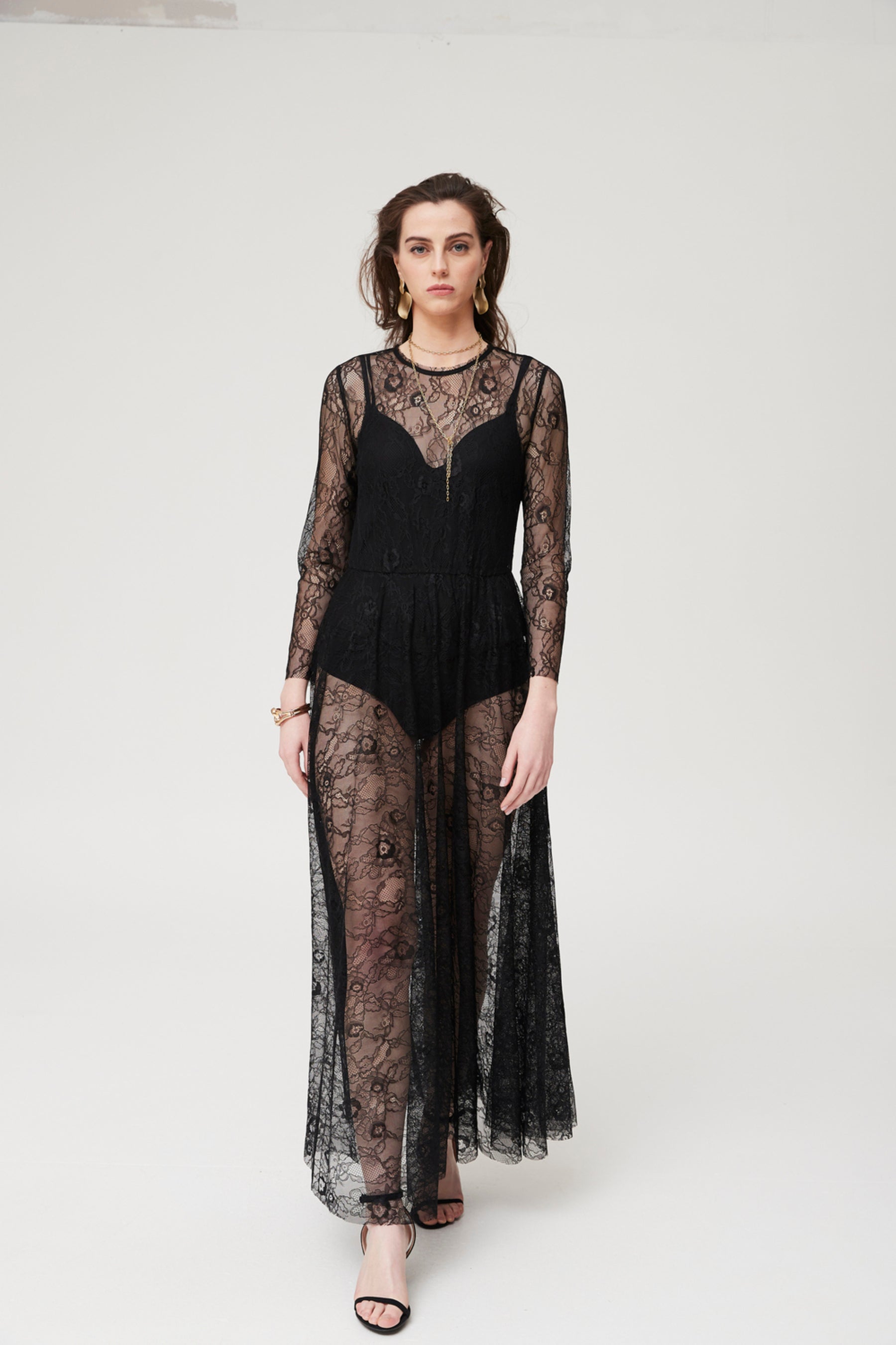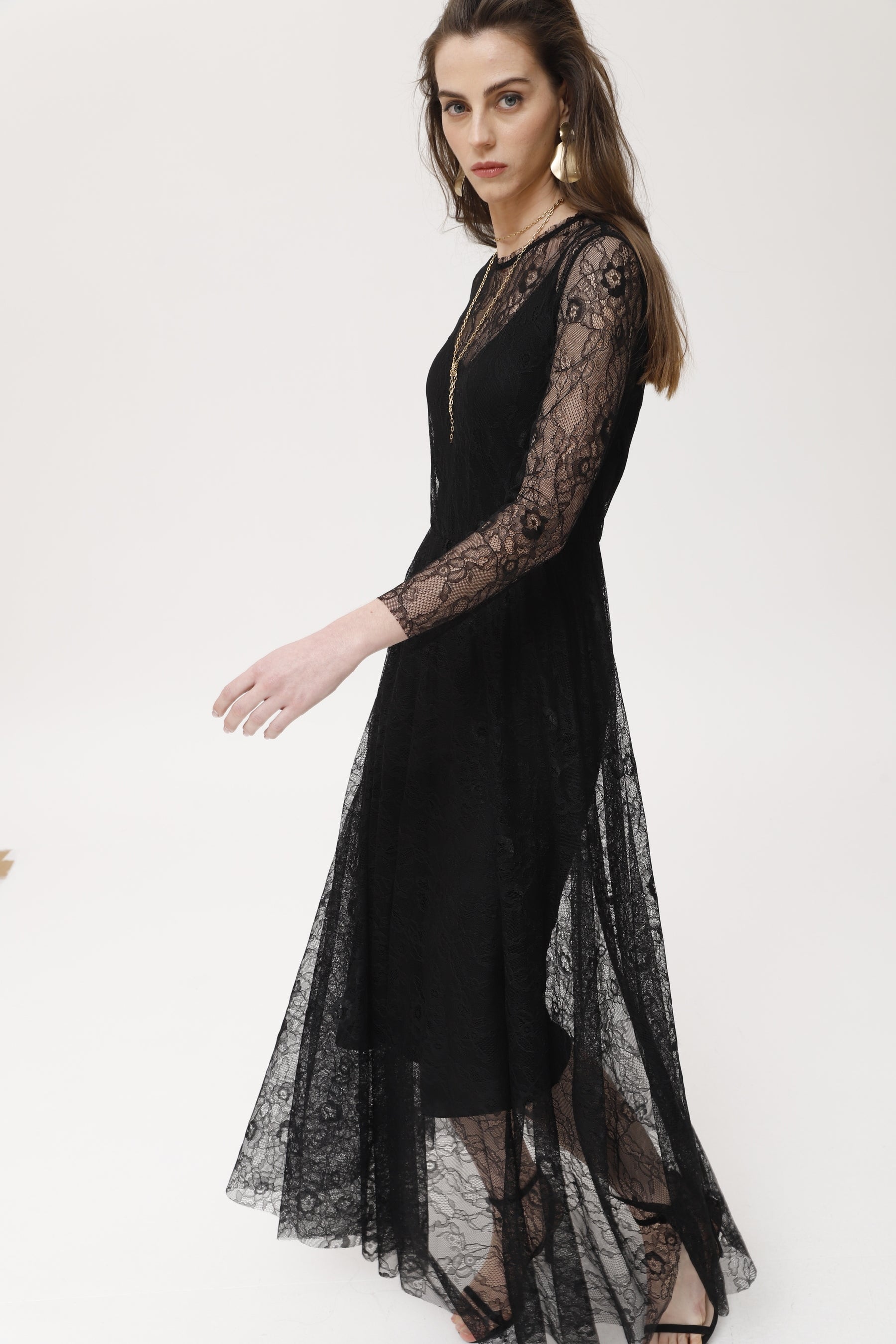 Une longue robe en dentelle de Chantilly noire, dotée d'un corsage ajusté et d'une jupe fluide et transparente. Ses manches longues semi-transparentes et son encolure ronde lui confèrent élégance et romantisme. Sa légèreté sublime la silhouette et la rend idéale pour les soirées et les occasions spéciales. Portée seule ou sur une robe nuisette, elle s'accorde facilement avec des accessoires dorés et des talons hauts. Une robe sophistiquée pour faire sensation en toute occasion.
