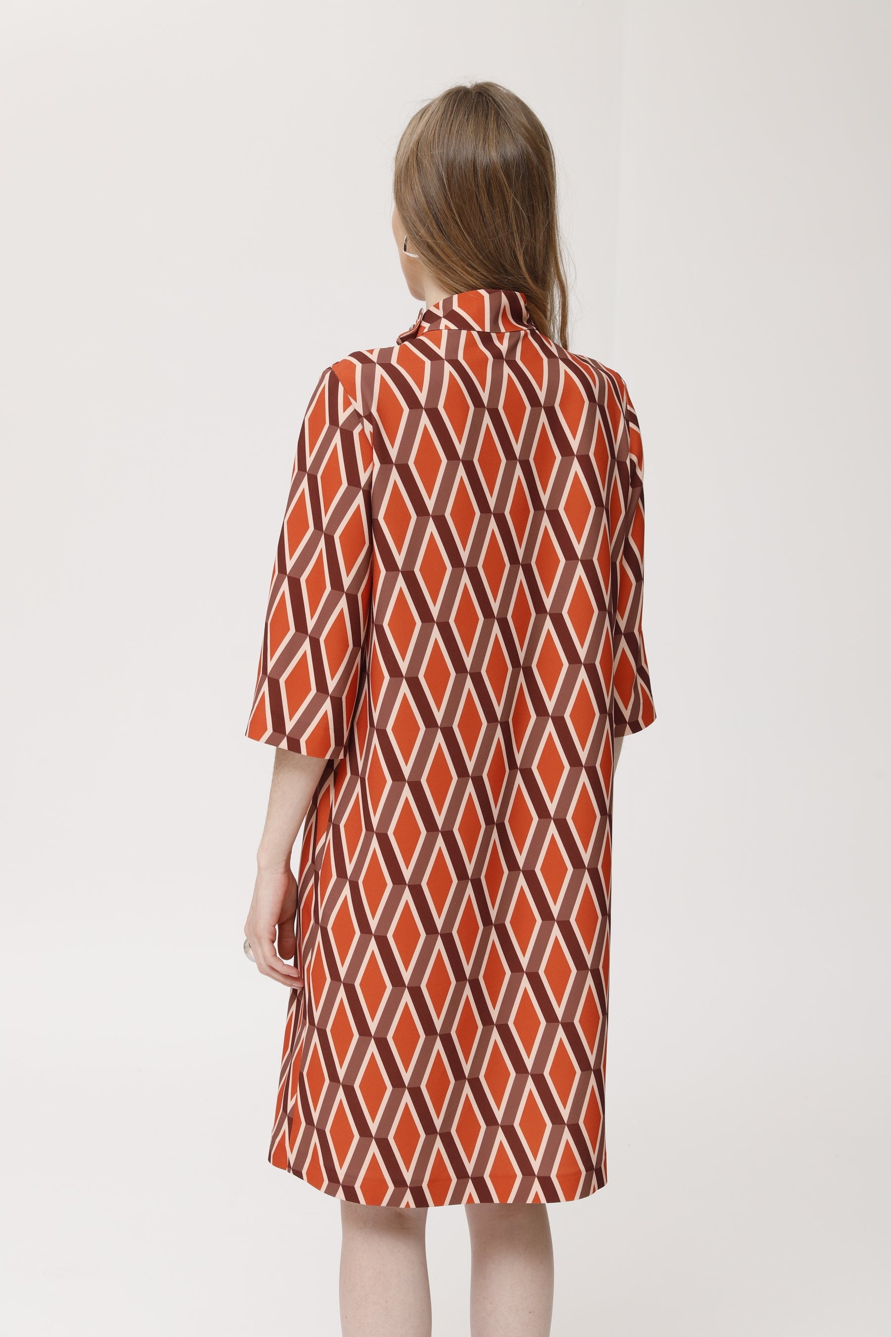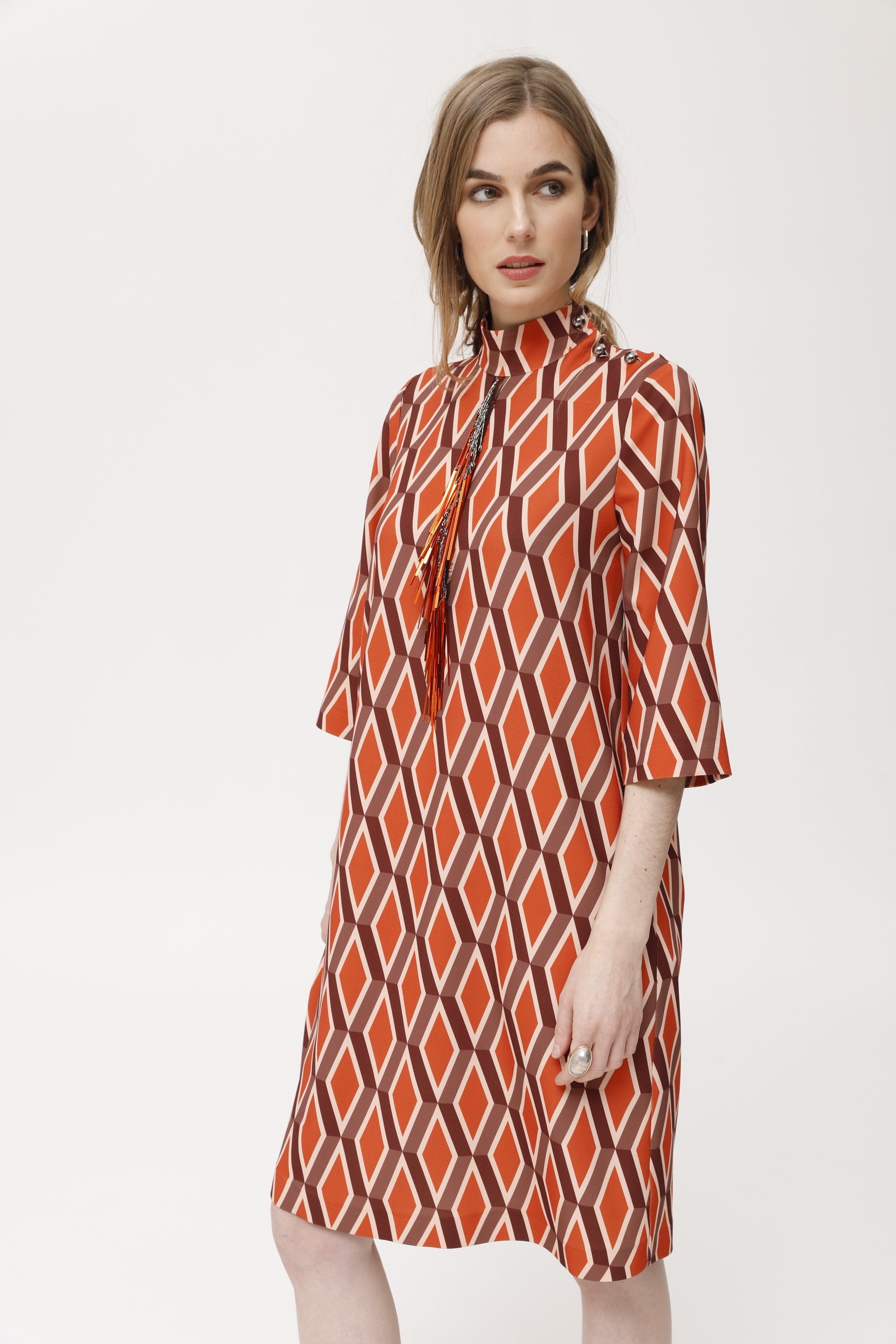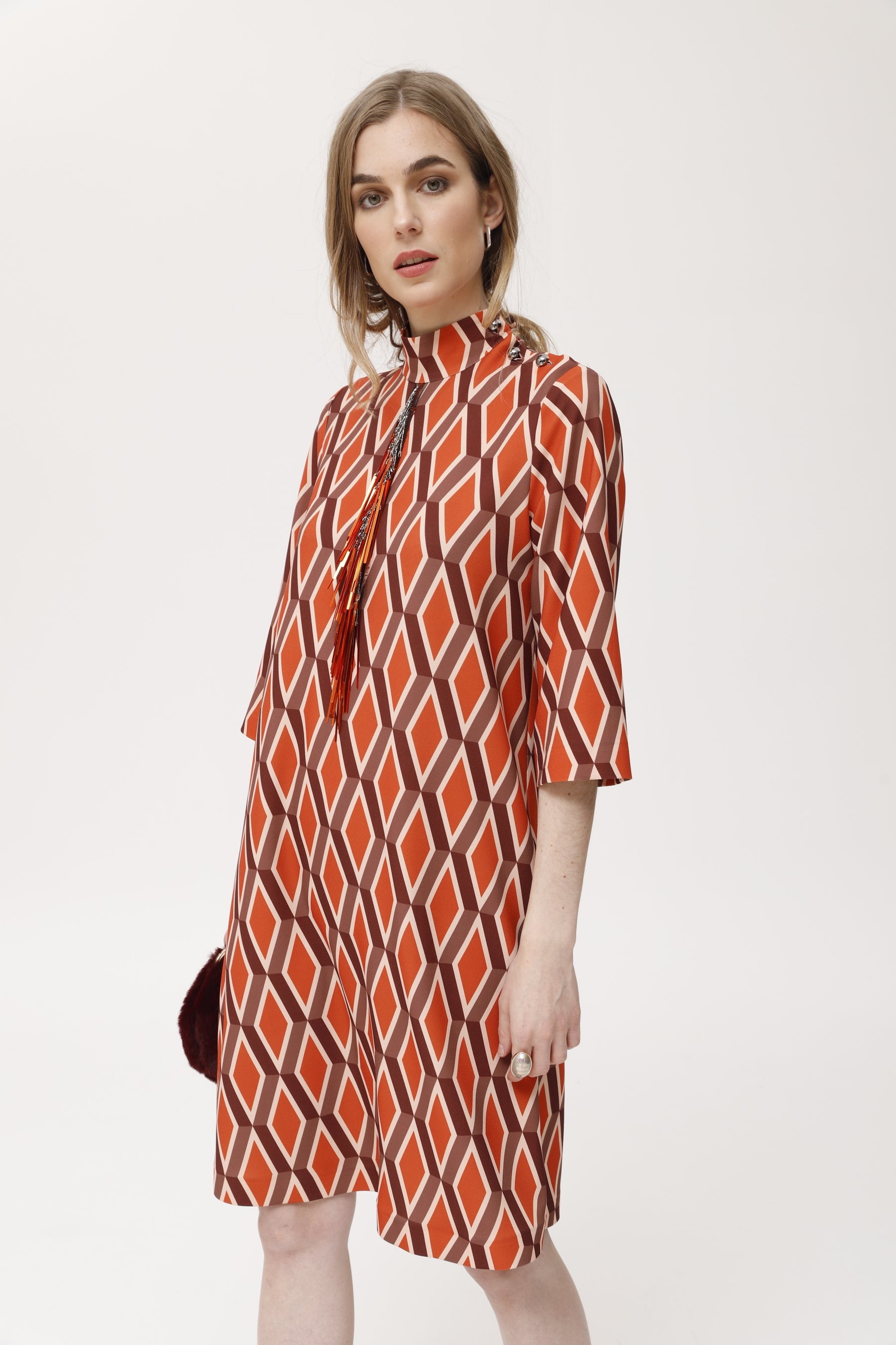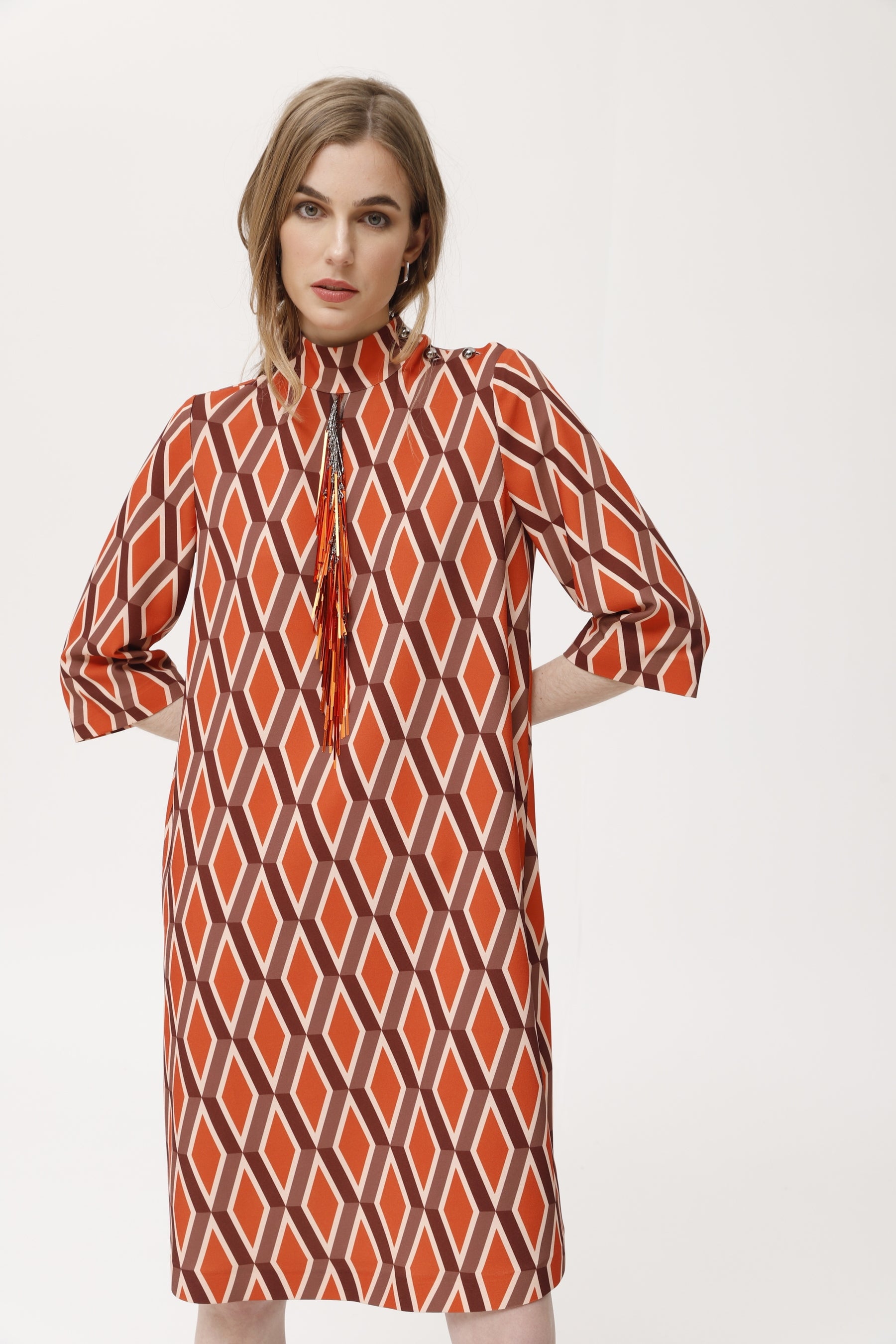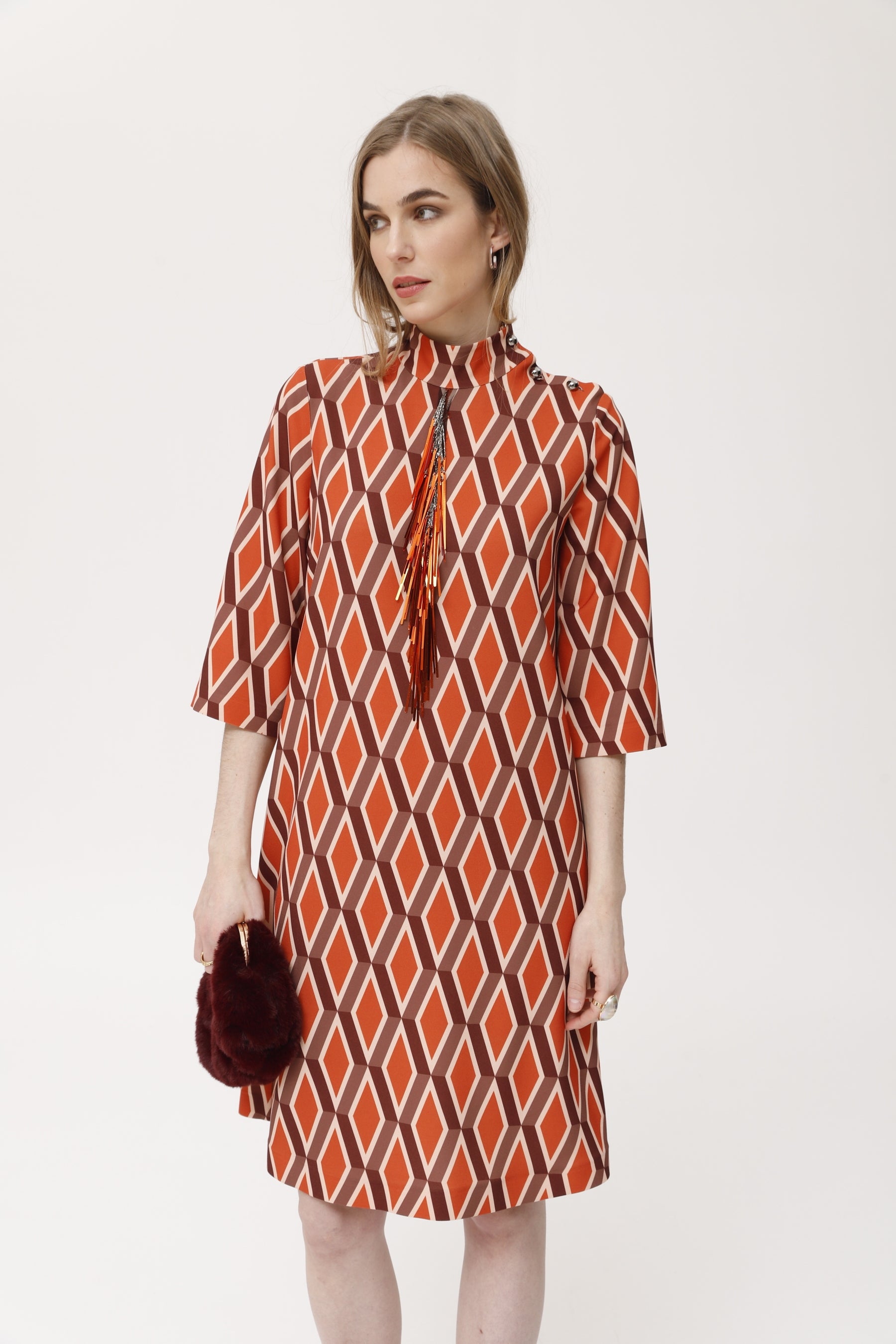 Cette robe en crêpe à imprimé géométrique présente une coupe droite, des manches mi-longues, un col montant boutonné et une frange à l'encolure. Son imprimé rétro aux tons chauds lui confère une allure sophistiquée et moderne, idéale pour les tenues de saison.