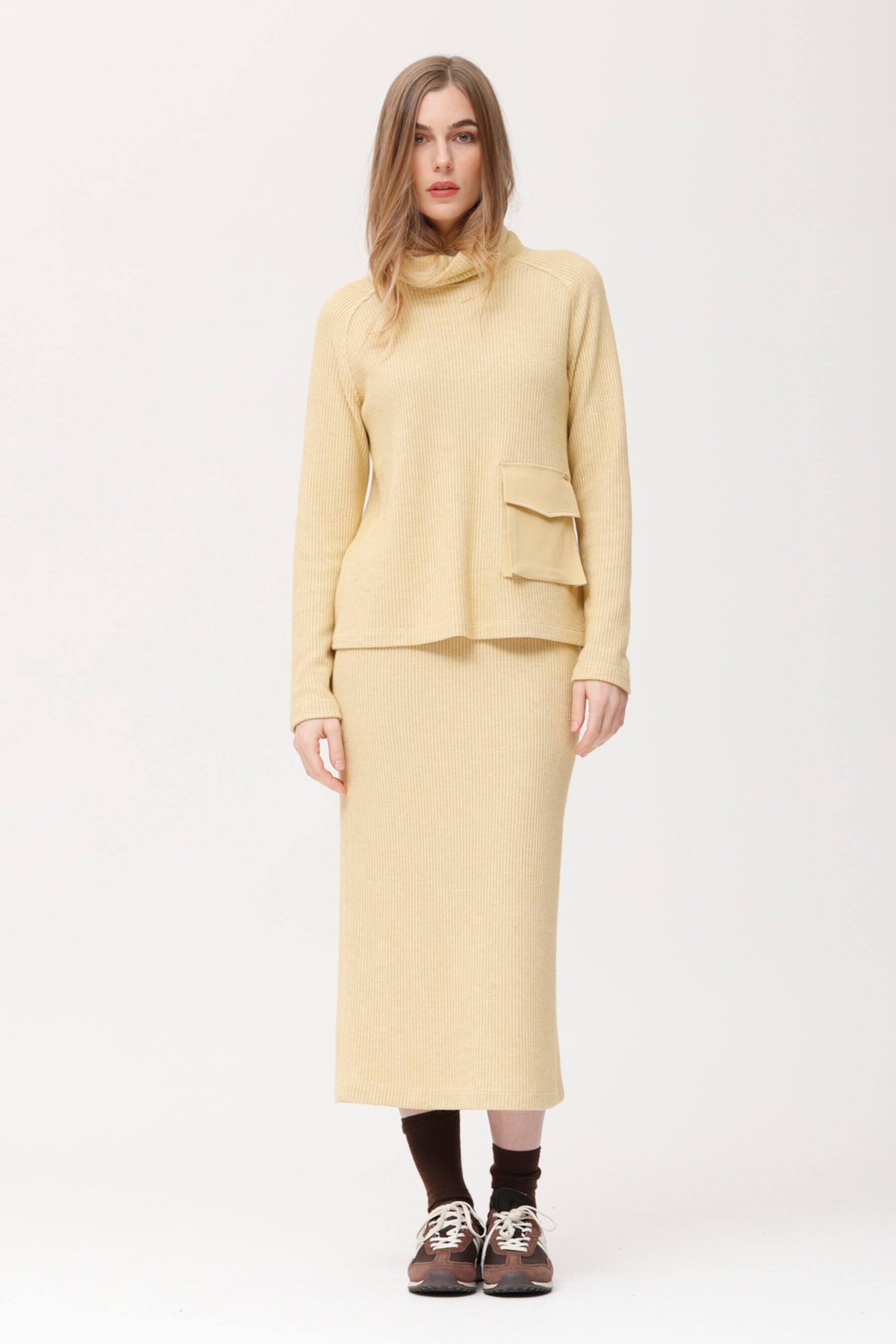 Deze lichtbeige gebreide top, gemaakt van een zachte en warme stof, heeft een rechte snit en een licht opstaande hals. Het opvallende kenmerk is de keperzak aan de voorkant, die zowel textuurcontrast als functionaliteit aan het ontwerp toevoegt. De lange mouwen en minimalistische stijl maken hem perfect te combineren met rokken of broeken, waardoor moderne outfits ontstaan voor zowel dagelijks gebruik als casual gelegenheden. Het zakdetail voegt een functionele en originele touch toe.