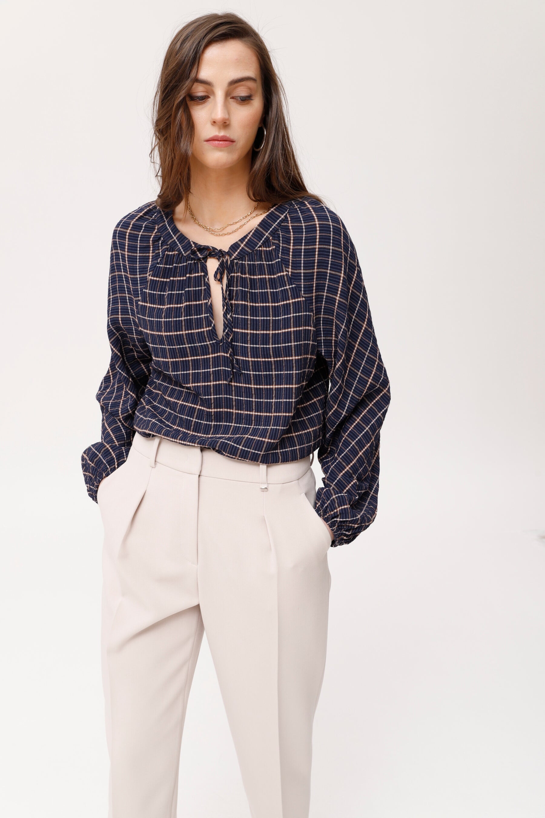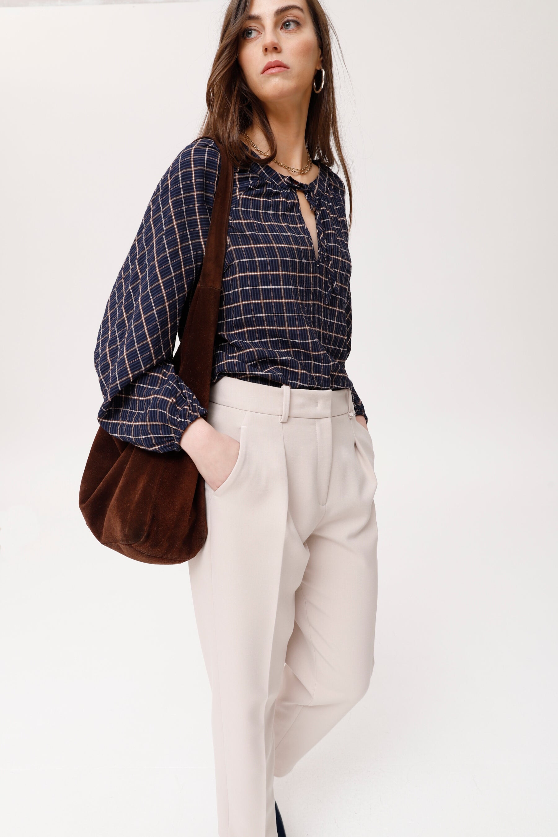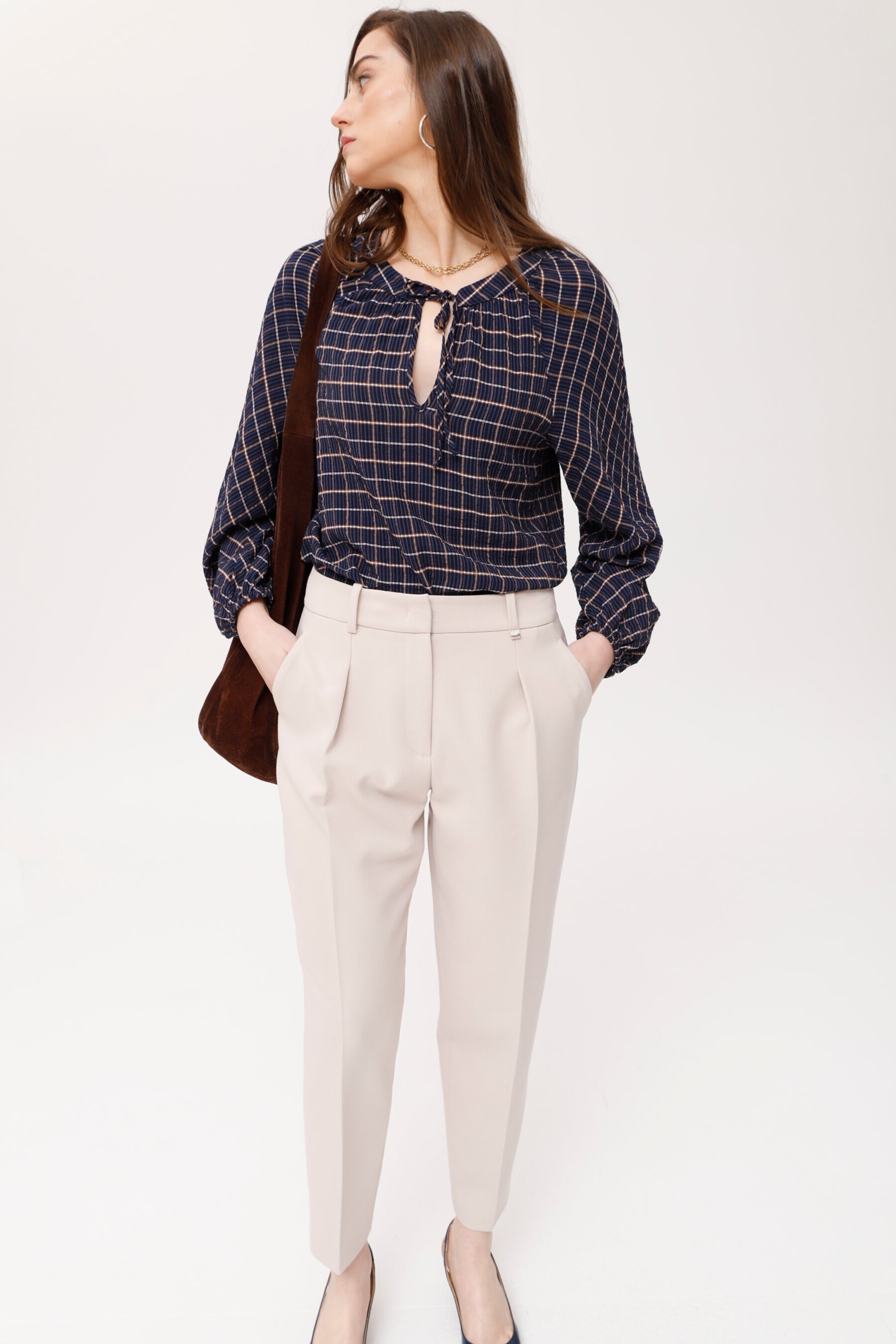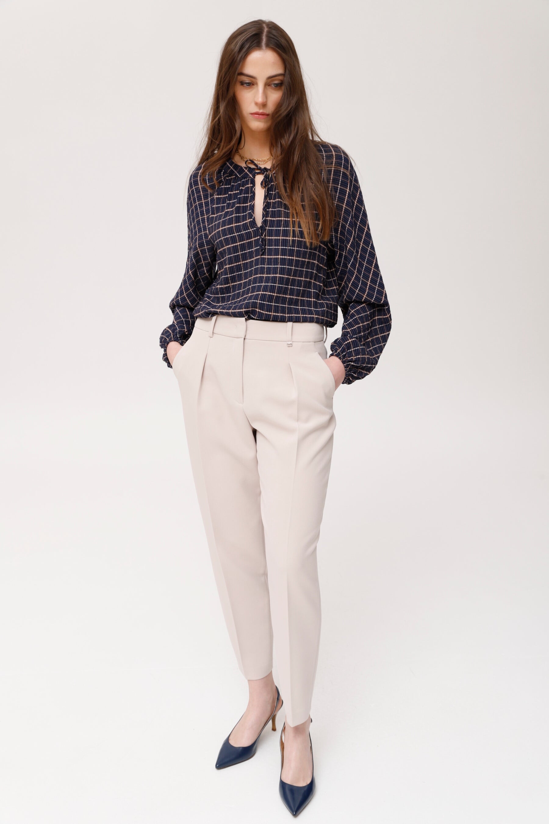 Taps toelopende broek in een lichtbeige tint, met een elegante en moderne snit. Voorzien van plooien aan de voorkant die structuur geven, een verborgen ritssluiting en steekzakken aan de zijkant, ideaal voor een verfijnde look. Breedte 16 cm, lengte 71 cm Modelhoogte 1,75 cm