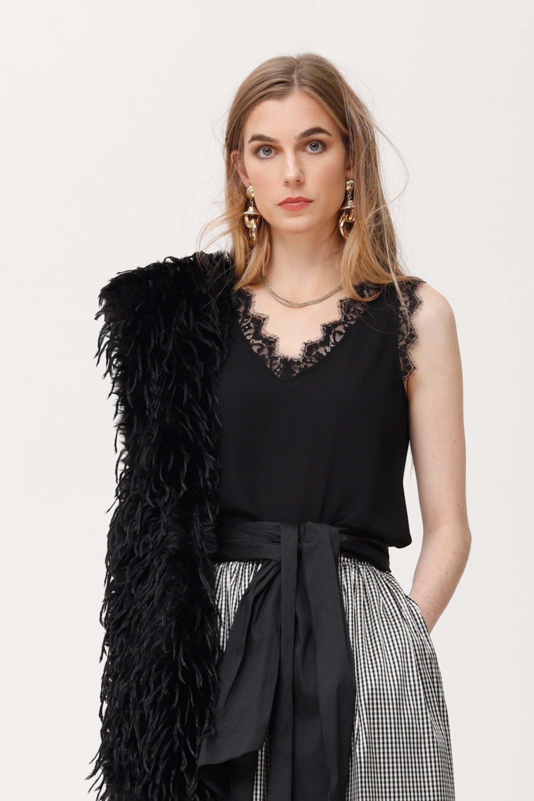 Mouwloze top van zwarte chiffon met een V-hals en delicate ton-sur-ton kanten afwerking. Het lichte, luchtige en elegante ontwerp maakt hem ideaal voor zowel feestelijke als casual looks. De soepele drapering zorgt voor beweging en een fris gevoel, terwijl de transparante afwerking geschikt is voor laagjes of lingerie eronder. Een veelzijdig en vrouwelijk item, perfect om bij elke gelegenheid op te vallen.