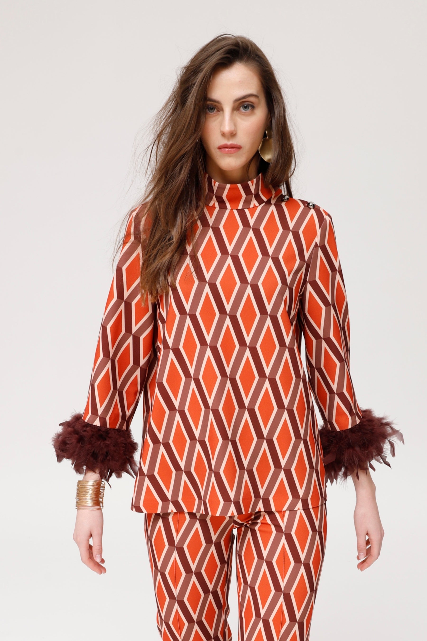 Een losvallende crêpe top met geometrische prints in terracotta en bordeauxrode tinten, rechte mouwen en verendetails aan de manchetten. De top heeft een hoge hals, een knoopsluiting aan de zijkant en een relaxte pasvorm voor maximaal comfort. De vloeiende stof en het opvallende design maken dit kledingstuk een ideale keuze voor gasten, speciale evenementen of stijlvolle urban looks. Perfect om bij elke gelegenheid op te vallen met een vleugje retro verfijning.