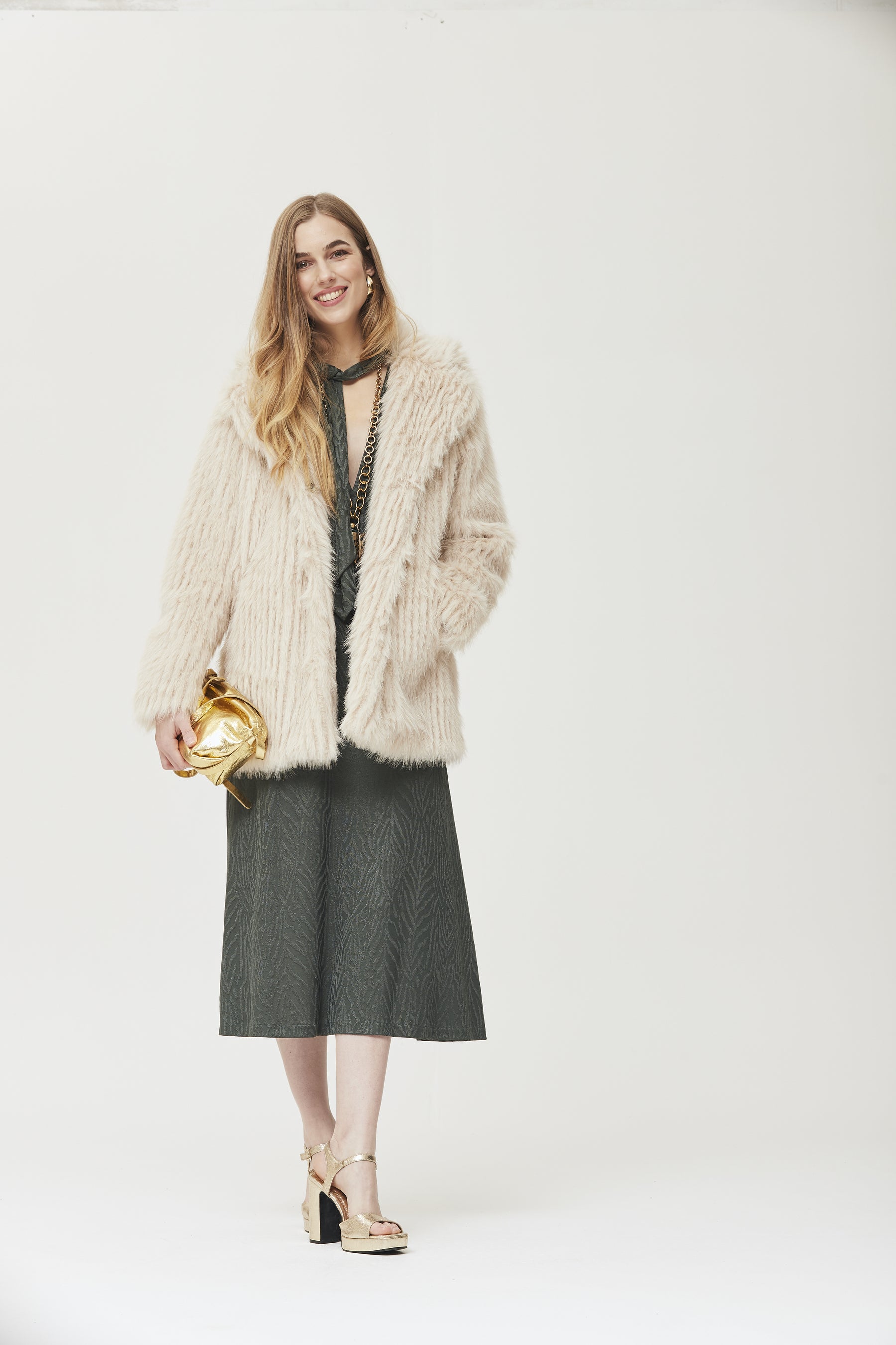 Lange jurk gemaakt van zachte, rekbare, flesgroene jacquardjersey met zebraprint. Het ontwerp heeft een diepe V-hals, een halterstrik en lange, getailleerde mouwen en combineert verfijning met comfort. De A-lijn flatteert het figuur en zorgt voor bewegingsvrijheid, terwijl de gebreide stof de hele dag comfort biedt. Perfect voor speciale gelegenheden of een casual urban look met gouden accessoires en hakken.