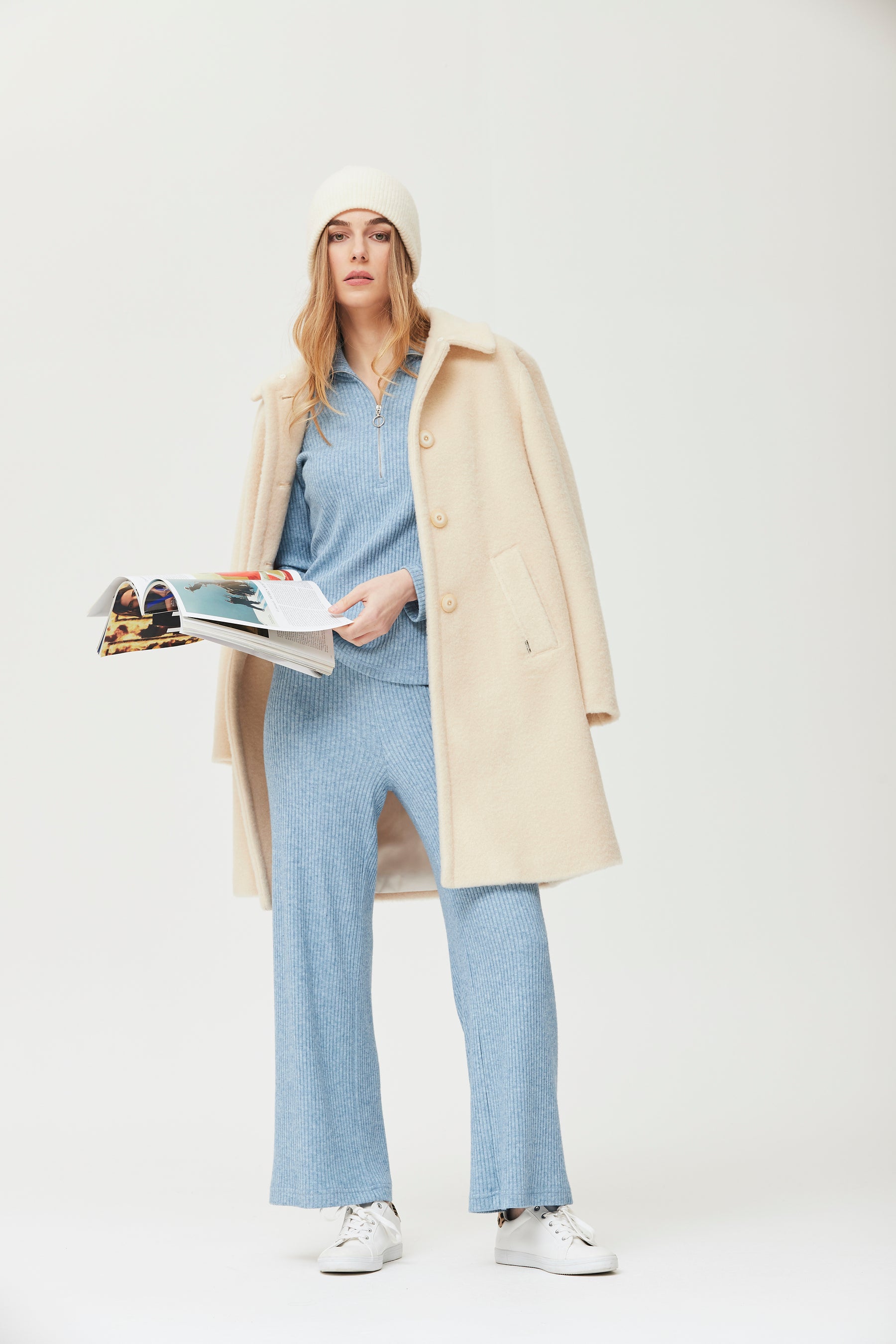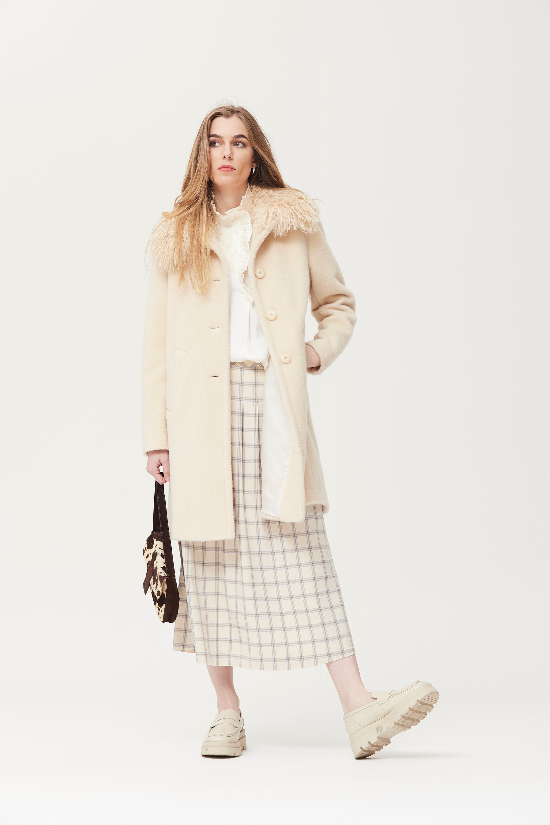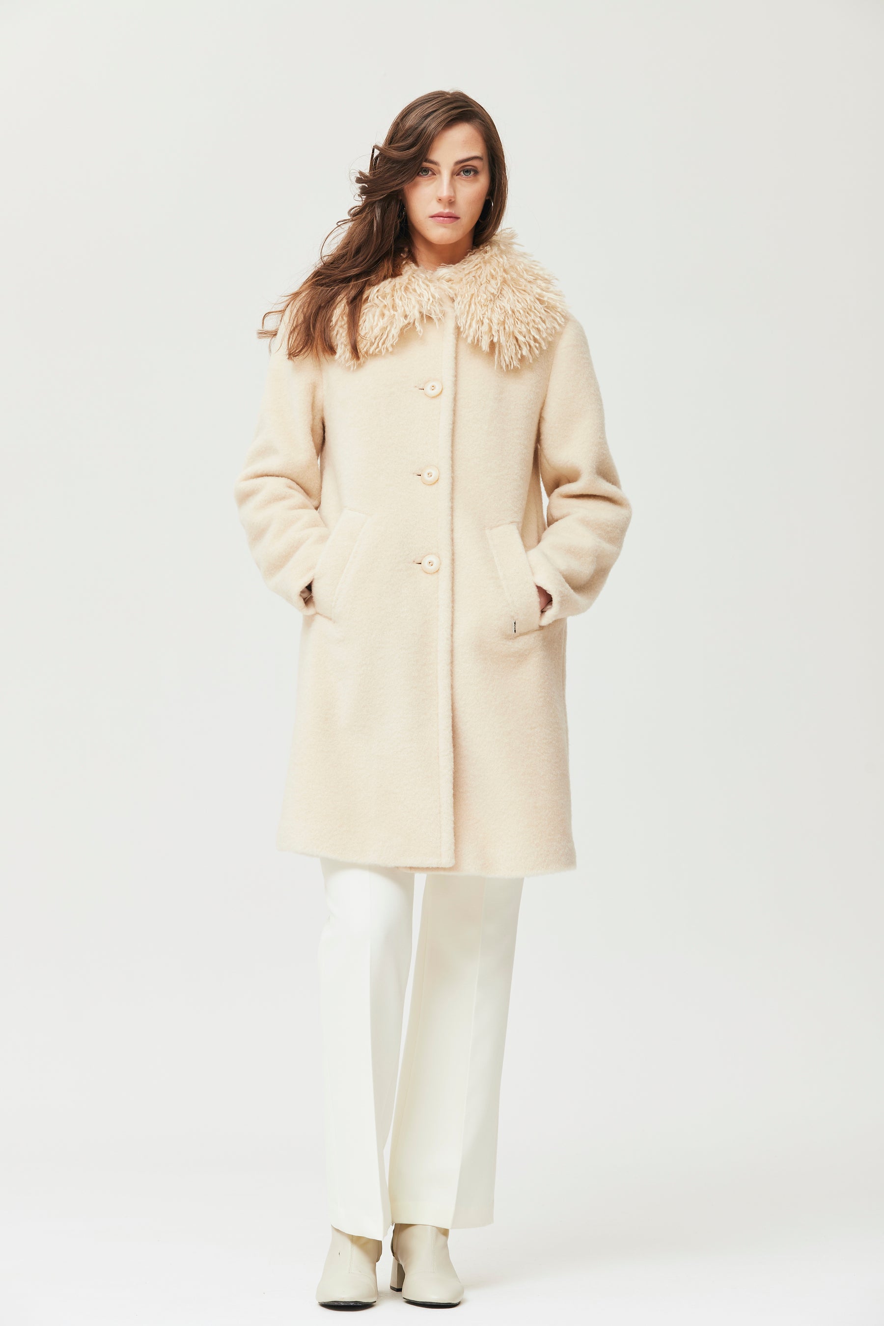 Abrigo de mujer confeccionado en punto grueso enfieltrado de tono crudo, que aporta una excelente sensación térmica y un tacto suave. destaca su diseño recto y elegante, con cierre frontal de botones y prácticos bolsillos laterales. el cuello extraíble de pelo sintético añade un toque sofisticado y permite adaptar el look según la ocasión: llévalo con el cuello para un estilo más abrigado y llamativo, o sin él para un aire minimalista y versátil. es perfecto para los meses más fríos y combina fá