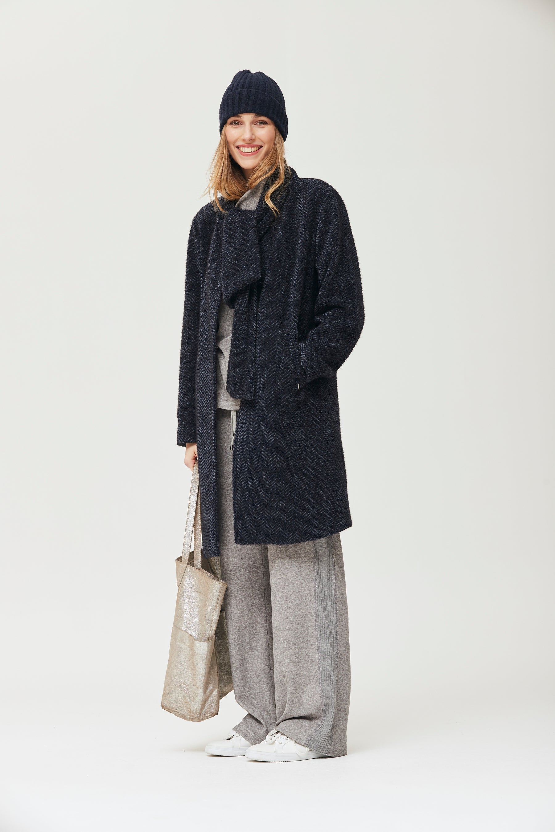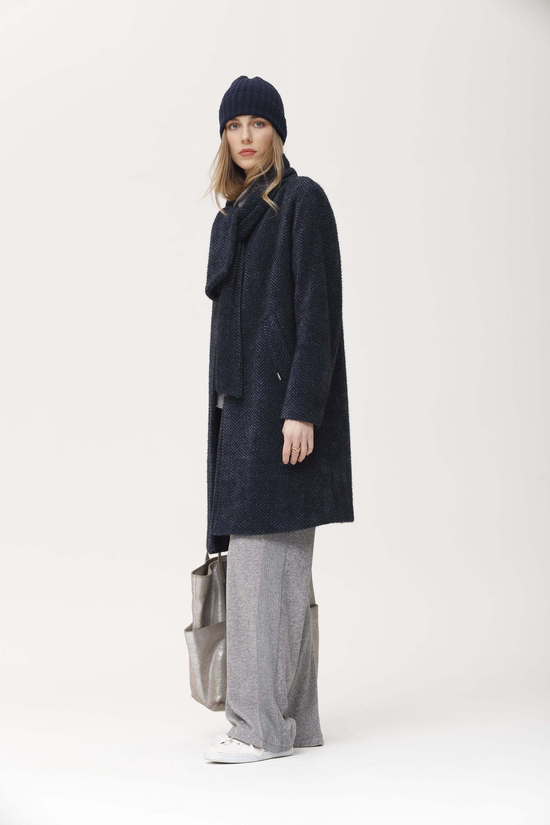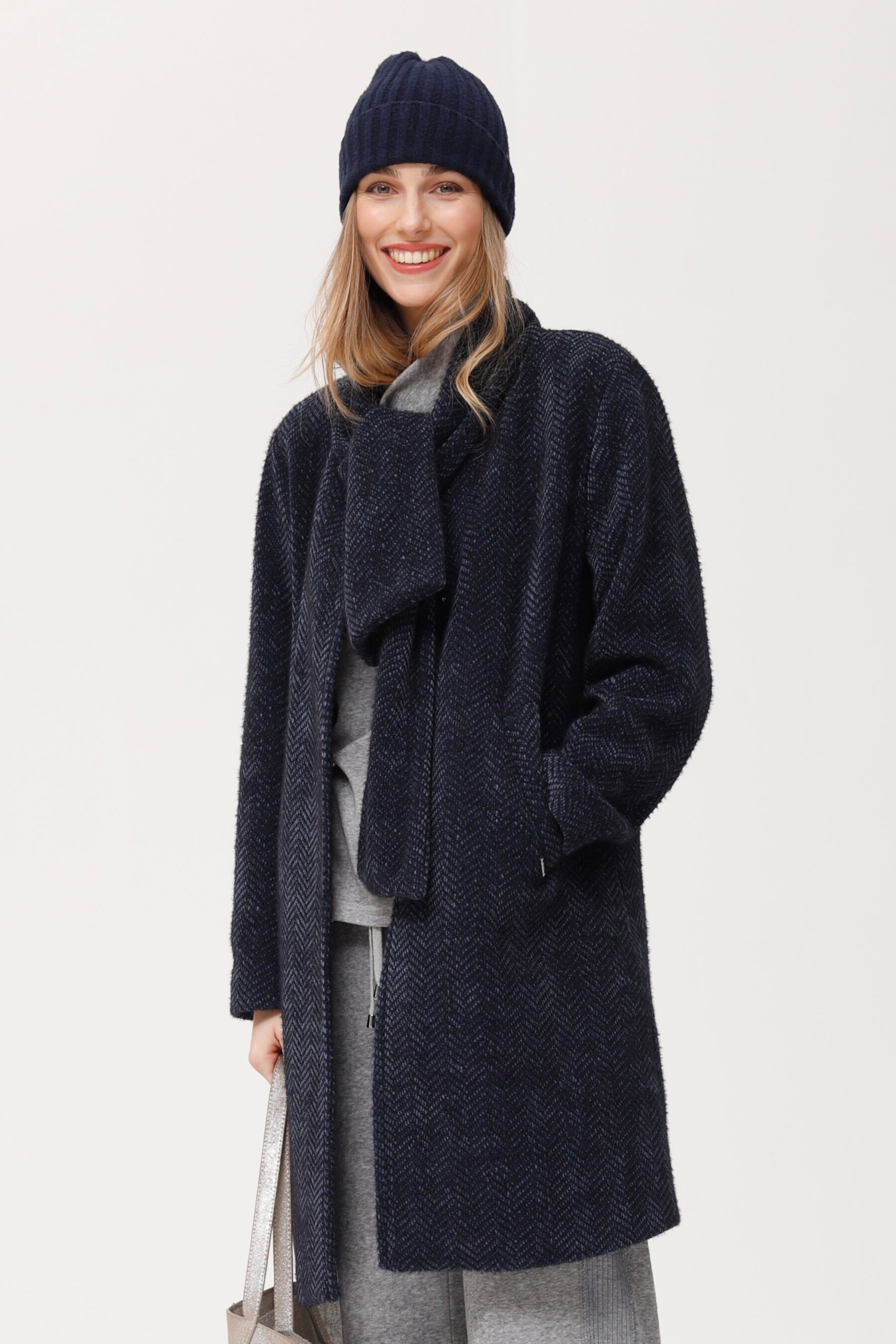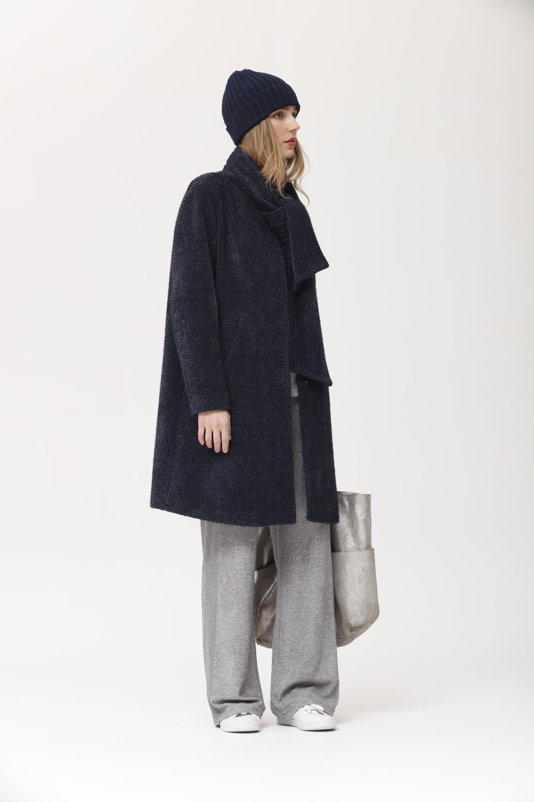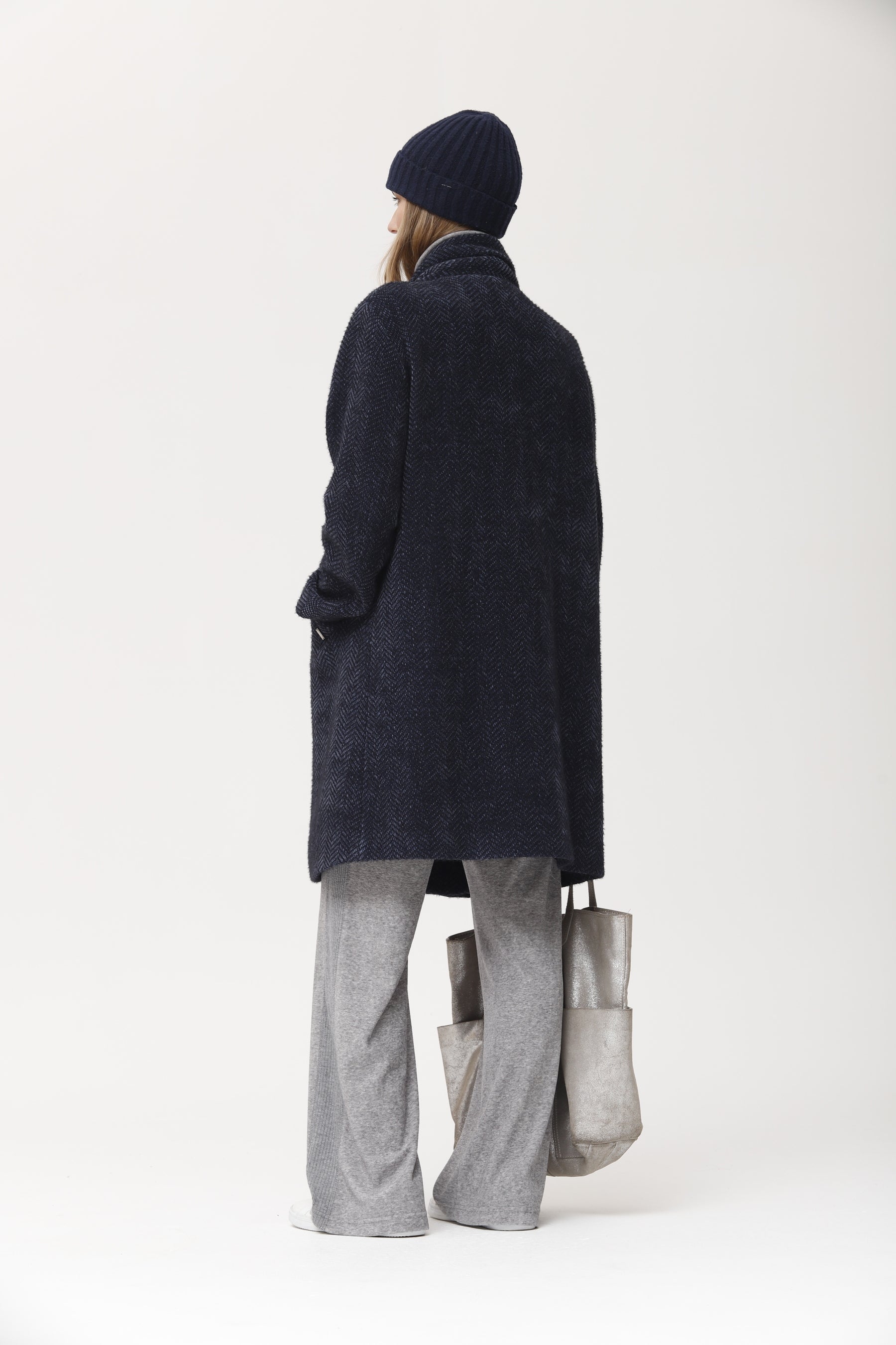 Abrigo largo confeccionado en punto espiga melange azul marino, con un efecto texturizado y cálido muy agradable al tacto. presenta corte recto, cuello alto envolvente y bolsillos laterales, proporcionando protección y estilo en los meses fríos. el tejido combina suavidad y estructura, mientras que la silueta relajada permite llevarlo con looks urbanos, terciopelo o prendas de punto. ideal para un estilo casual chic y fácil de combinar en cualquier ocasión.