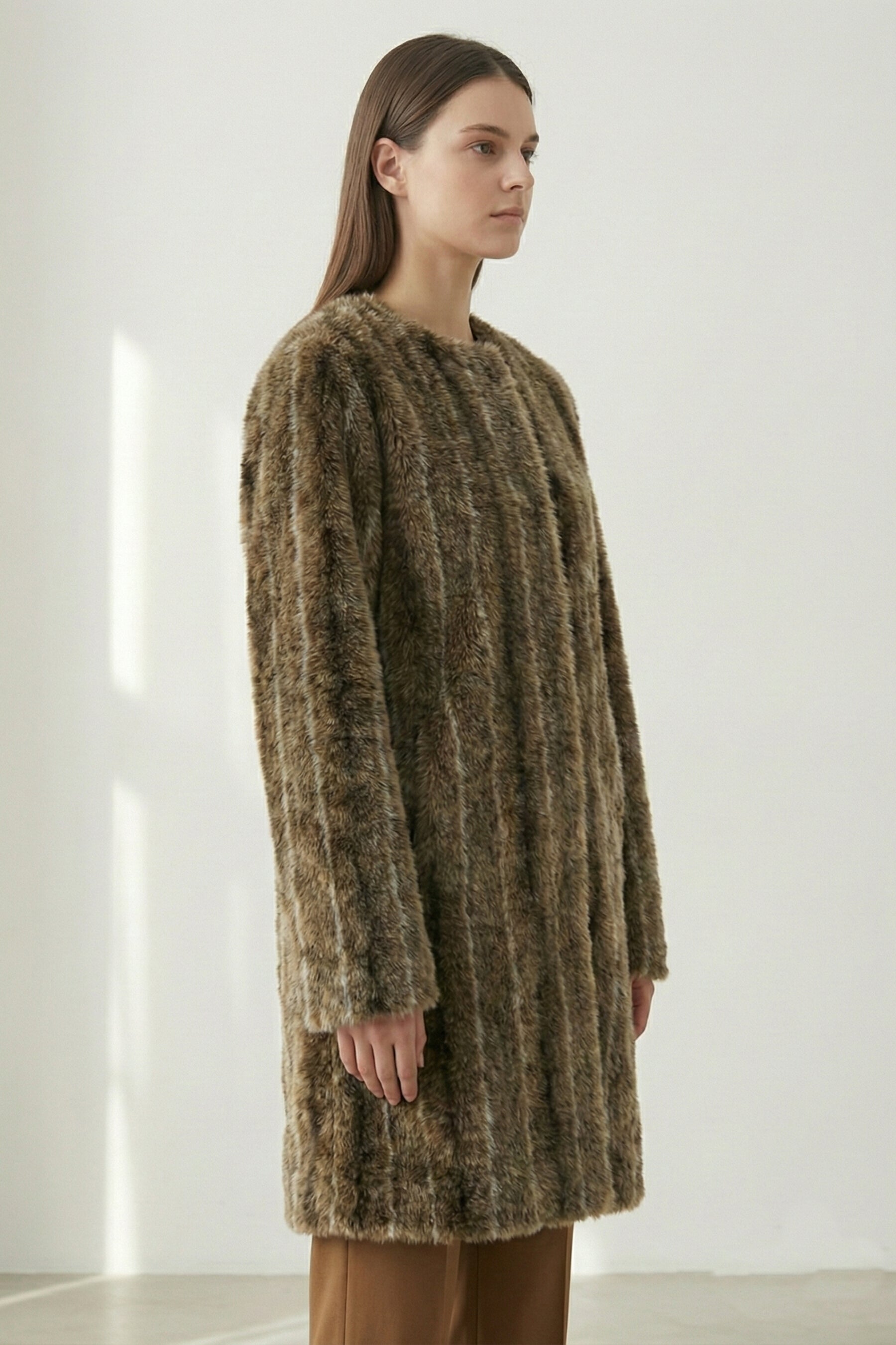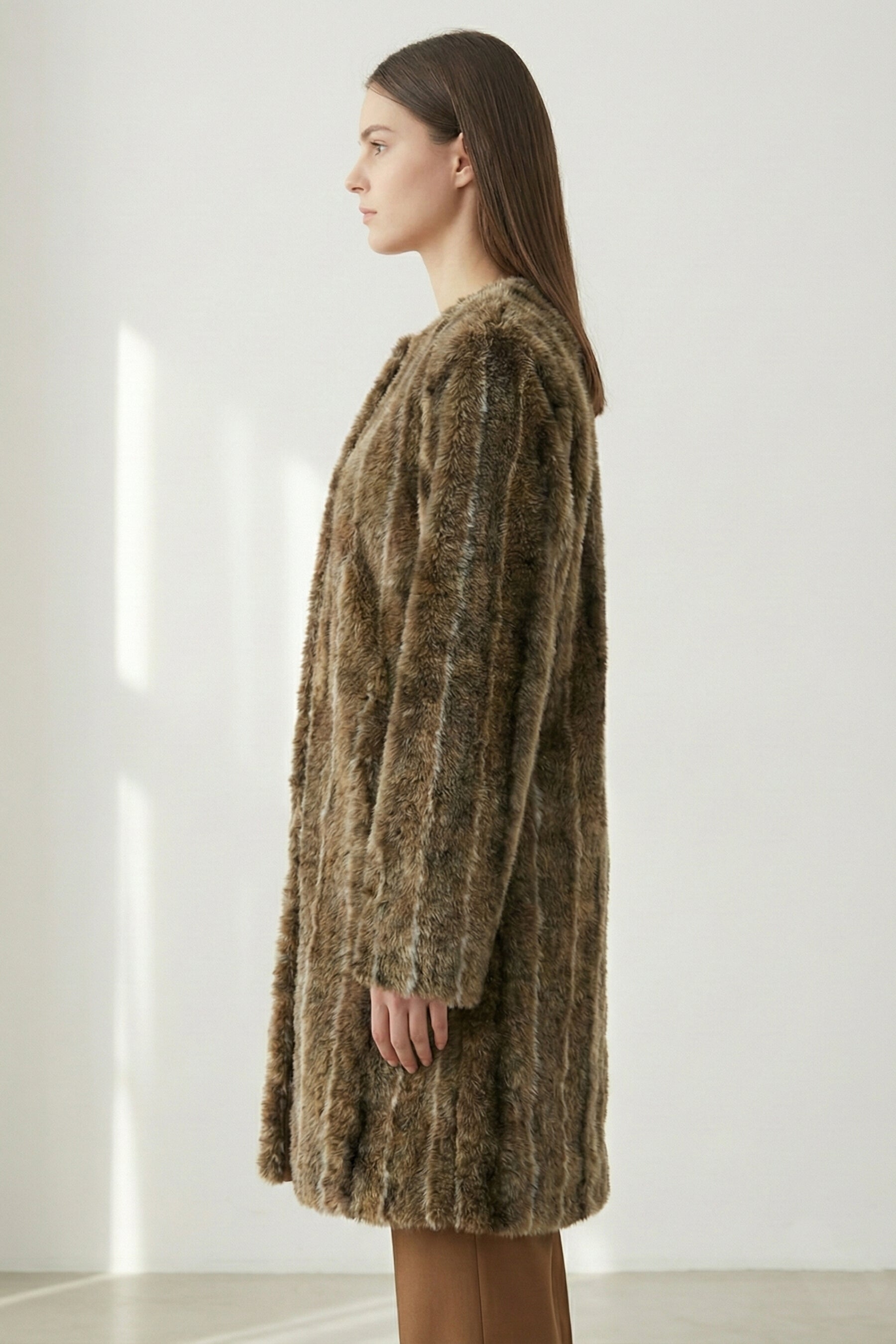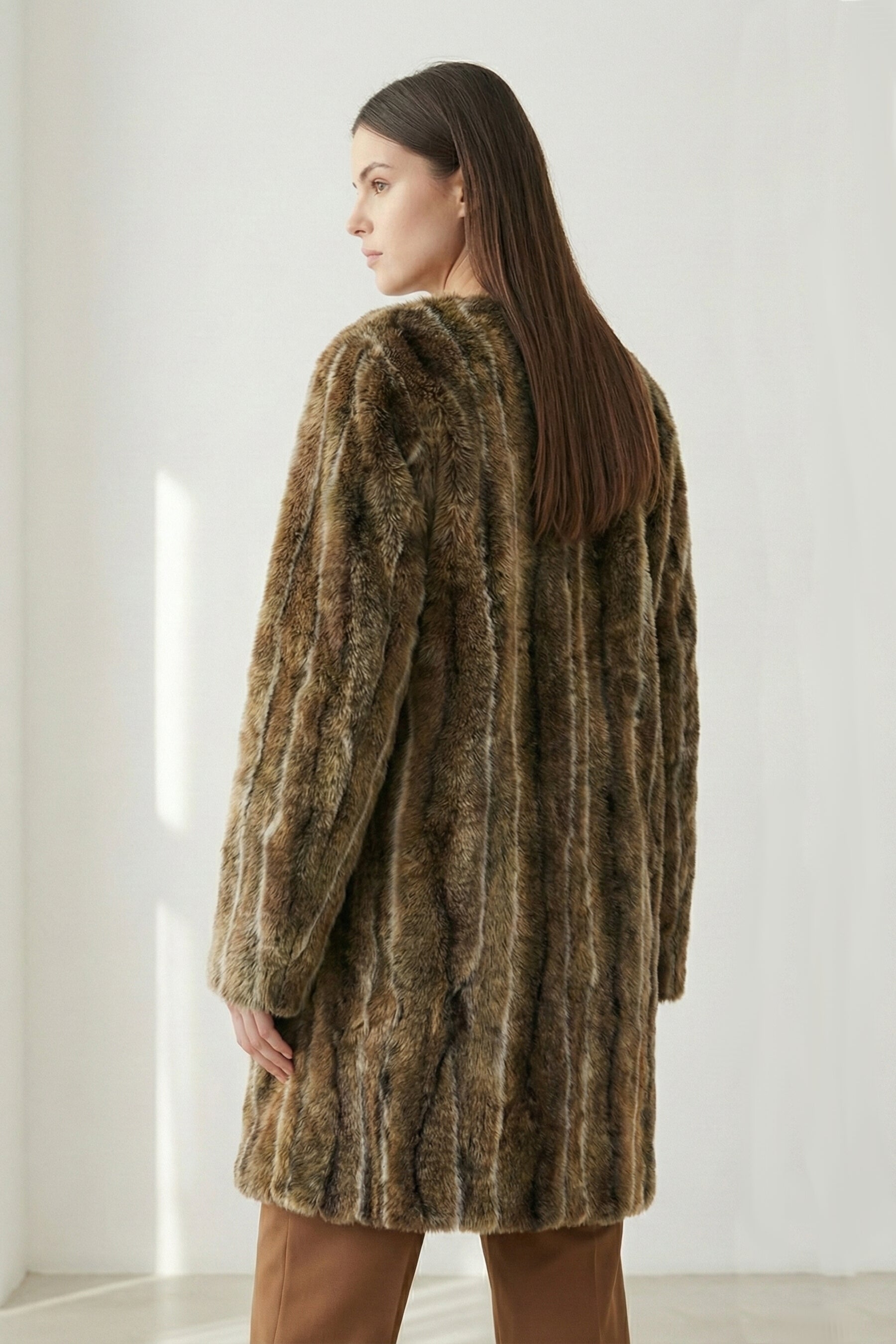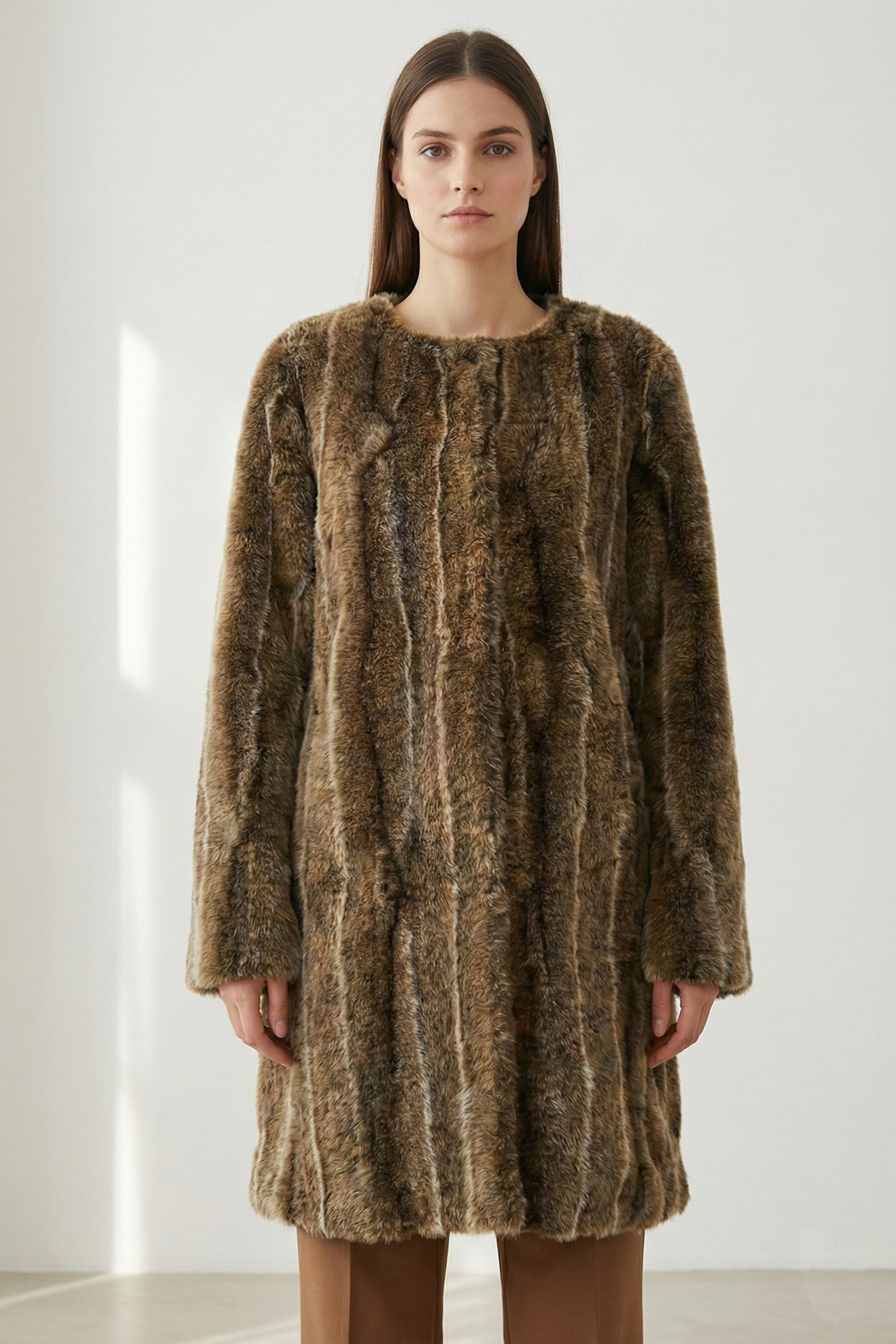Abrigo OKY^COKY de pelo artificial con acabado muy suave y voluminoso en tono marrón jaspeado, que aporta un aspecto cálido y sofisticado. Presenta corte recto por encima de la rodilla, mangas largas y bolsillos laterales, ideal para el día a día en los meses más fríos. Se cierra en la parte frontal y su interior forrado asegura comodidad y un mejor deslizamiento sobre las prendas de debajo.