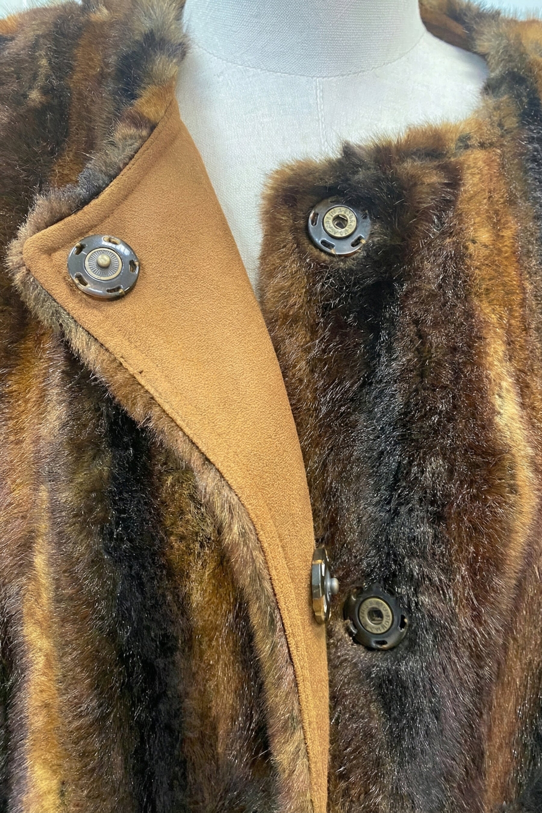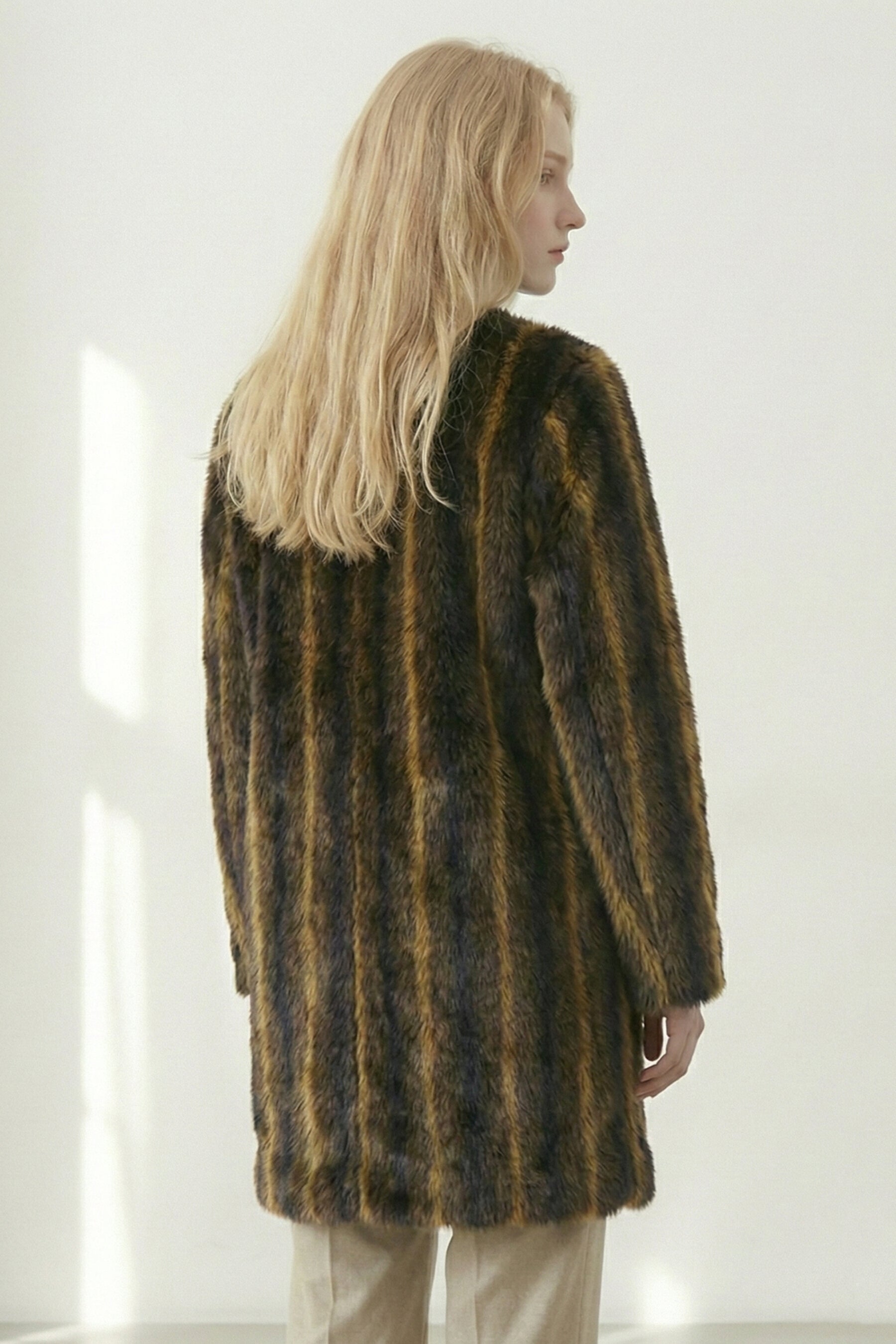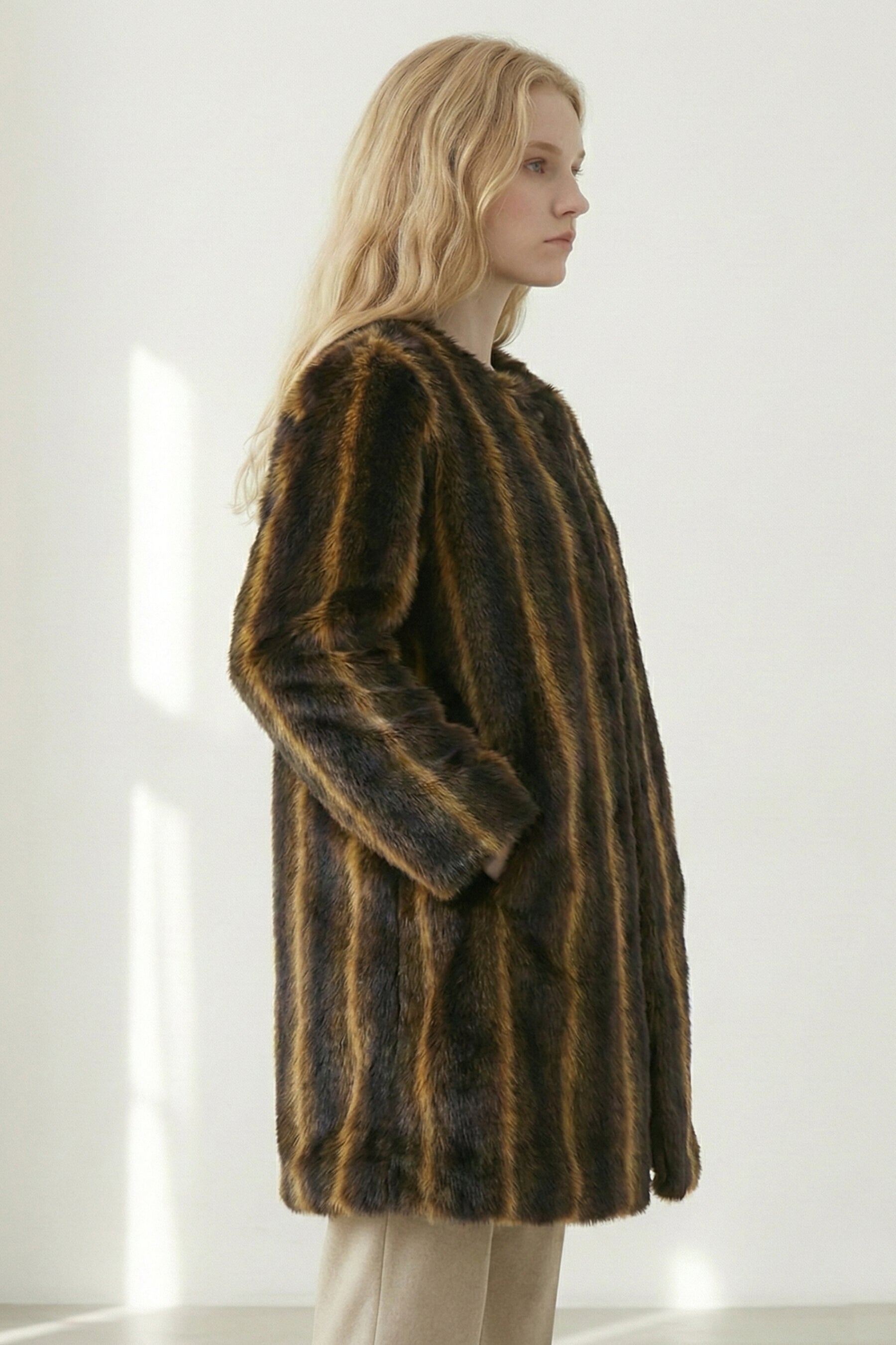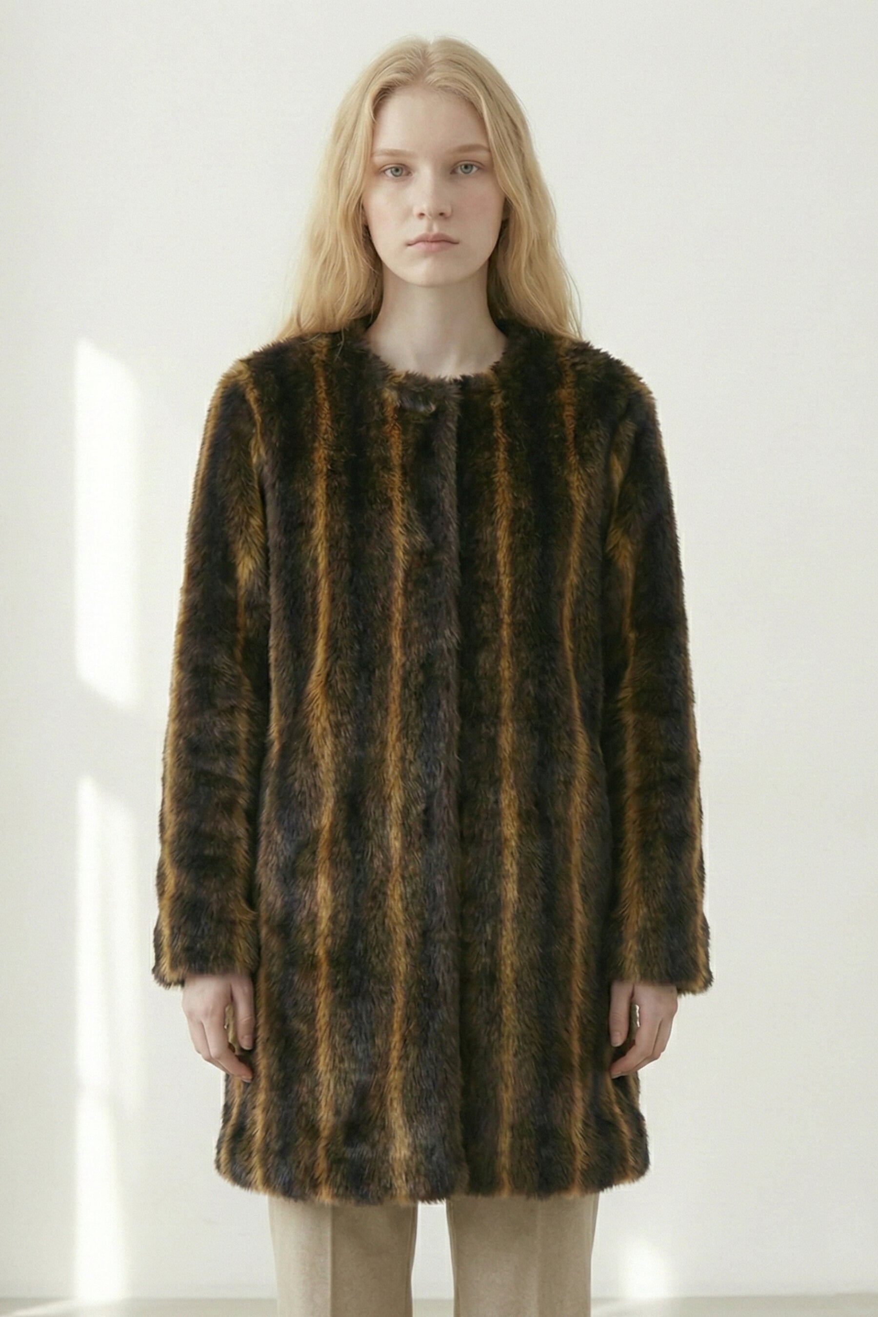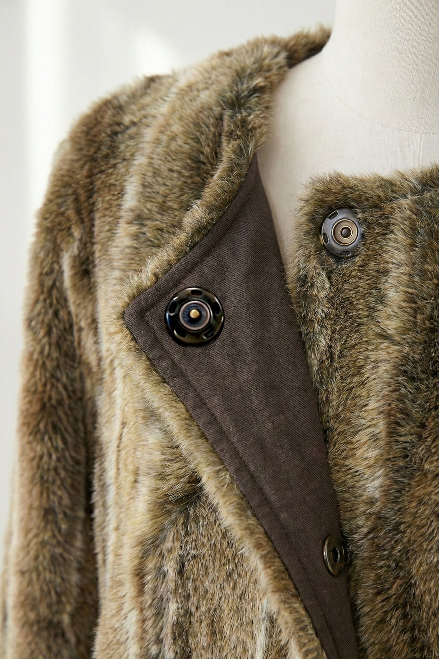 Abrigo OKY^COKY de pelo artificial con acabado muy suave y voluminoso en tono marrón jaspeado, que aporta un aspecto cálido y sofisticado. Presenta corte recto por encima de la rodilla, mangas largas y bolsillos laterales, ideal para el día a día en los meses más fríos. Se cierra en la parte frontal y su interior forrado asegura comodidad y un mejor deslizamiento sobre las prendas de debajo.
