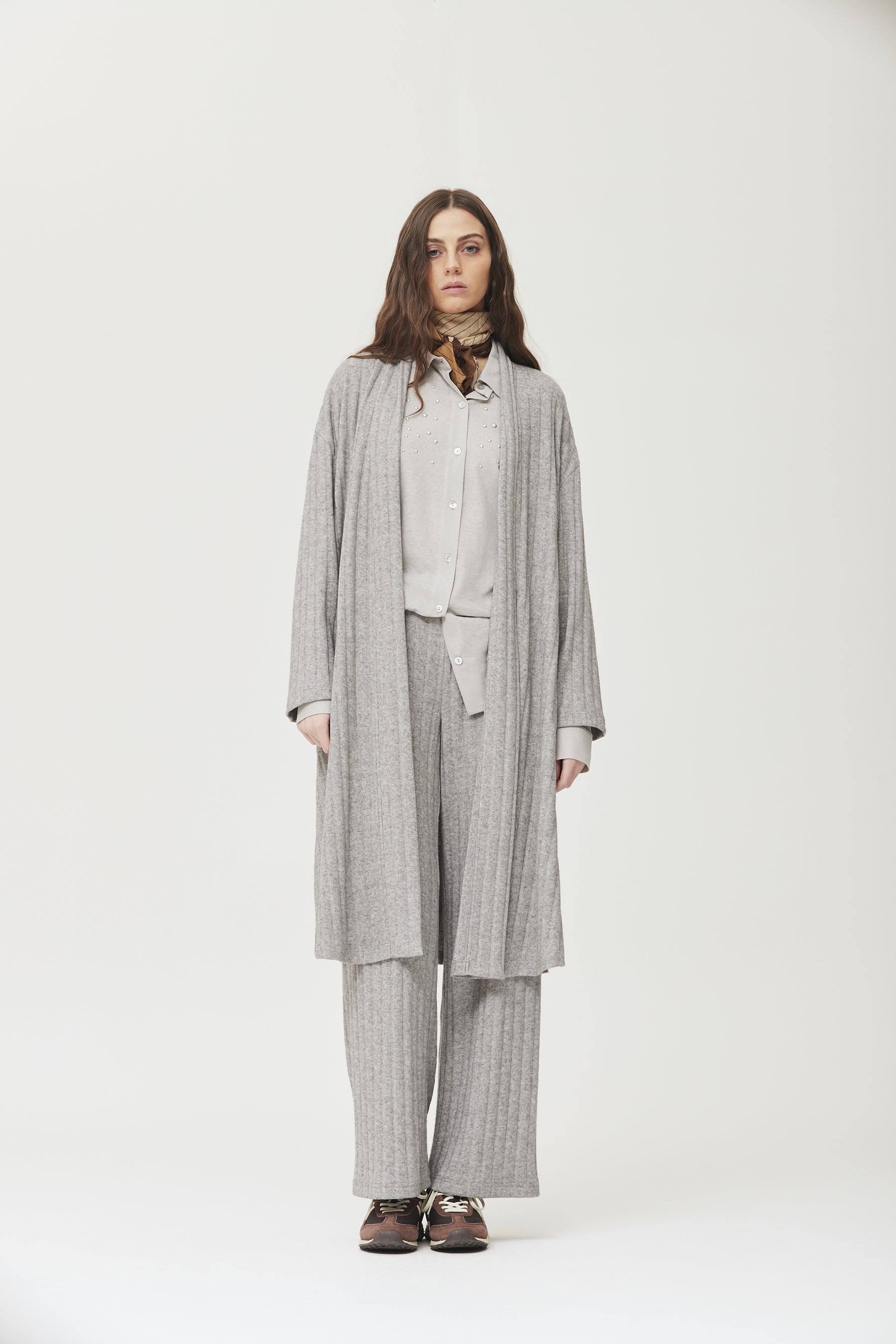 Blusa de punto de lino en color gris claro con cuello clásico y cierre de botones delanteros. presenta delicados detalles de pequeñas perlas en el pecho, que aportan un toque sofisticado y femenino. su corte relajado y tejido suave la convierten en una prenda ideal para looks cómodos y chic, perfecta para cualquier ocasión.