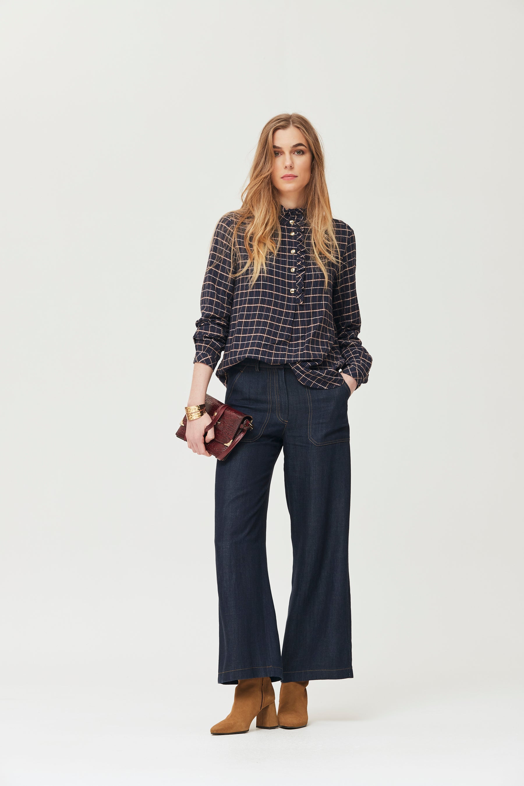Camisa Manga Larga Con Cuello Caja Alto Y Adorno De Volante En Cuello Y Escote