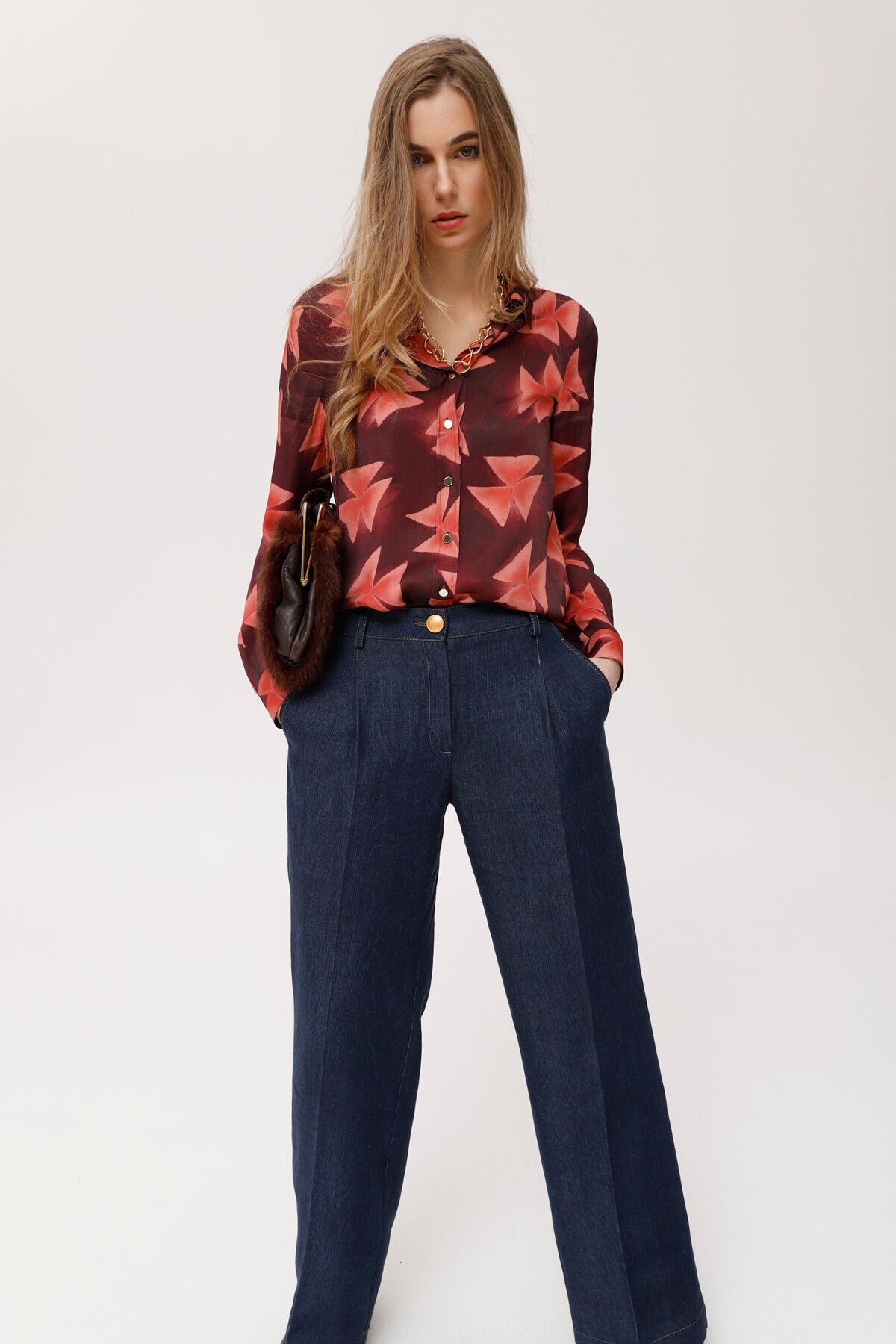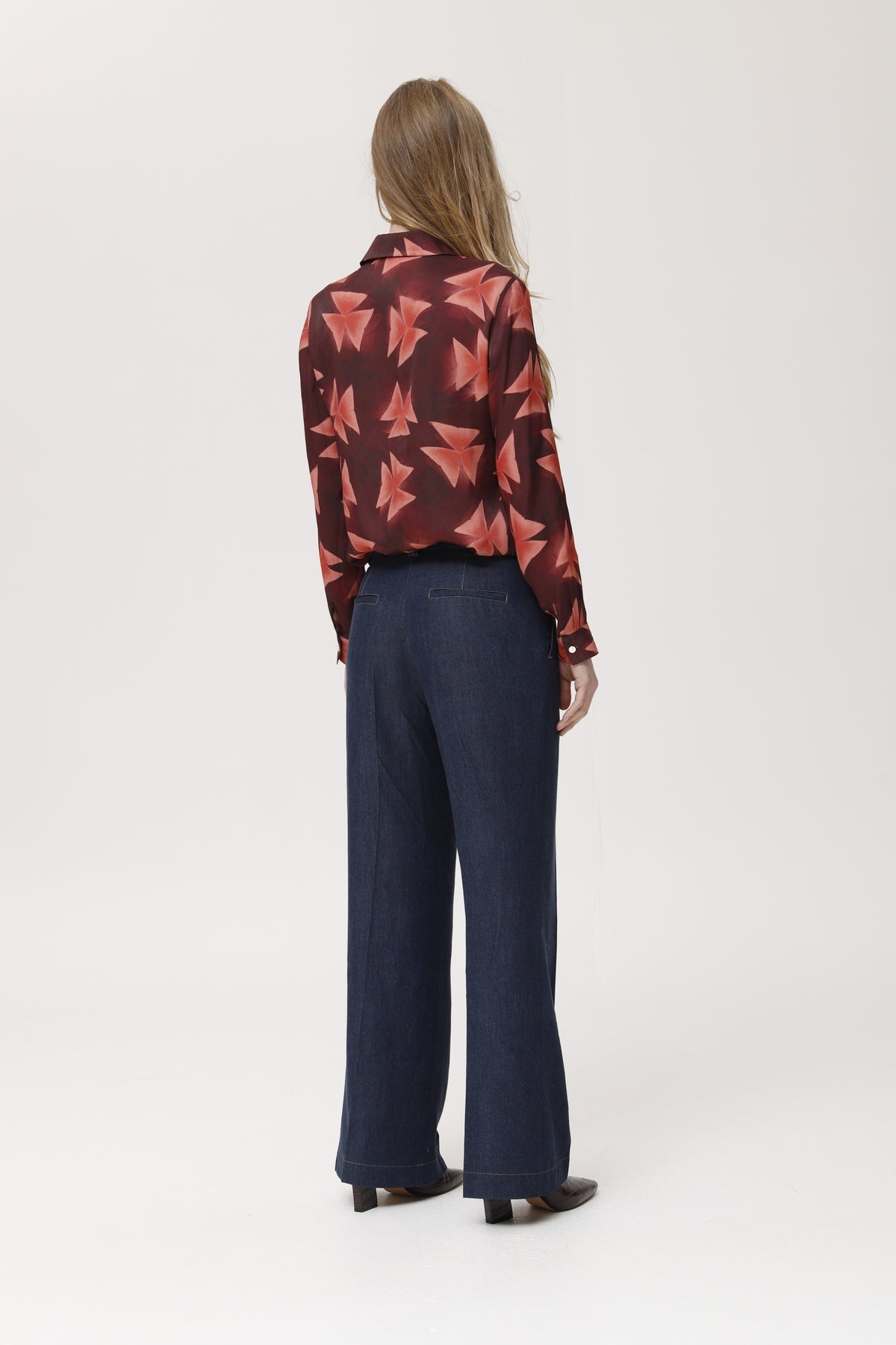 Camisa confeccionada en viscosa ecovero con estampado geométrico en tonos burdeos y beige. su tejido sostenible ofrece una textura suave, fluida y respetuosa con el medio ambiente. con corte recto, cuello clásico y cierre frontal de botones, esta prenda resulta muy cómoda y versátil. perfecta tanto para combinar con vaqueros como con faldas o pantalones de vestir, aportando un toque moderno y elegante a cualquier look, además de un compromiso con la moda responsable.