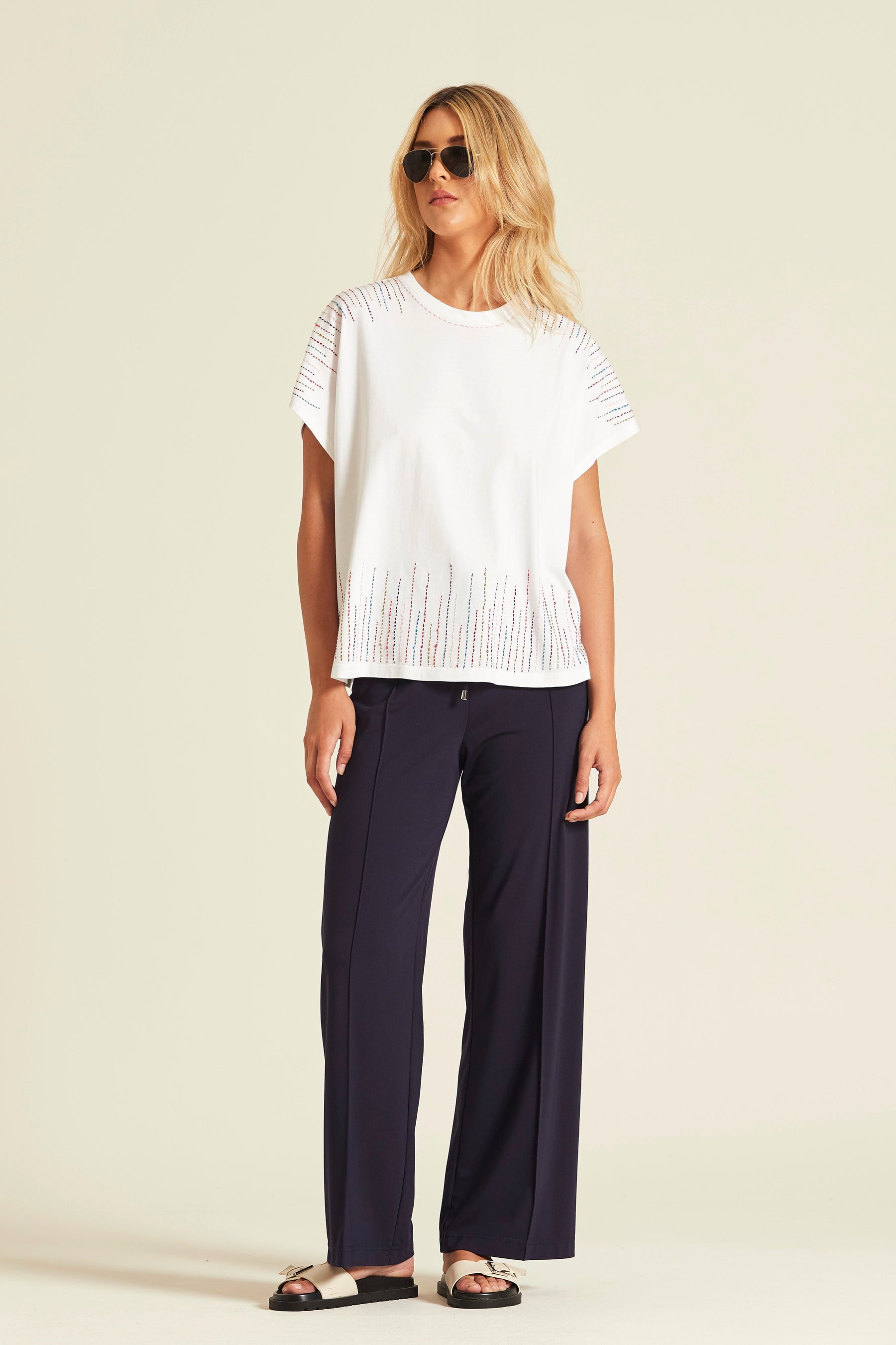 : Camiseta de silueta fluida y manga corta japonesa confeccionada en suave algodón blanco. Destaca por su diseño de pespuntes verticales en hilos multicolor que recorren los hombros y el bajo de la prenda, creando un efecto visual dinámico y artesanal.