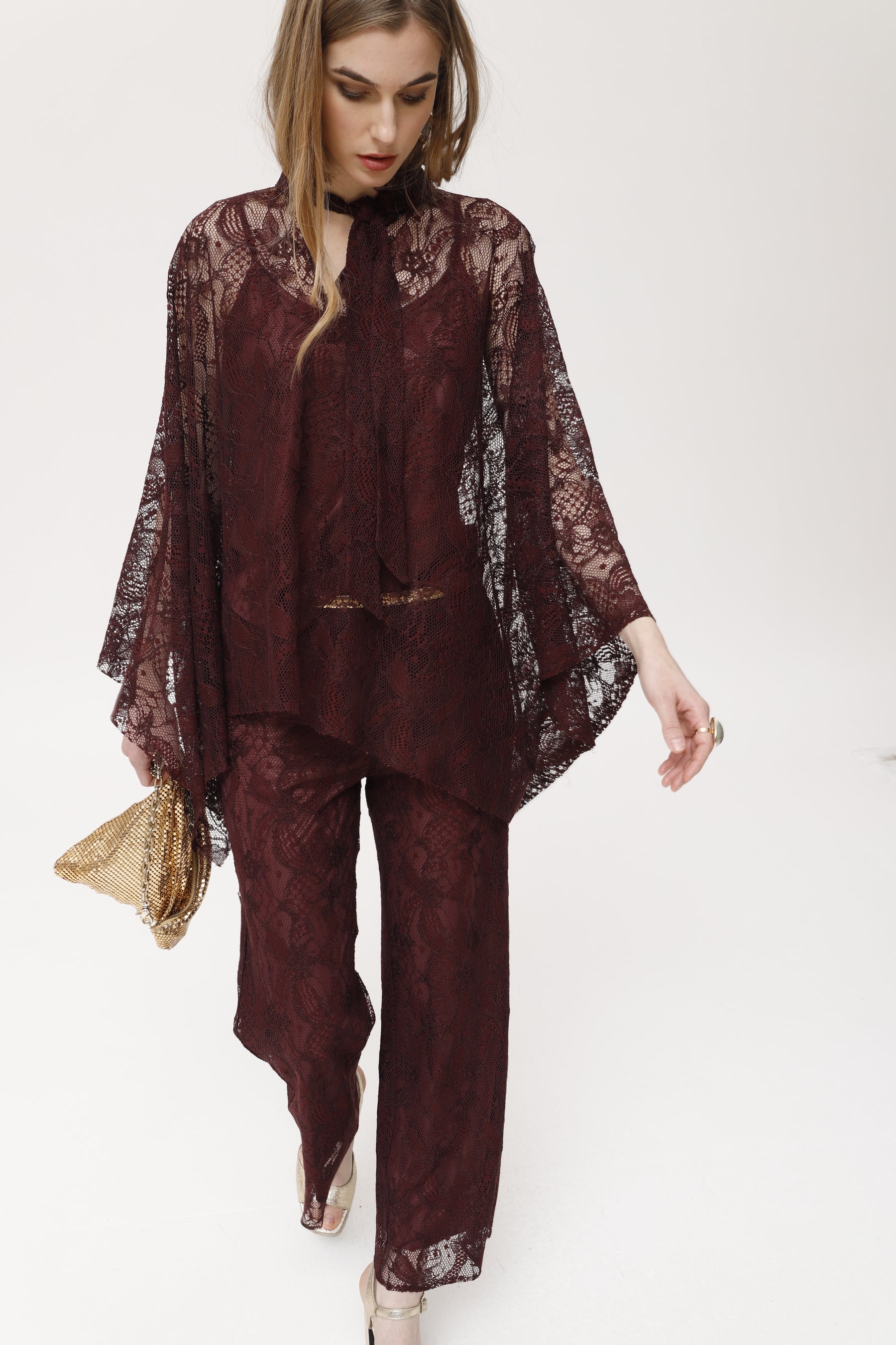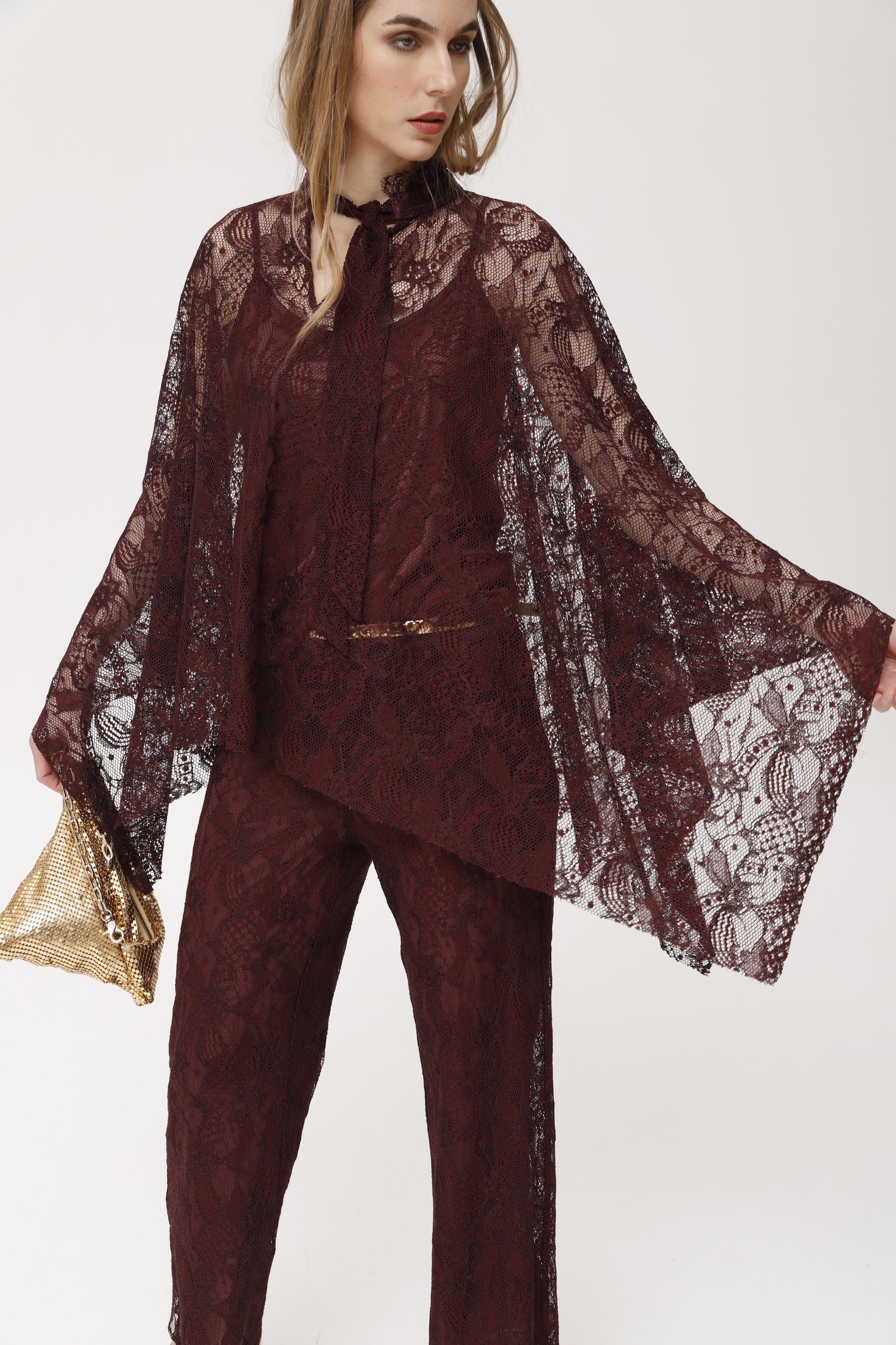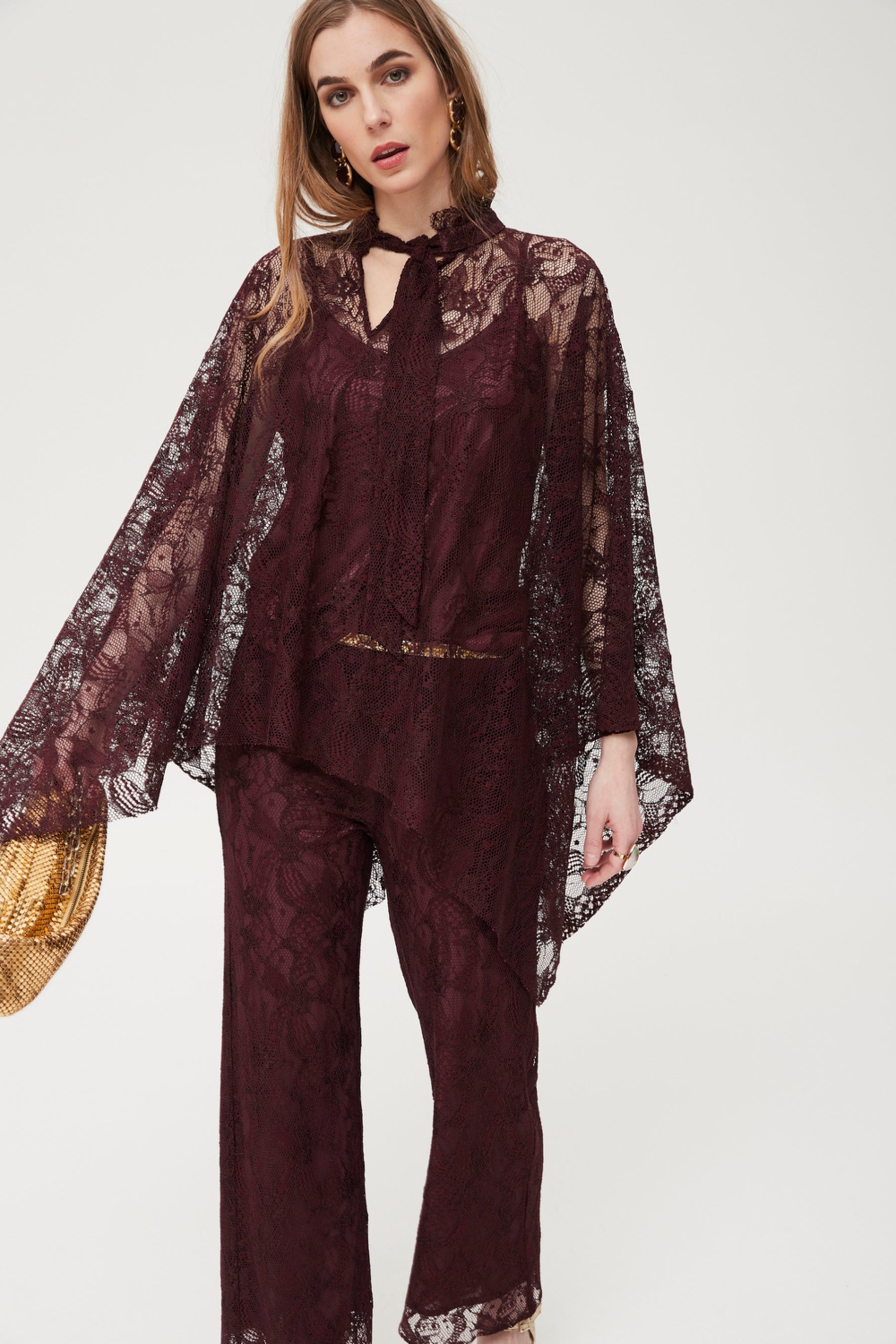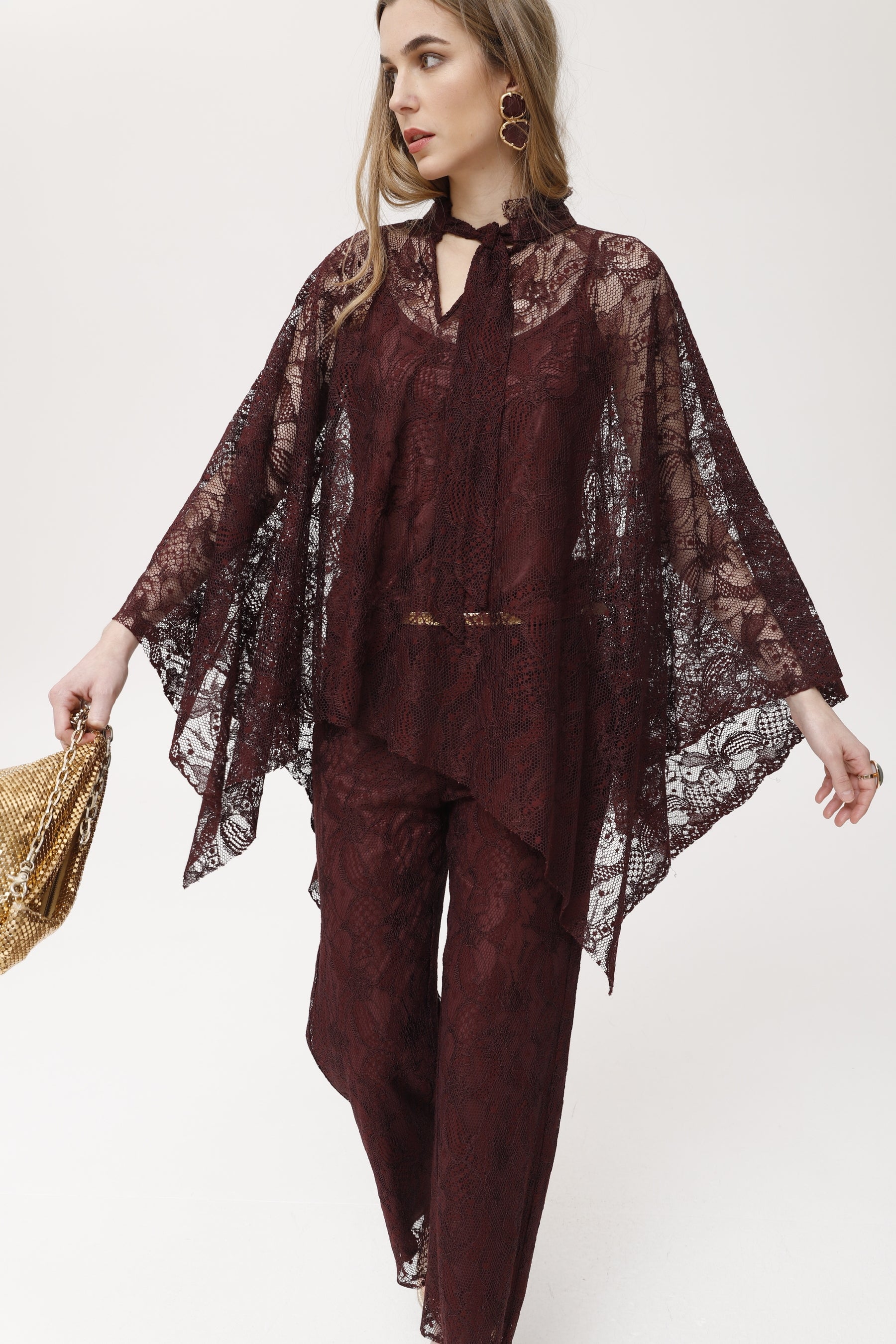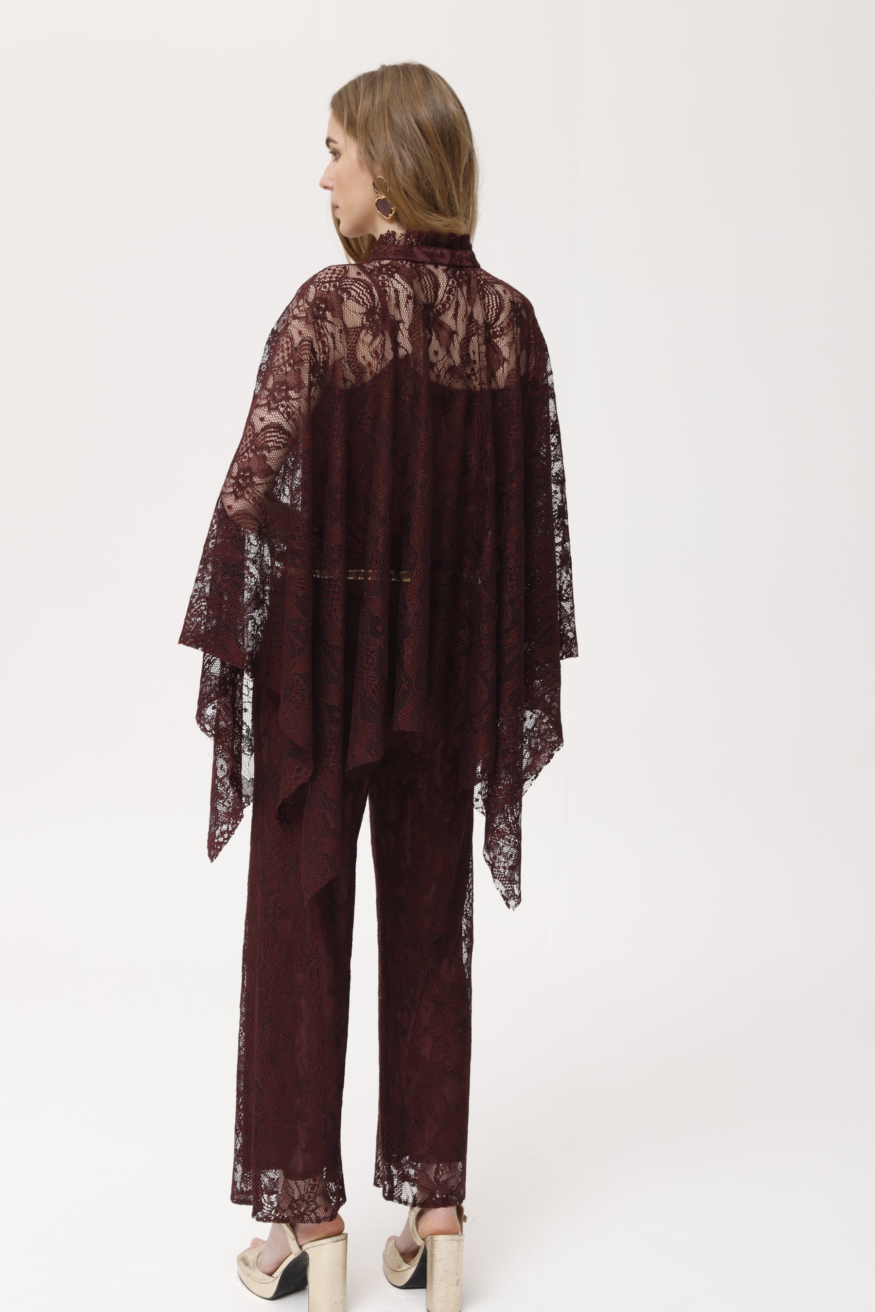 Capa de encaje confeccionada en viscosa burdeos, de textura suave y fluida. su diseño envolvente y asimétrico se acompaña de escote lazo y caída vaporosa con acabado en picos. el encaje semi-transparente aporta sofisticación a conjuntos formales, de fiesta o como prenda especial sobre básicos. destaca por su ligereza y movimiento, permitiendo crear looks originales y elegantes para eventos, cócteles o invitadas con estilo único.