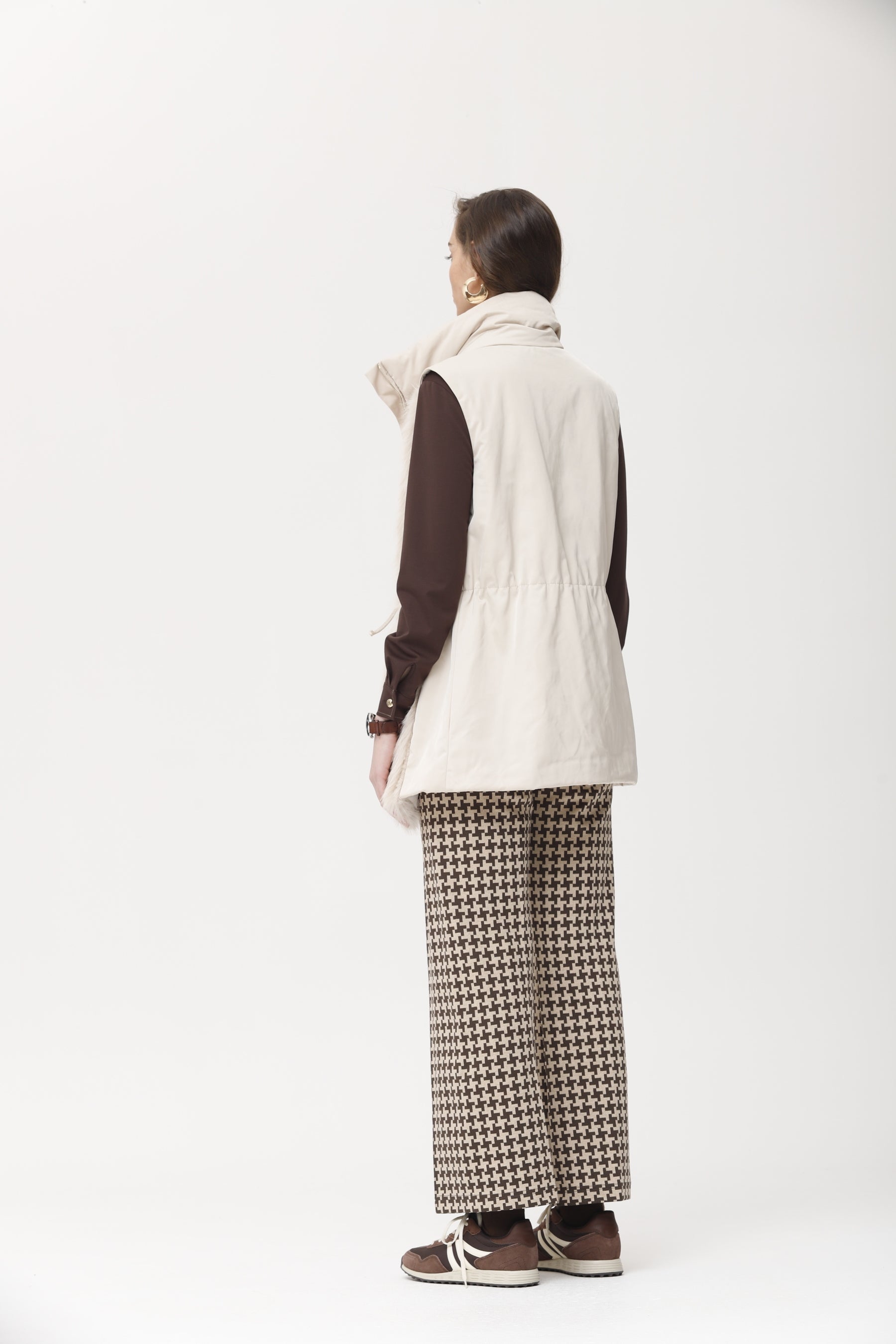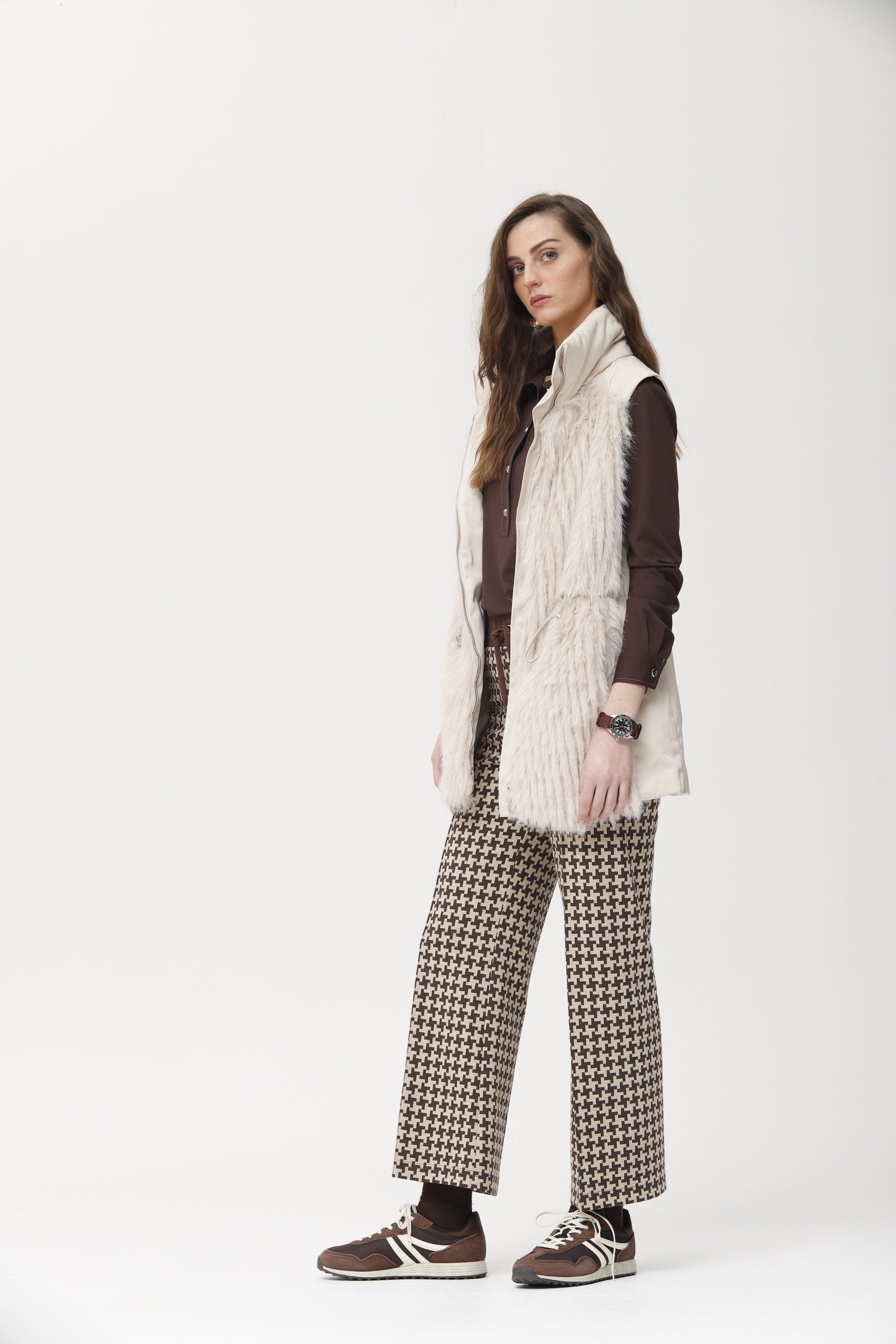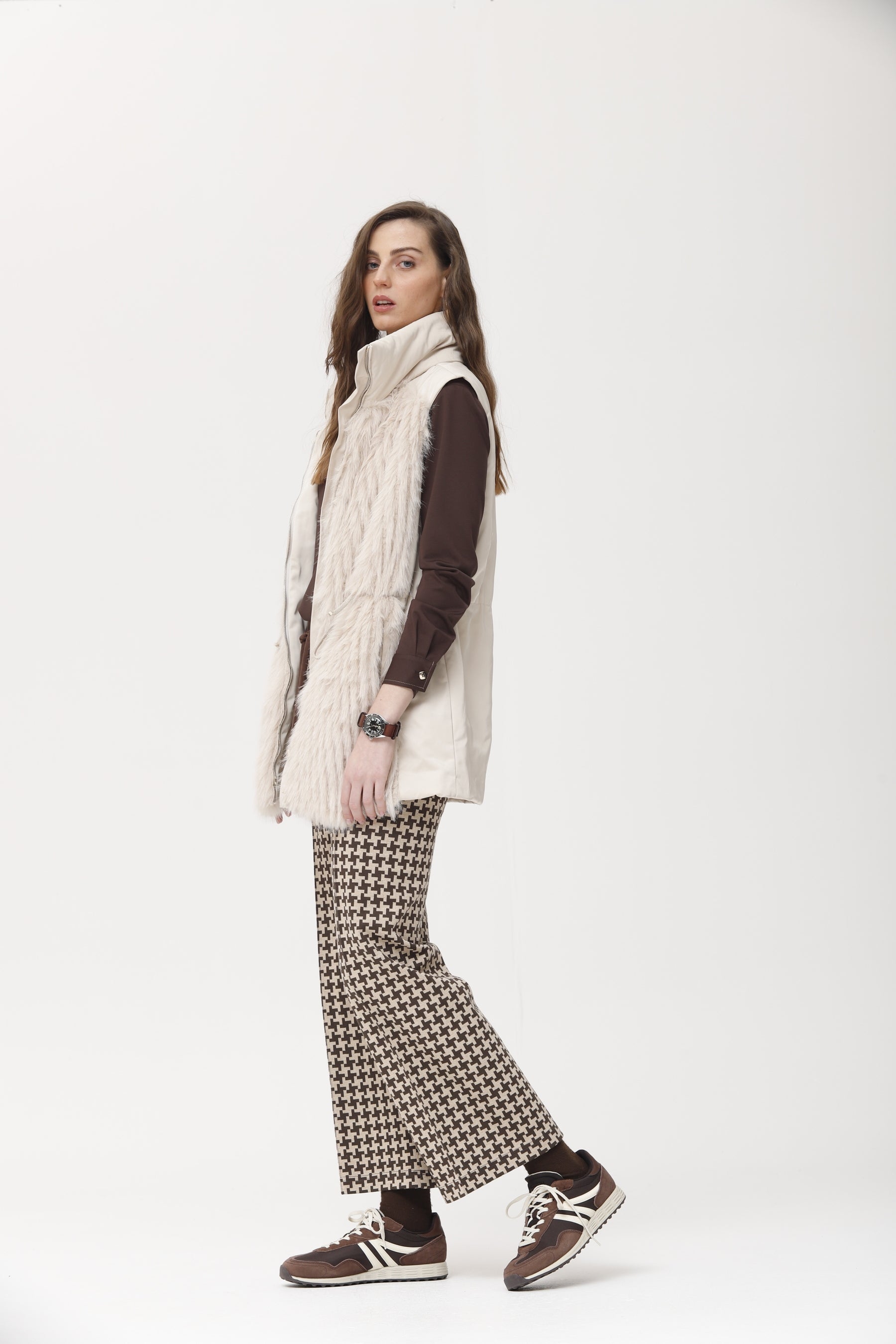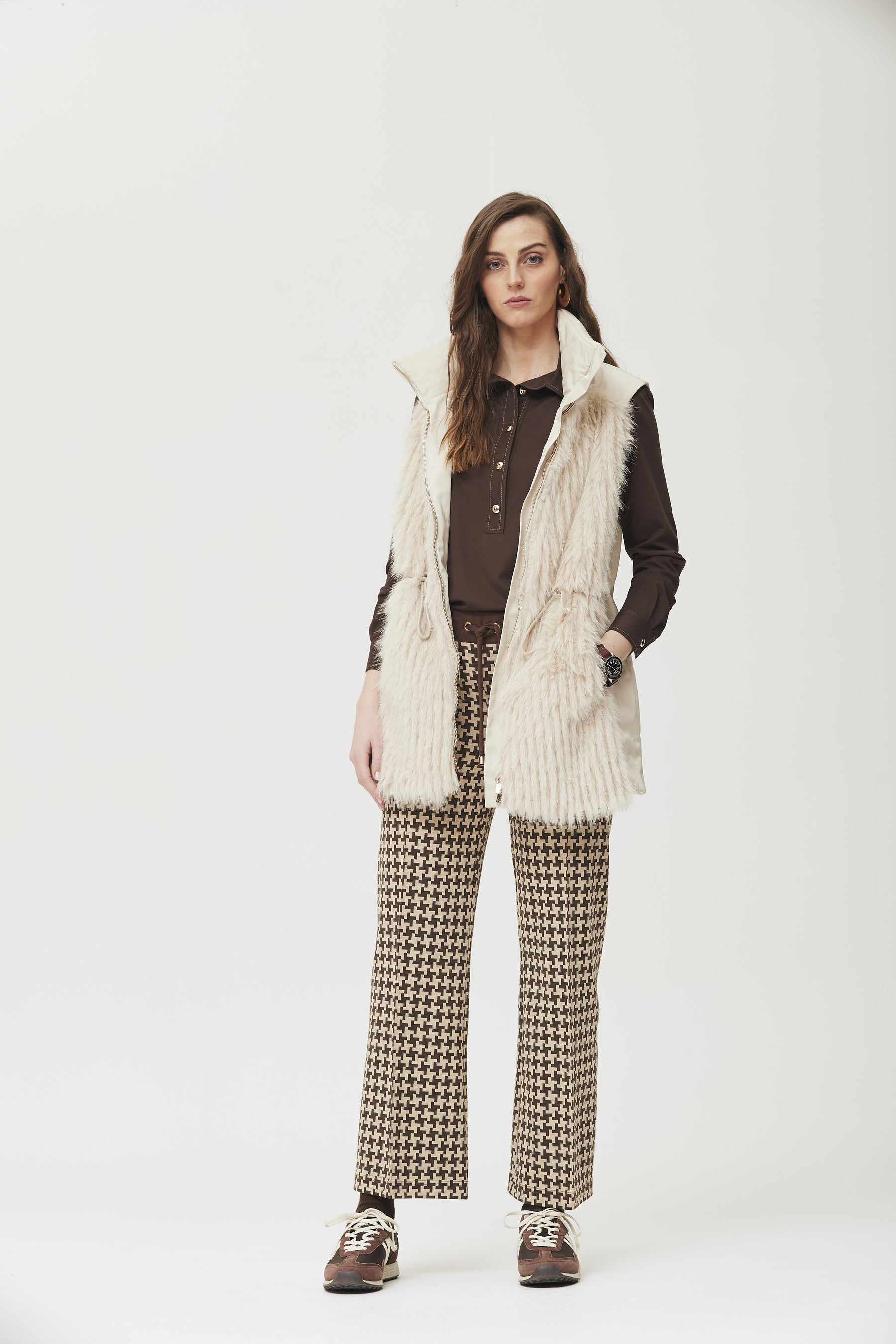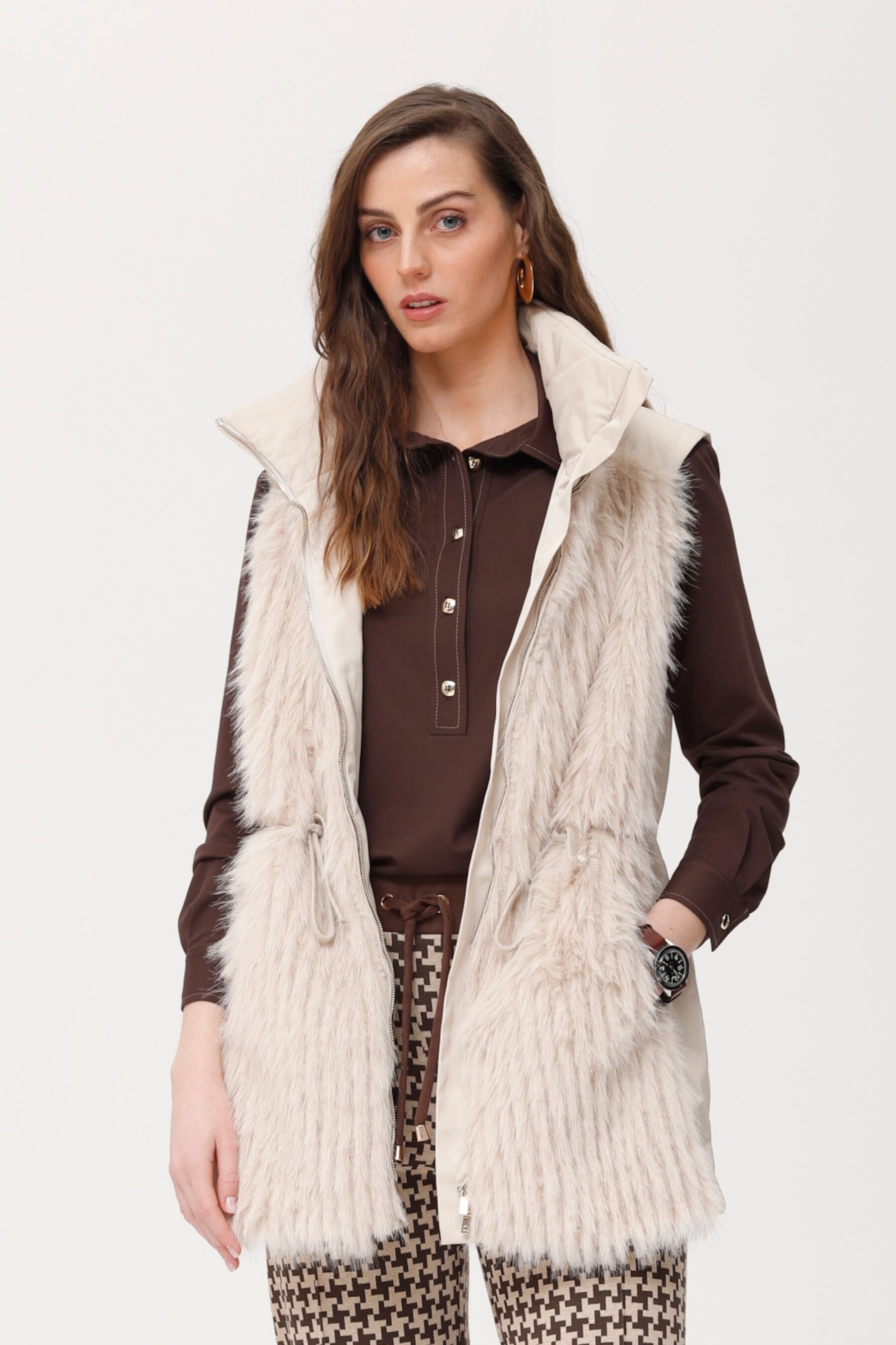 Chaleco acolchado con diseño en tejido técnico en la espalda y delantero realizado en pelo vegano extra suave. incluye bolsillos laterales, cierre con cremallera y ajuste regulable en la cintura. una prenda versátil y abrigada que aporta estilo y comodidad, ideal para combinar con looks casuales y urbanos.