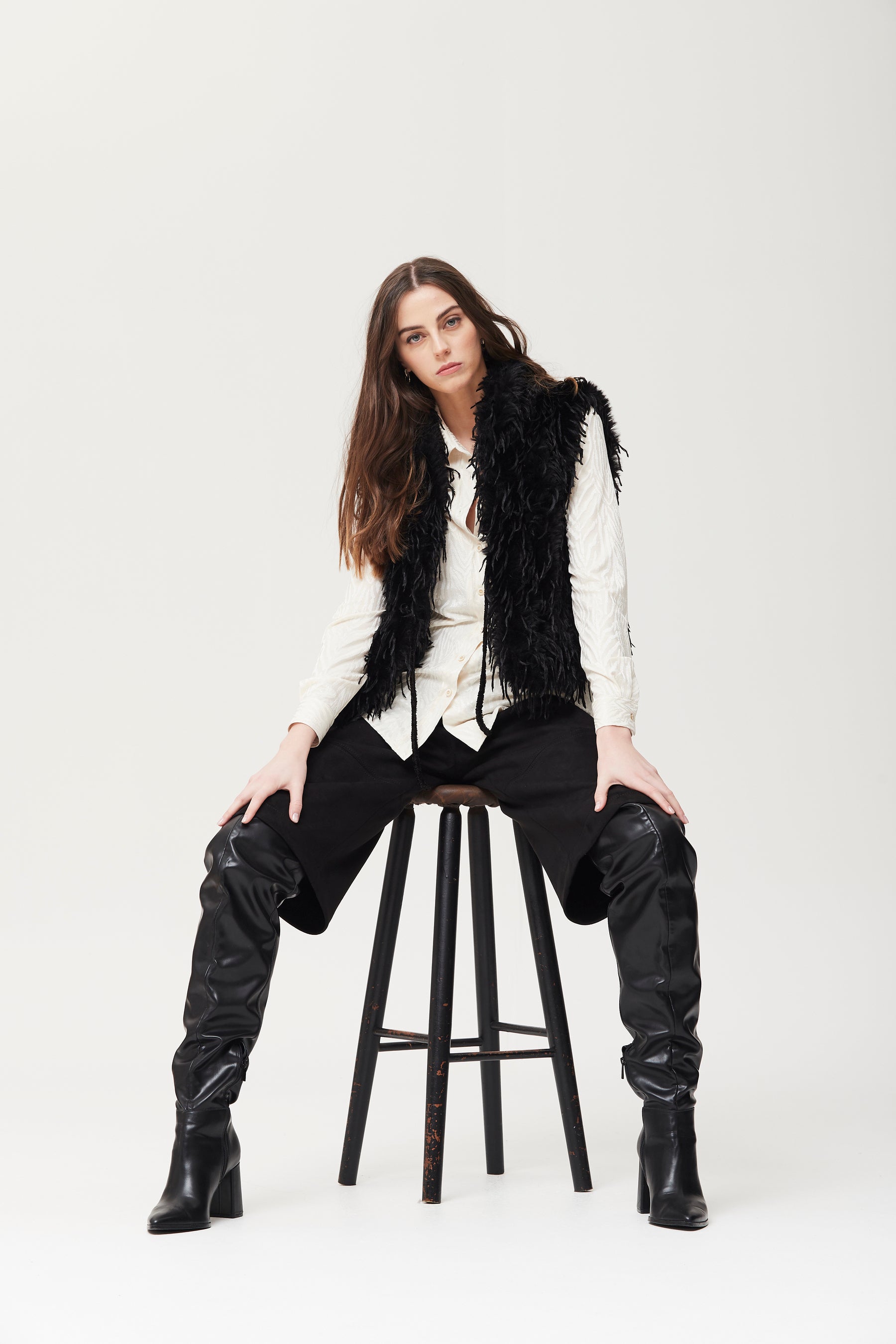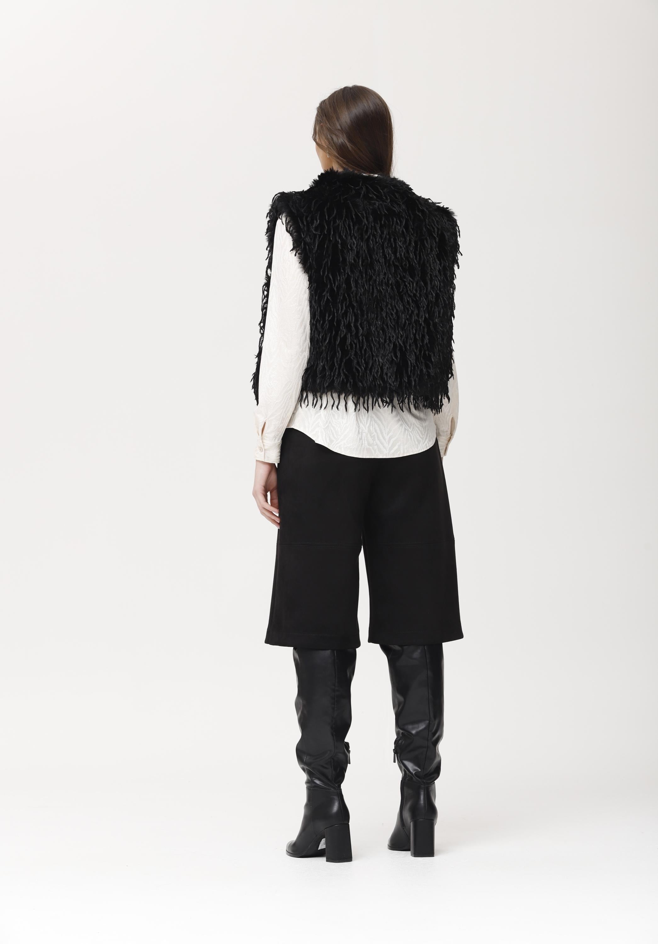 Chaleco corto confeccionado en pelo sintético con efecto pluma en color negro, que ofrece una textura voluminosa, ligera y de gran tendencia. el diseño sin mangas y corte recto lo hace ideal para superponer sobre camisas, blusas o jerséis, aportando un toque glamuroso y actual. ligero y cómodo, es perfecto para transformar tus estilismos tanto de día como de noche, combinándolo con prendas básicas o con conjuntos sofisticados para lograr looks llenos de personalidad.