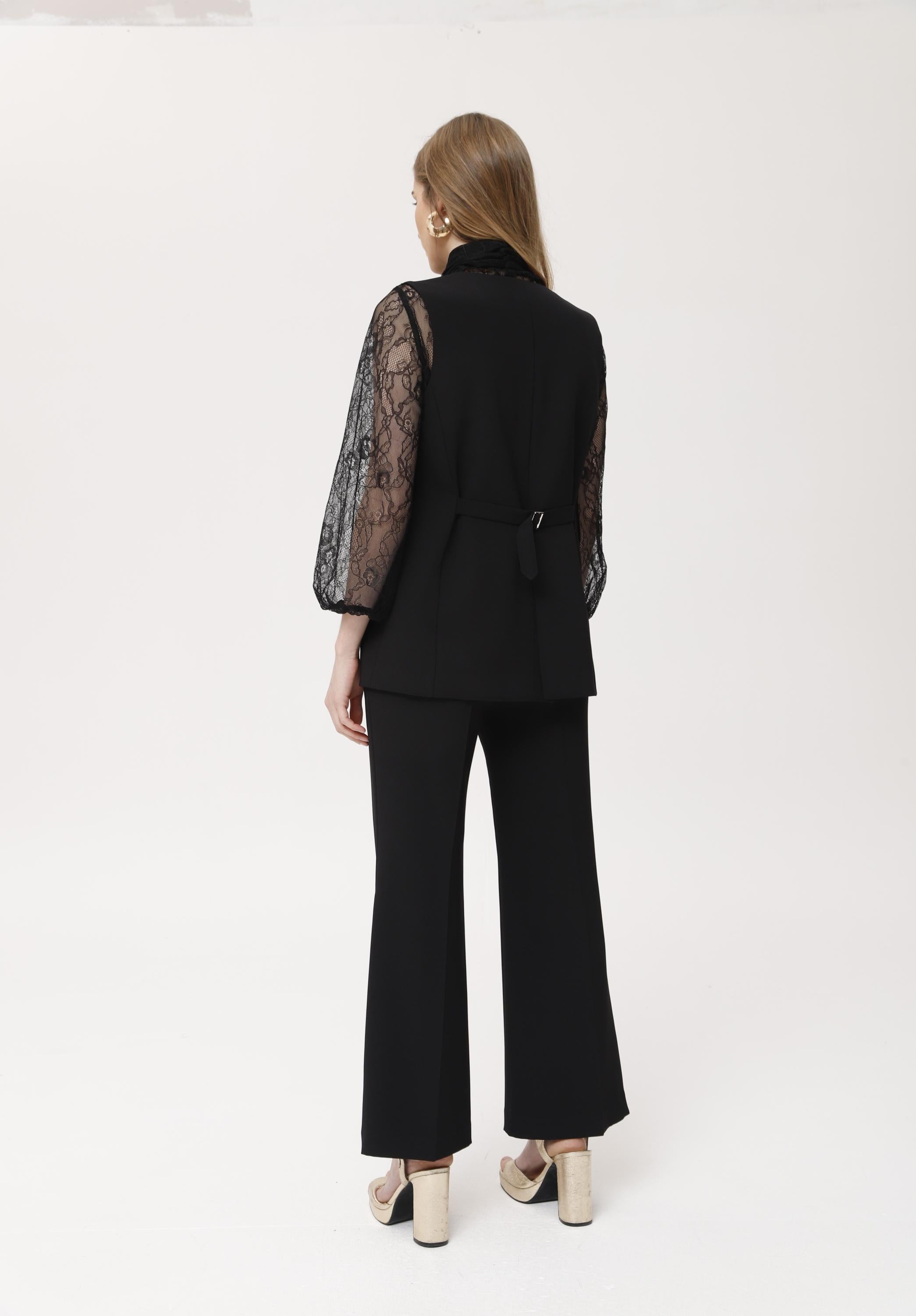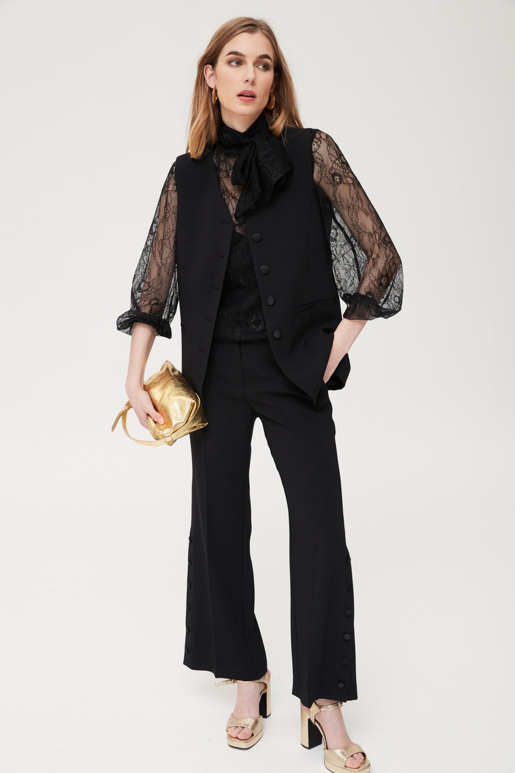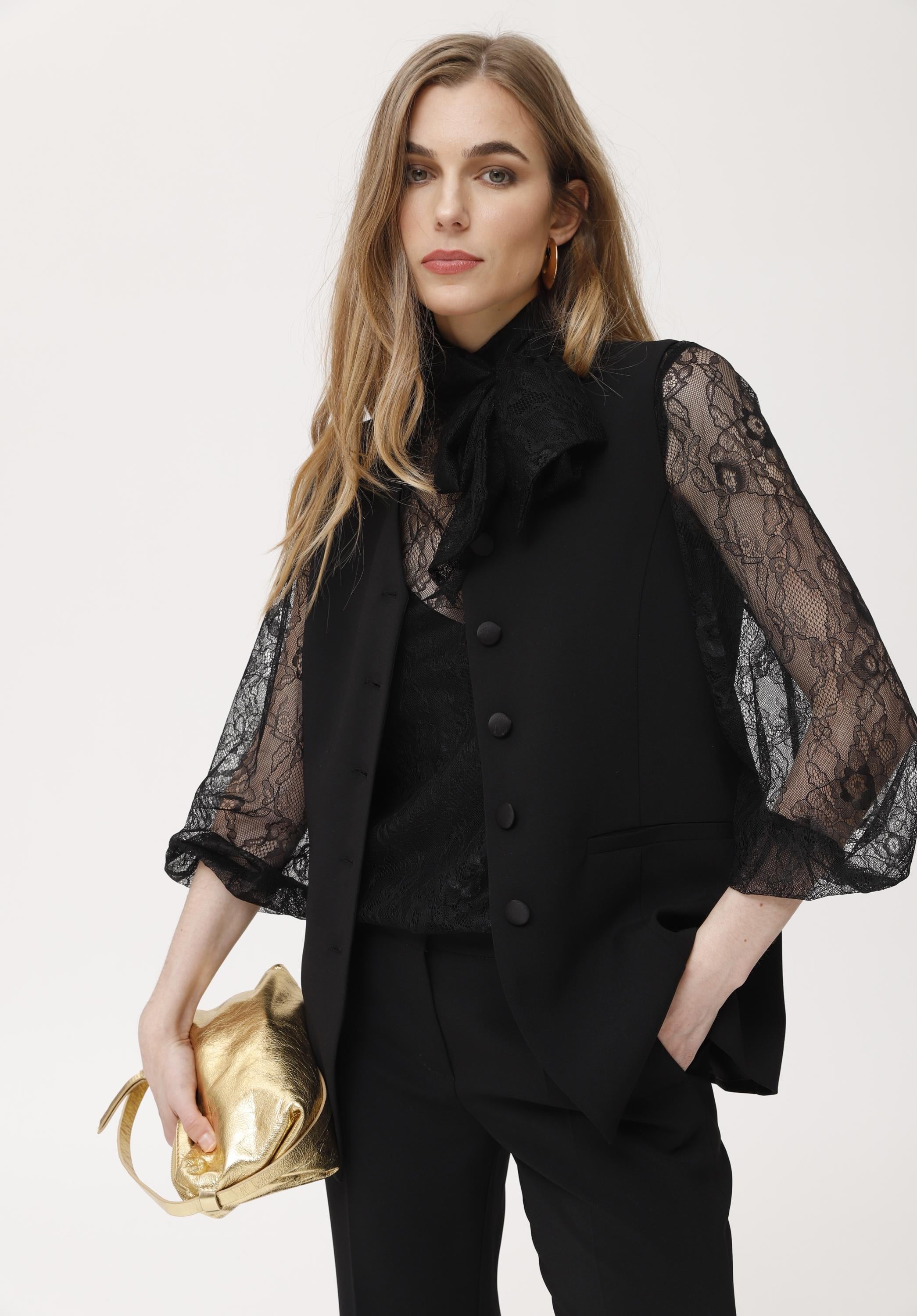 Chaleco sastre confeccionado en raso stretch negro, con diseño recto y cierre frontal de botones forrados. el tejido elástico brinda comodidad y ajuste perfecto, mientras que el acabado satinado aporta sofisticación a cualquier look. perfecto para superponer sobre camisas, blusas de encaje o jerséis finos, creando estilismos urbanos, de oficina o incluso de fiesta. prenda versátil y moderna que completa conjuntos elegantes o de aire masculino.