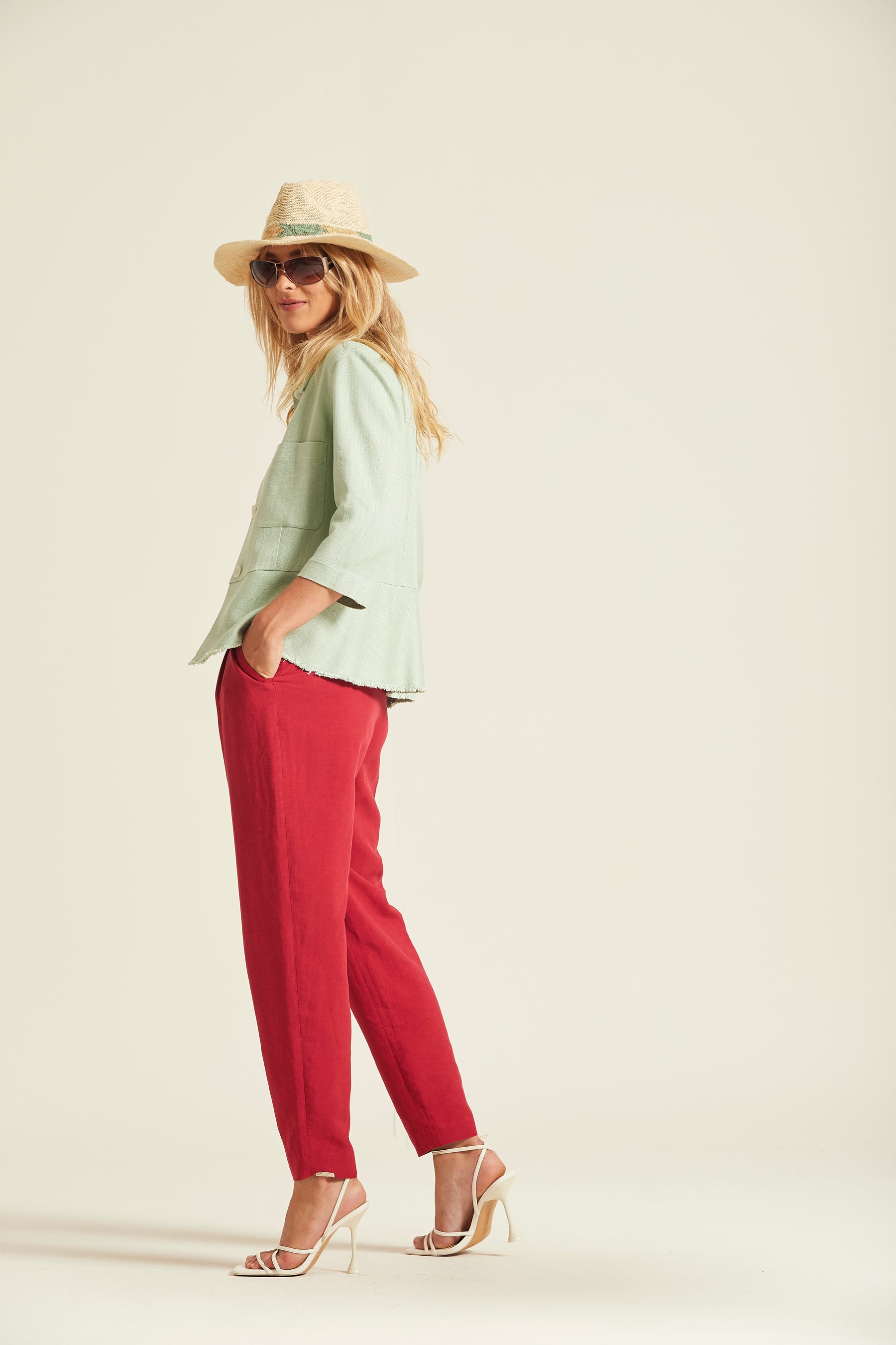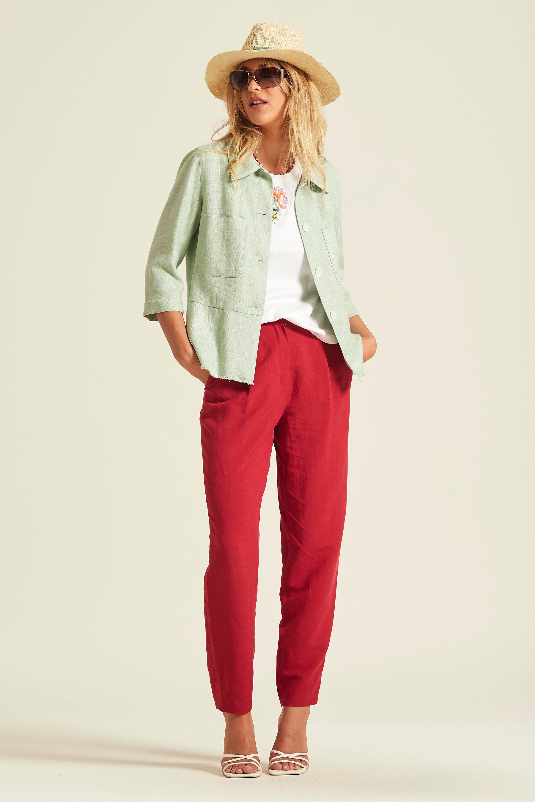Chaqueta de cuello camisero confeccionada en un tejido de lino rústico con textura natural. Presenta un diseño estructurado con un corte horizontal en la cintura que define la silueta y bolsillos de plastrón frontales. Detalles de costuras vistas, cierre de botones a tono y manga francesa.
