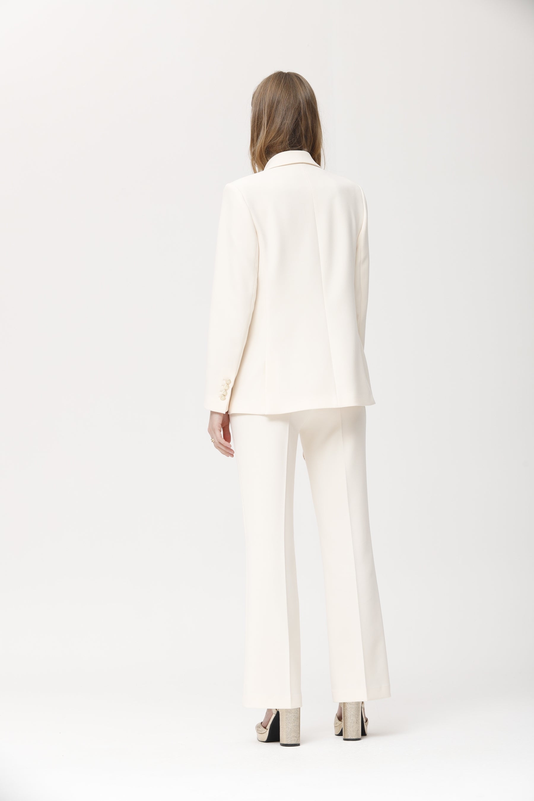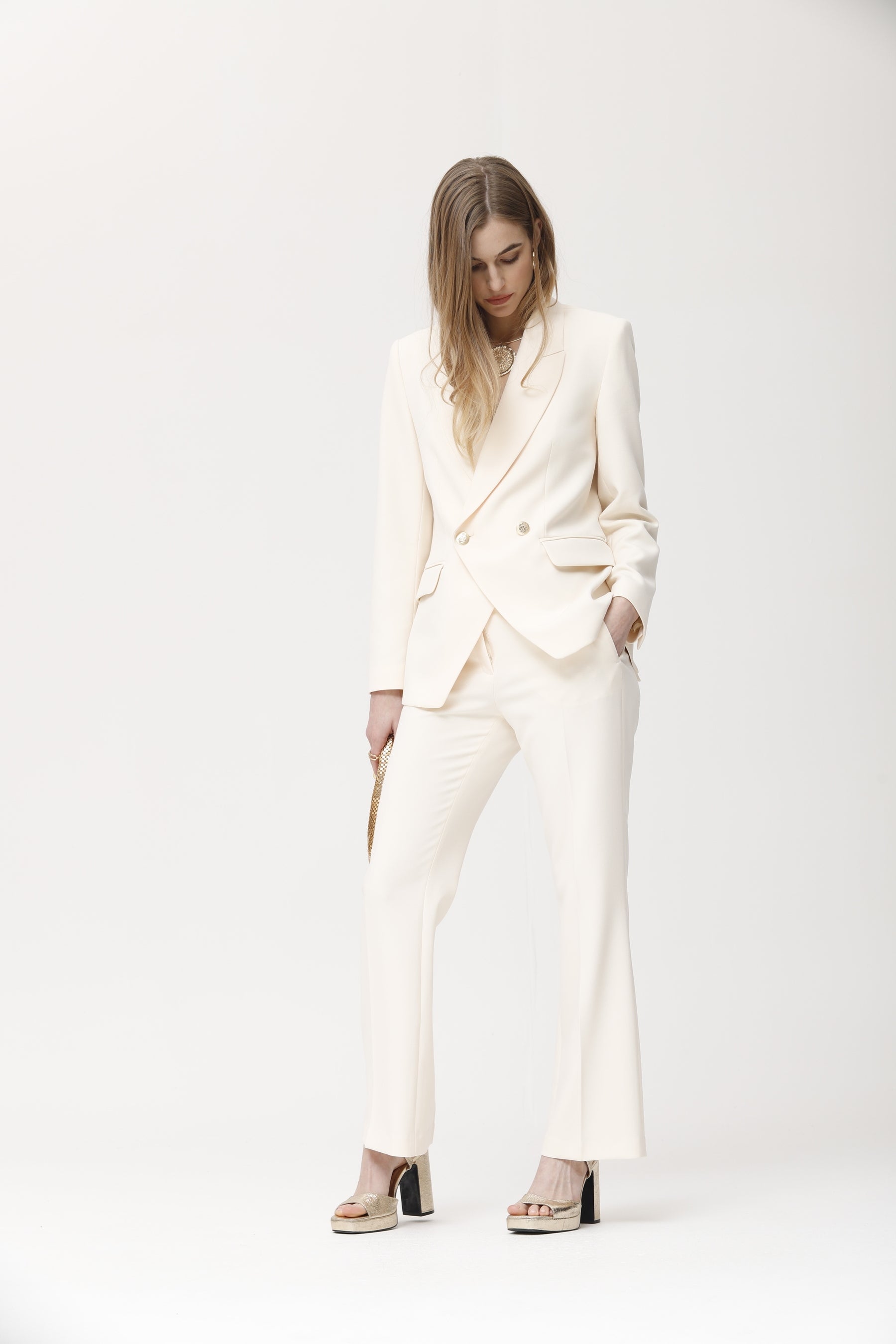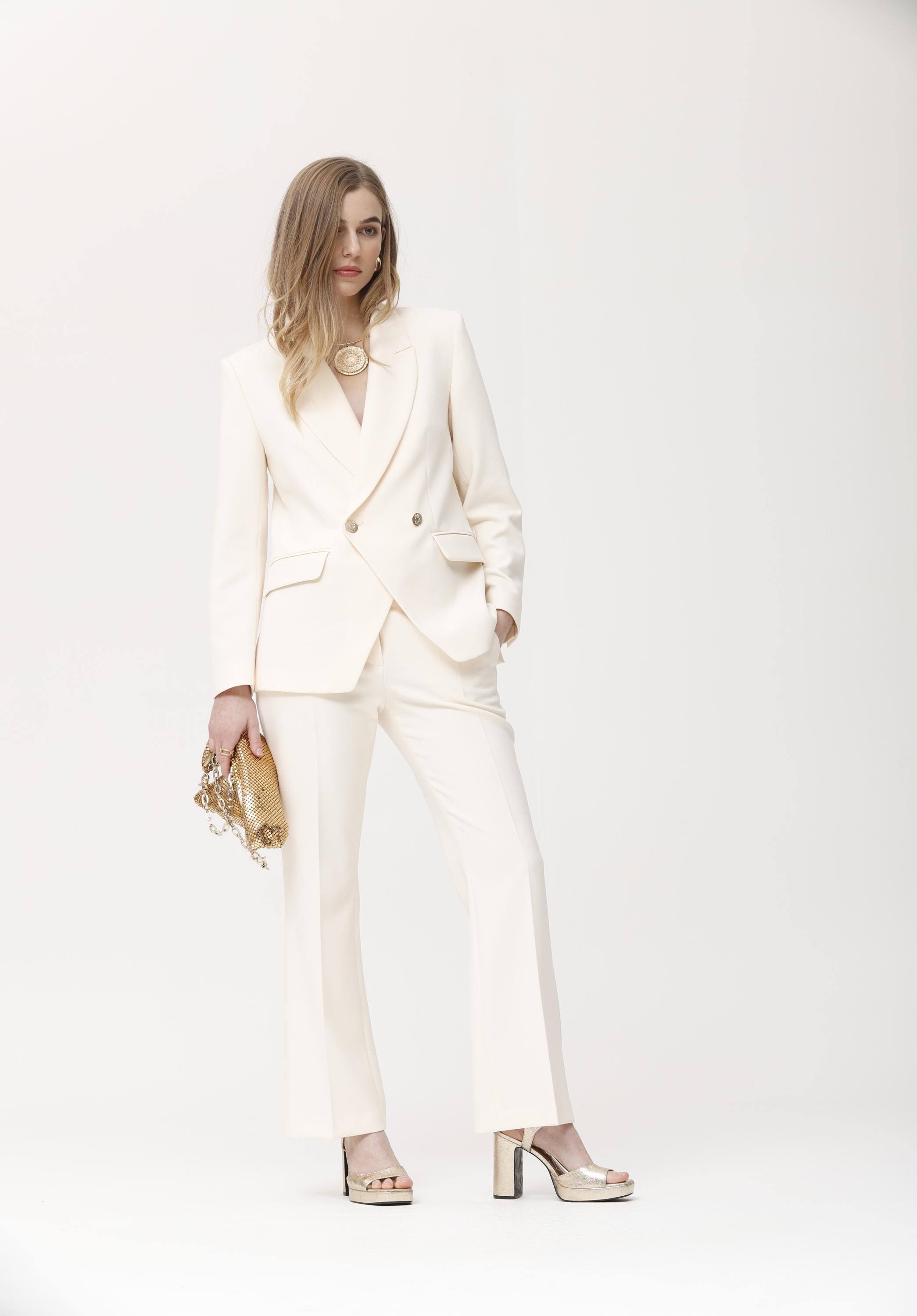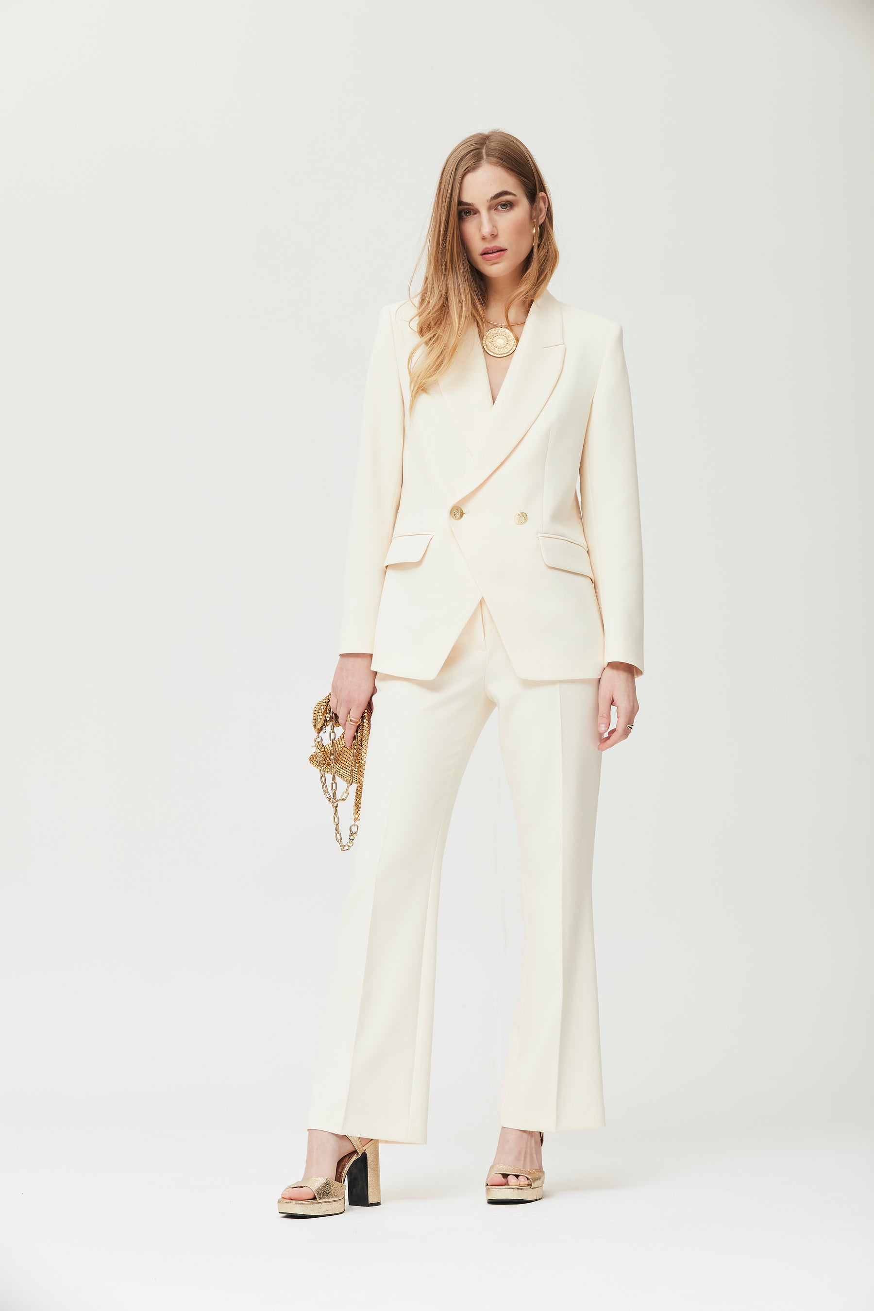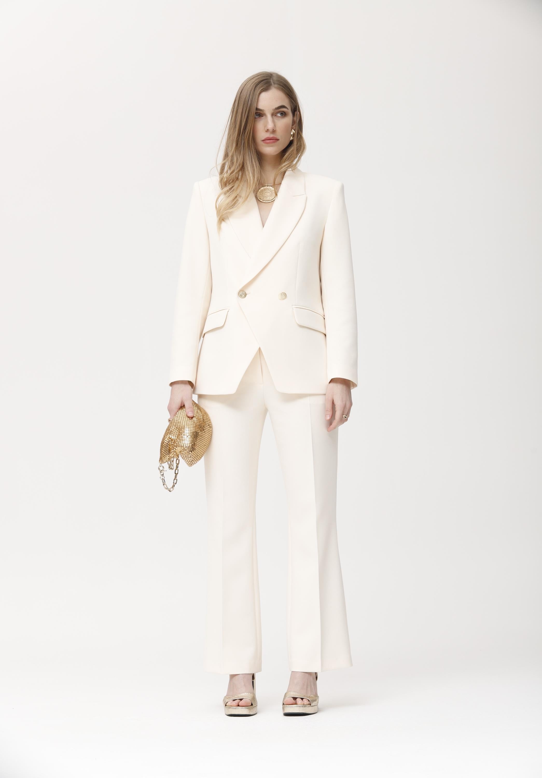 Chaqueta tipo americana de doble botonadura en un elegante tono crema. confeccionada con un corte estructurado y hombros marcados, cuenta con solapas clásicas y botones dorados que realzan su diseño sofisticado. ideal para eventos formales o para elevar un look diario.