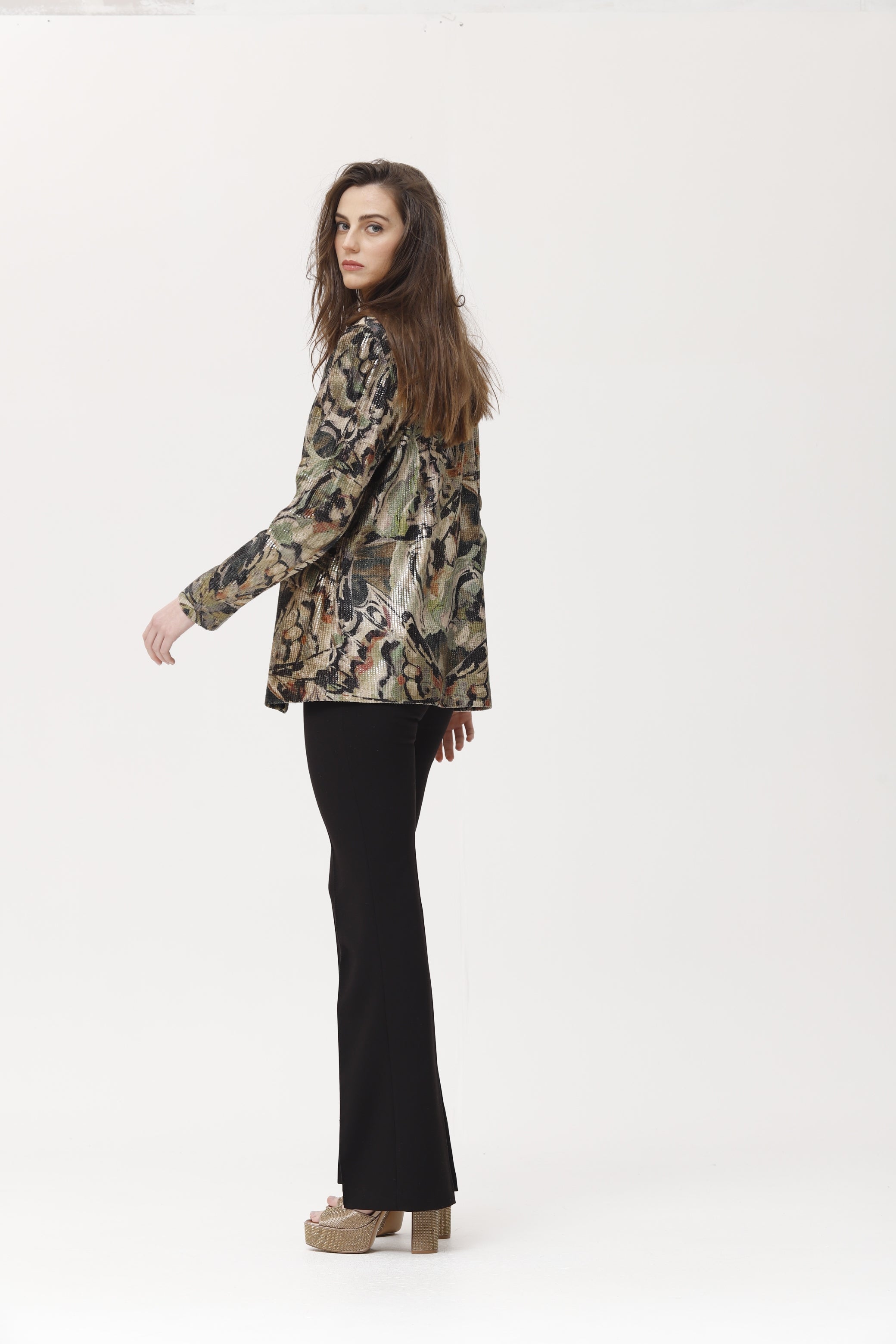 Chaqueta larga de terciopelo con estampado abstracto en tonos verdes, dorados y marrones, decorada con lentejuelas que aportan luminosidad sutil. presenta corte relajado, solapas y bolsillos de parche, y está confeccionada en tejido suave de gran confort. el efecto tornasolado y los brillos la hacen ideal para elevar looks básicos o combinar en eventos y ocasiones especiales. una pieza sofisticada y versátil que añade personalidad con su diseño artístico.