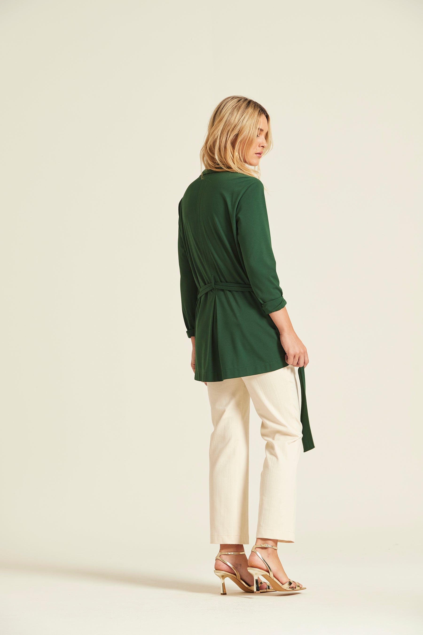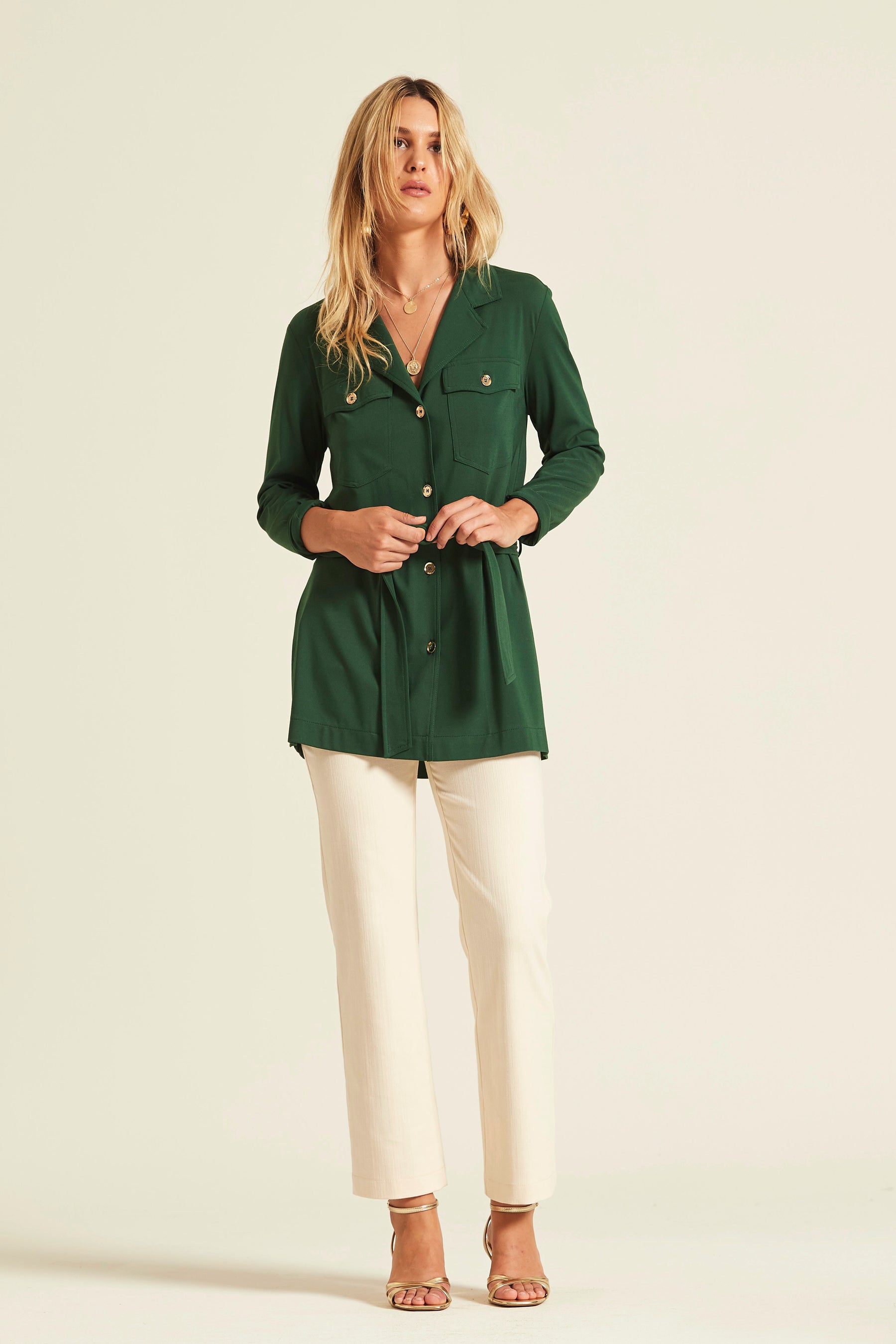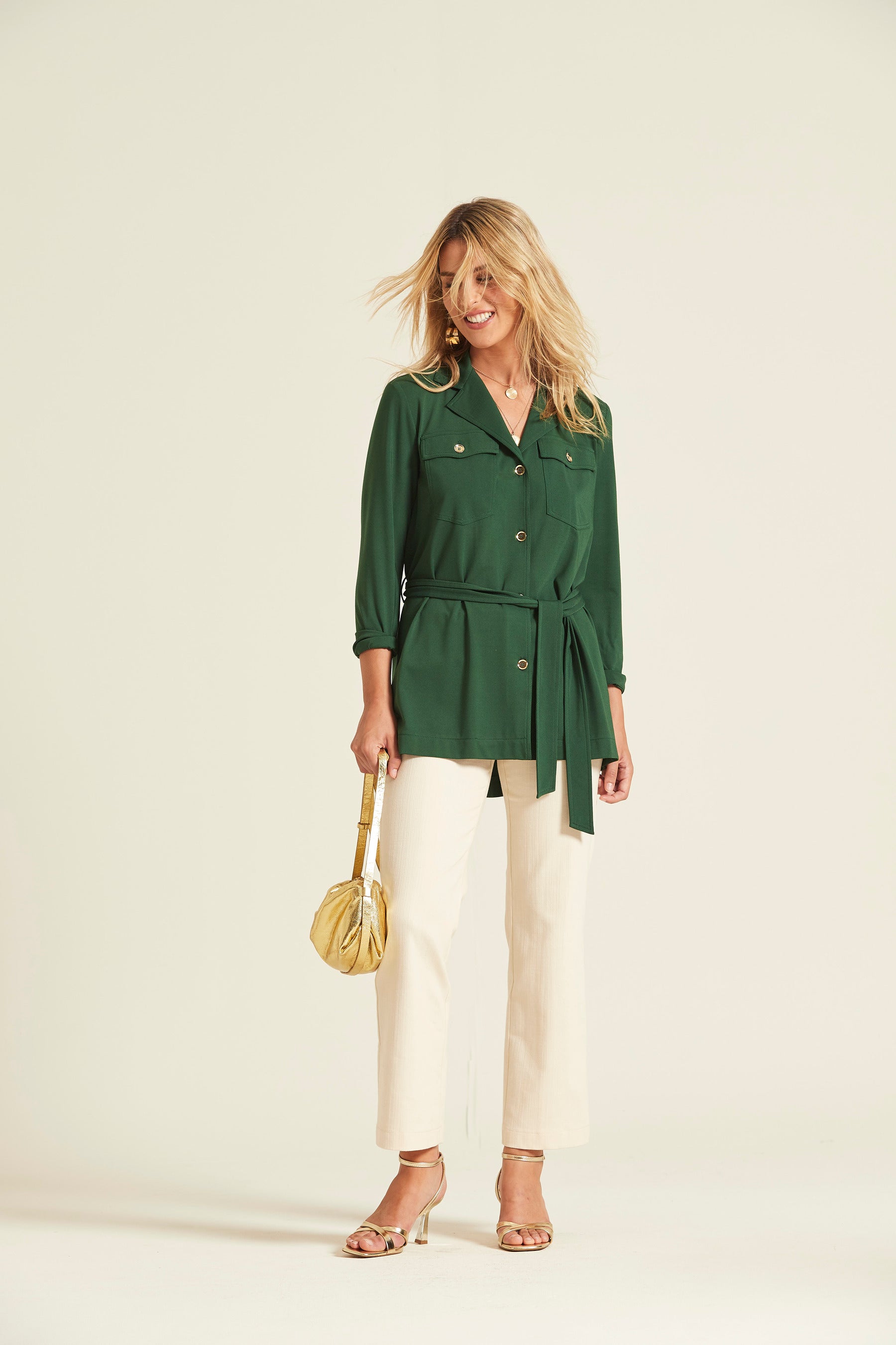 Chaqueta de silueta fluida confeccionada en punto roma ligero de color verde bosque. Presenta un diseño de inspiración utilitaria con cuello de solapa, cuatro bolsillos frontales de plastrón con botones dorados y un cinturón del mismo tejido para entallar la figura.