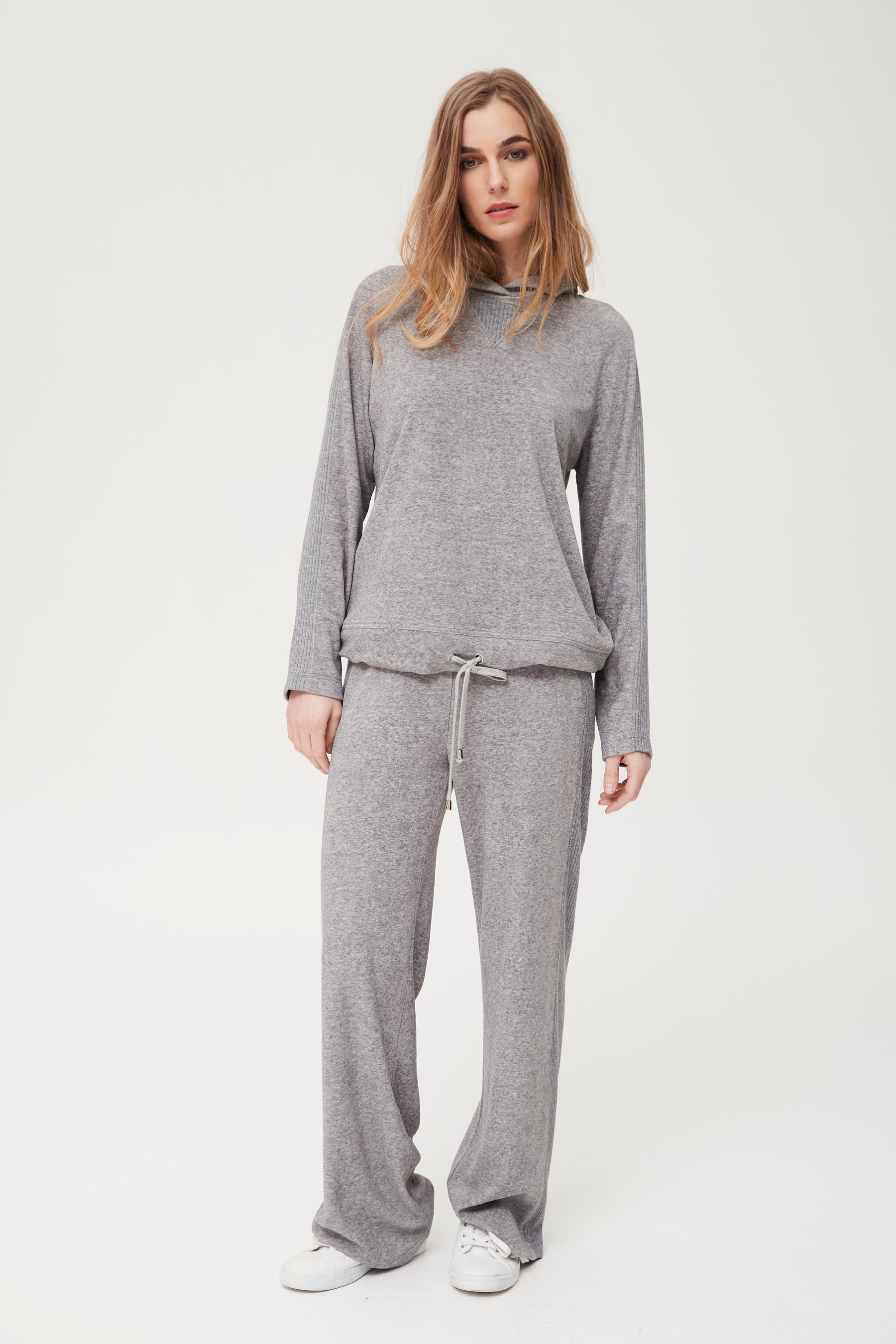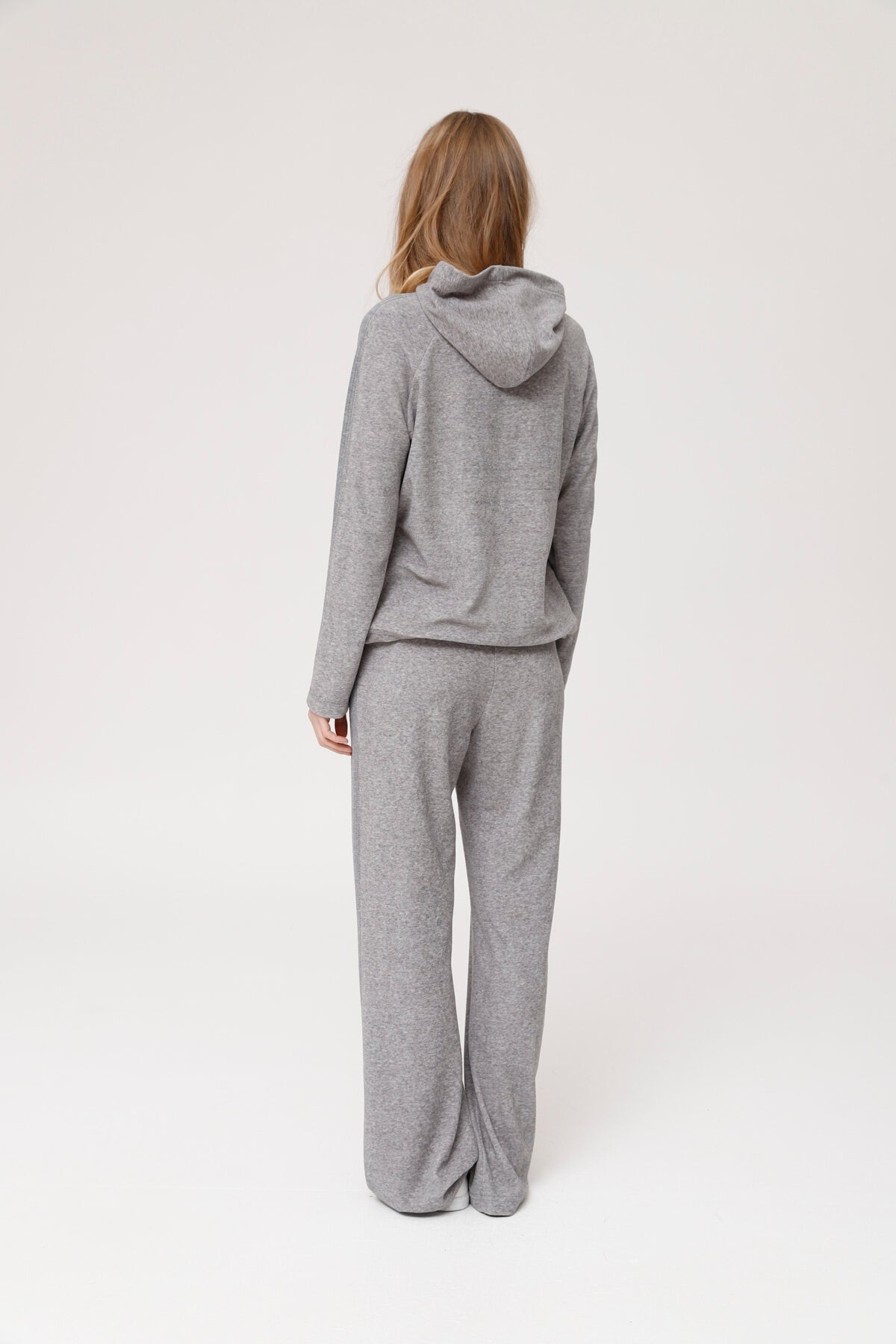 Top de punto gris jaspeado, con ccapucha y manga larga. incorpora detalles acanalados en los hombros, cuello y mangas para un toque moderno y confortable. su silueta relajada y el suave tejido hacen de este top una prenda ideal para looks casuales y cómodos en cualquier momento del día.