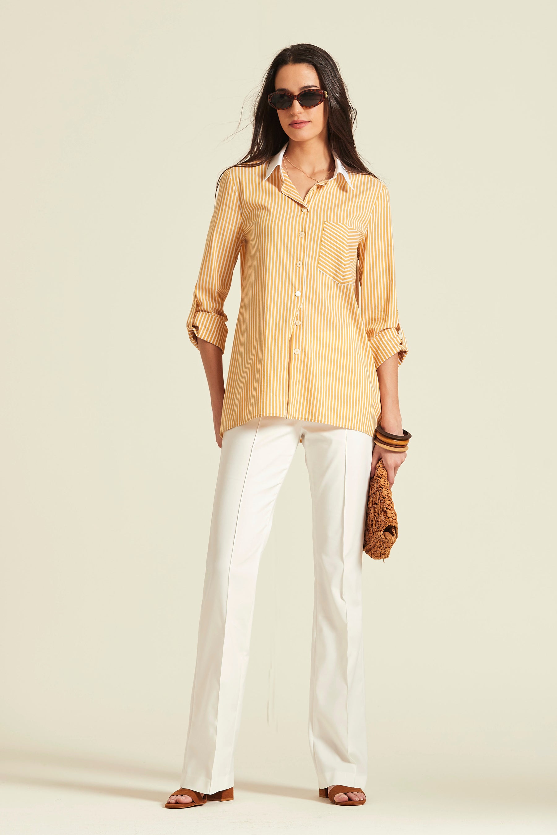 Pantalón confeccionado en algodón elástico de alta calidad que ofrece un ajuste impecable y máximo confort. Su diseño destaca por una silueta limpia sin bolsillos, tiro medio y una pernera ligeramente acampanada. Cuenta con un cierre frontal de cremallera, potenciando su estética minimalista y depurada.